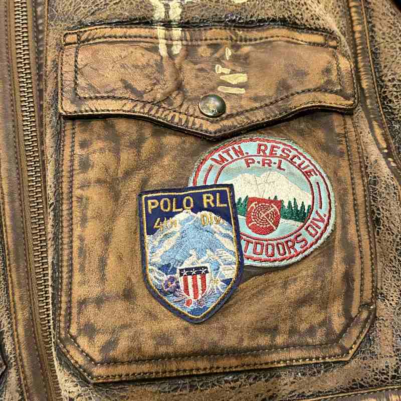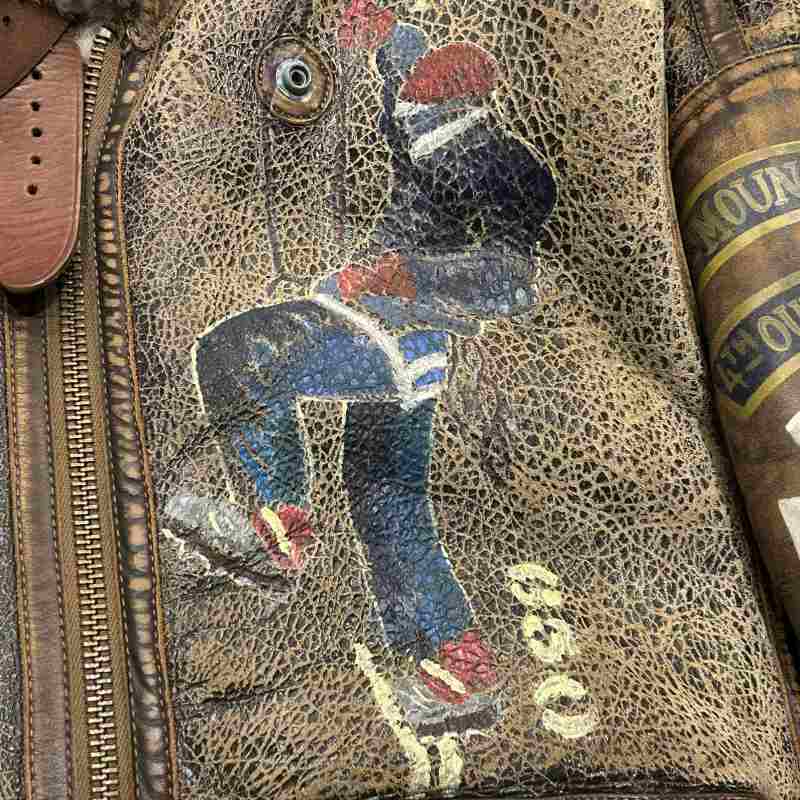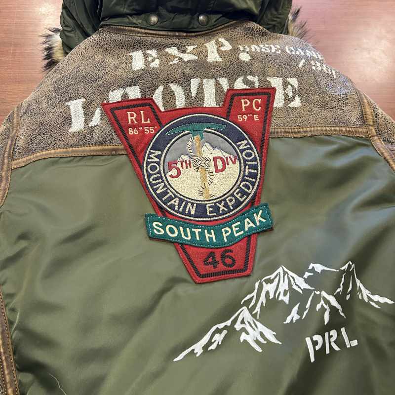 - B-3ボンバージャケットをベースにレザーとナイロンが組み合わせ、山岳救助隊のワッペンやハンドペイントのモチーフが施されたスペシャルなジャケットです。