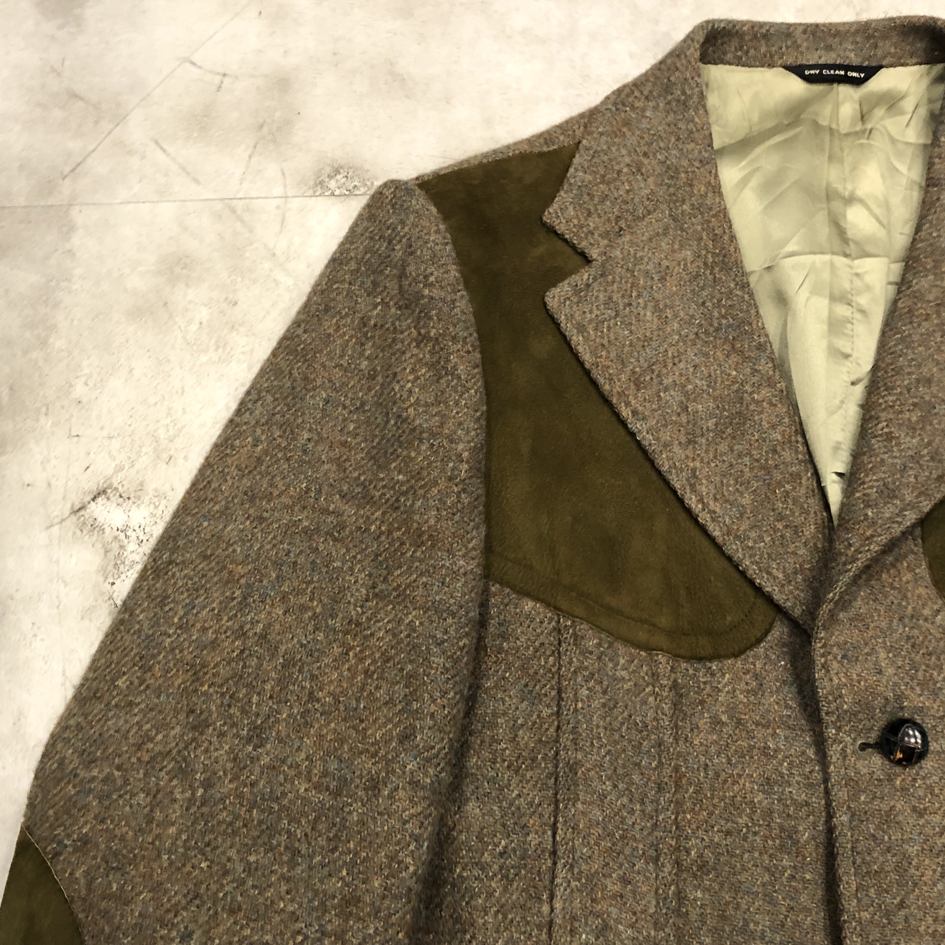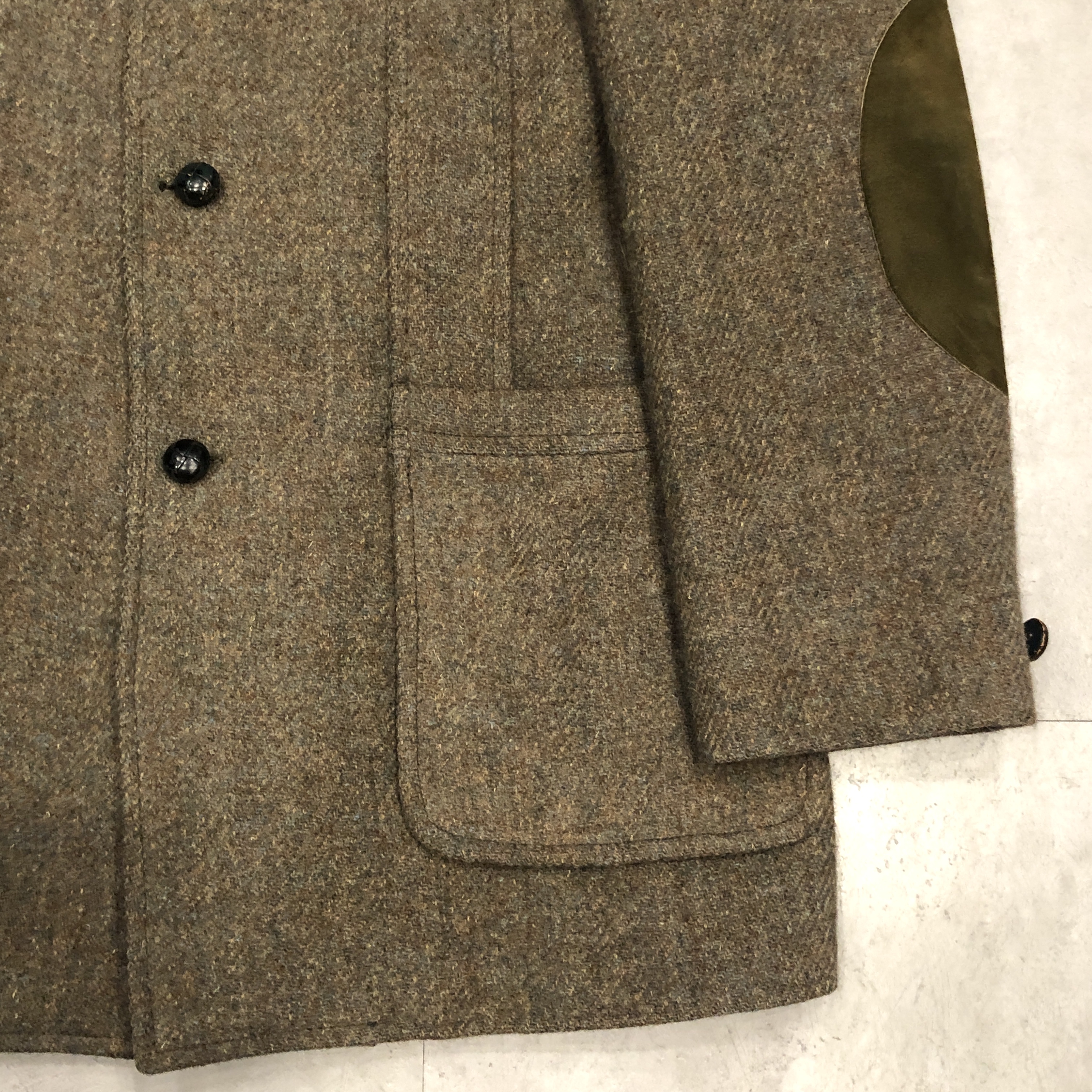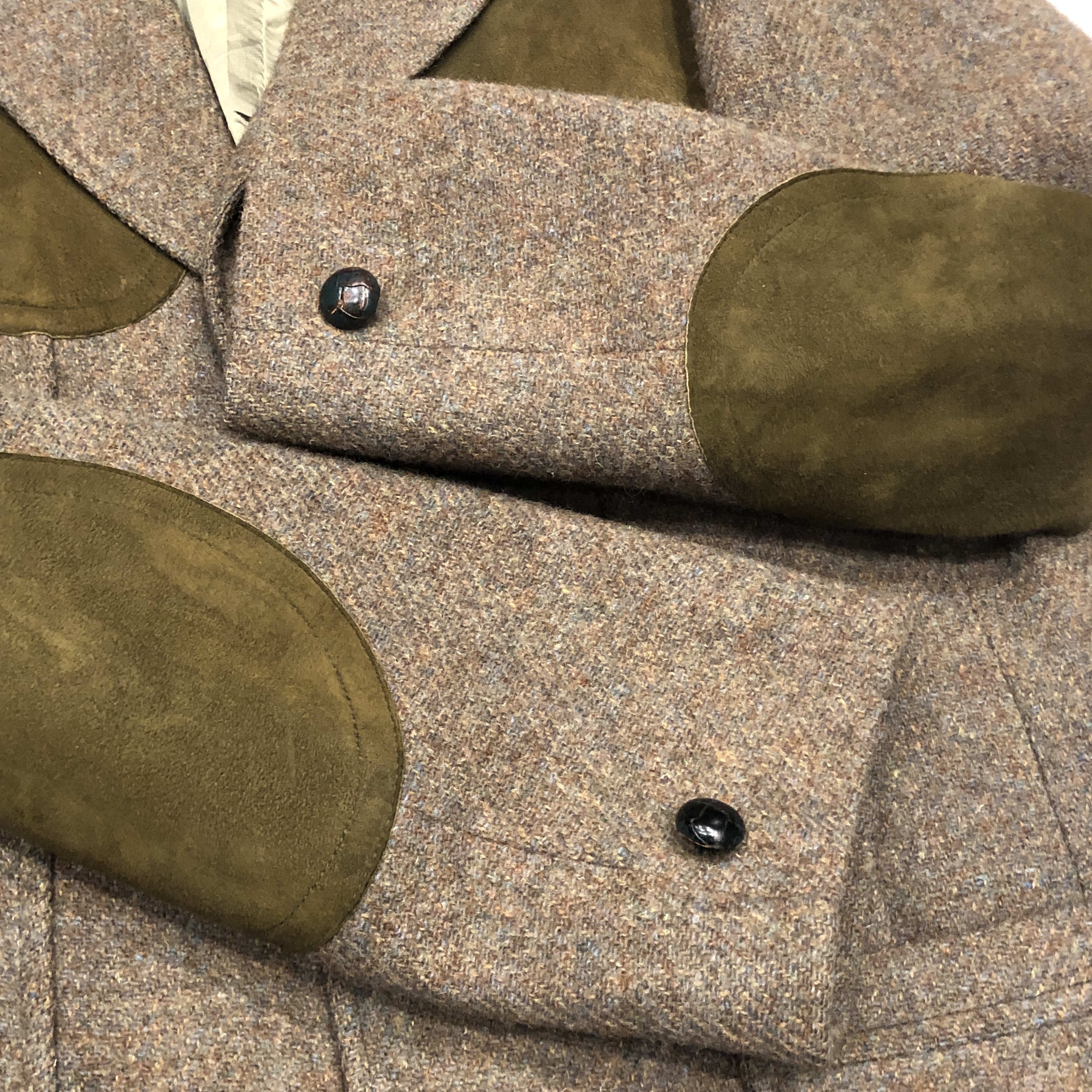 生地にはもちろん、あのHarris Tweed 認証の 100% VIRGIN WOOL。外さないブラウンミックスの格子調ツイードは、アウトドアテーラードらしい素朴さと上品さを併せもち、肩ヨーク・エルボーパッチ・ガンパッチ部分にはスウェードを贅沢に切り替えた名ディテール。