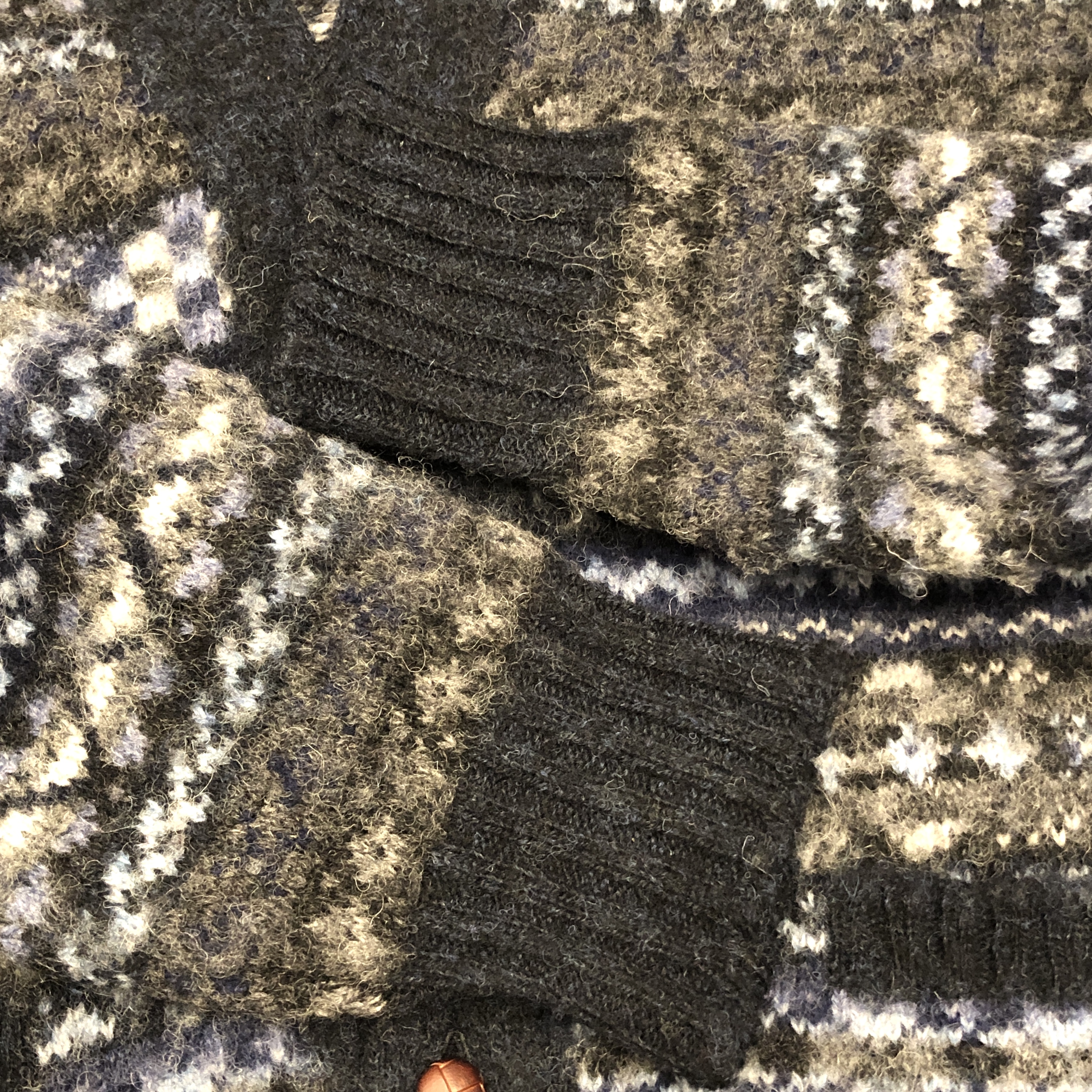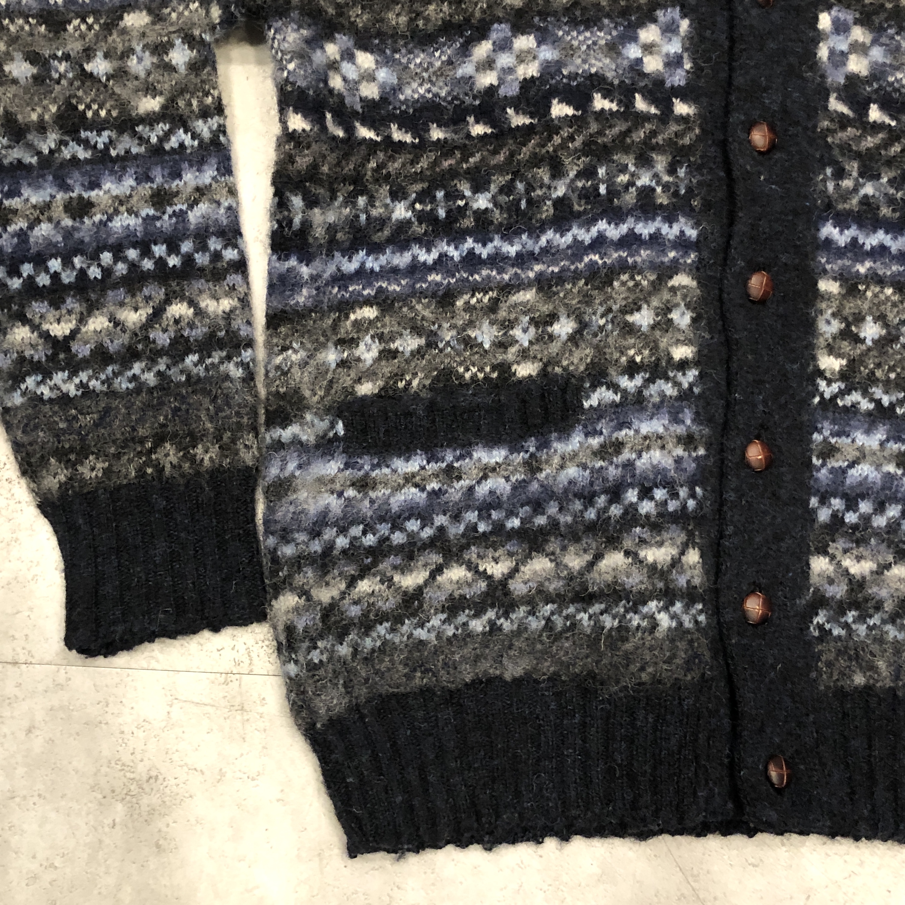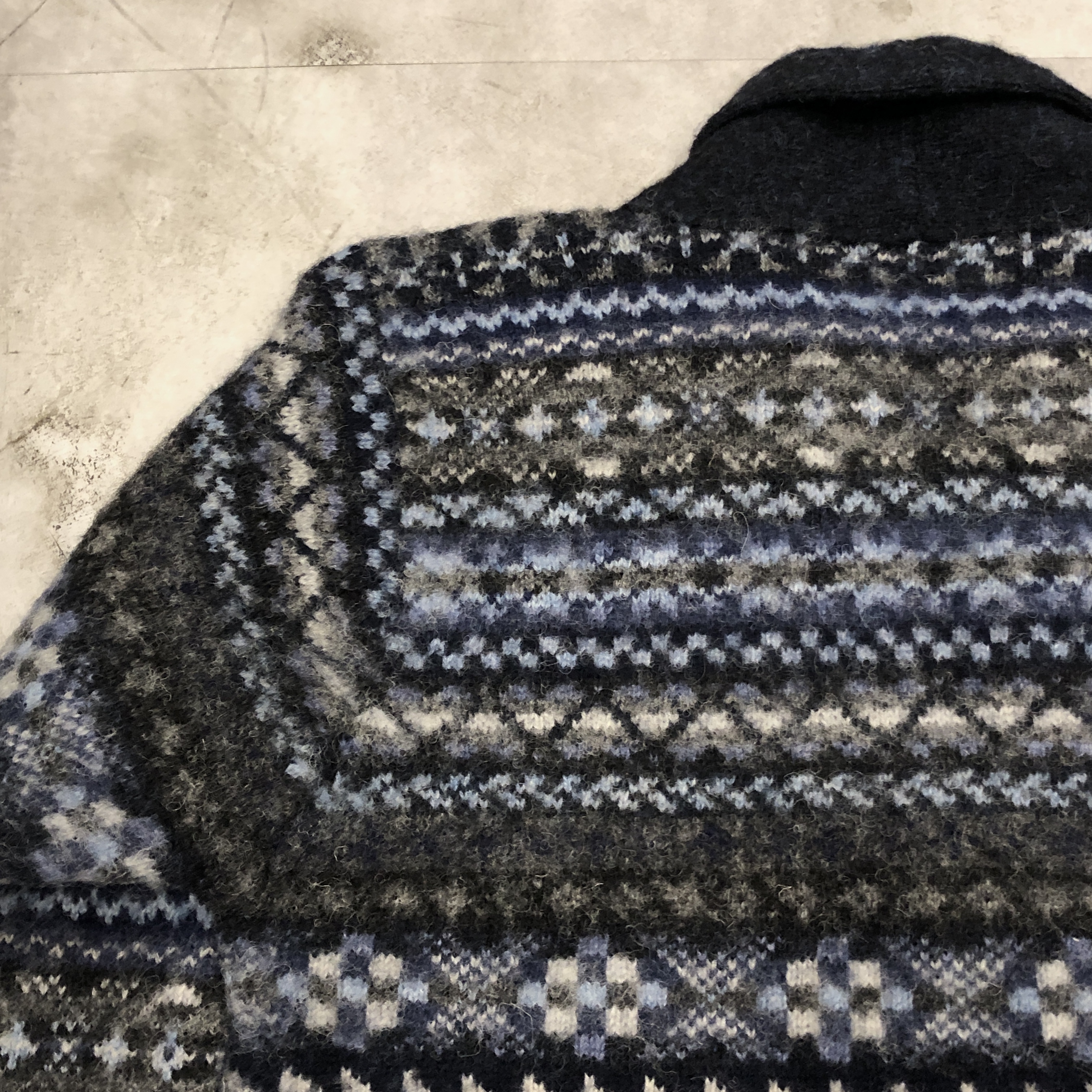 今回の一着は、ネイビー × グレーを基調にしたフェアアイル柄が全体に美しく配され、非常に落ち着いたトーンながら、奥行きある表情を持った逸品。ショールカラーの柔らかな曲線と、クルミボタンの温かみが相まって、クラシックな佇まいの中にどこか上品な気品を感じさせます。