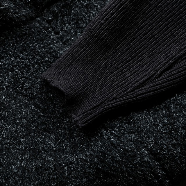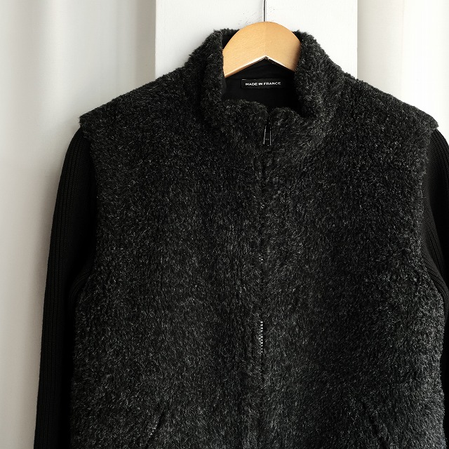 フェイクファーのベストにドライバーズニットの袖がドッキングしたディテールで、数あるブランドの中でもなかなか見かけないですね。