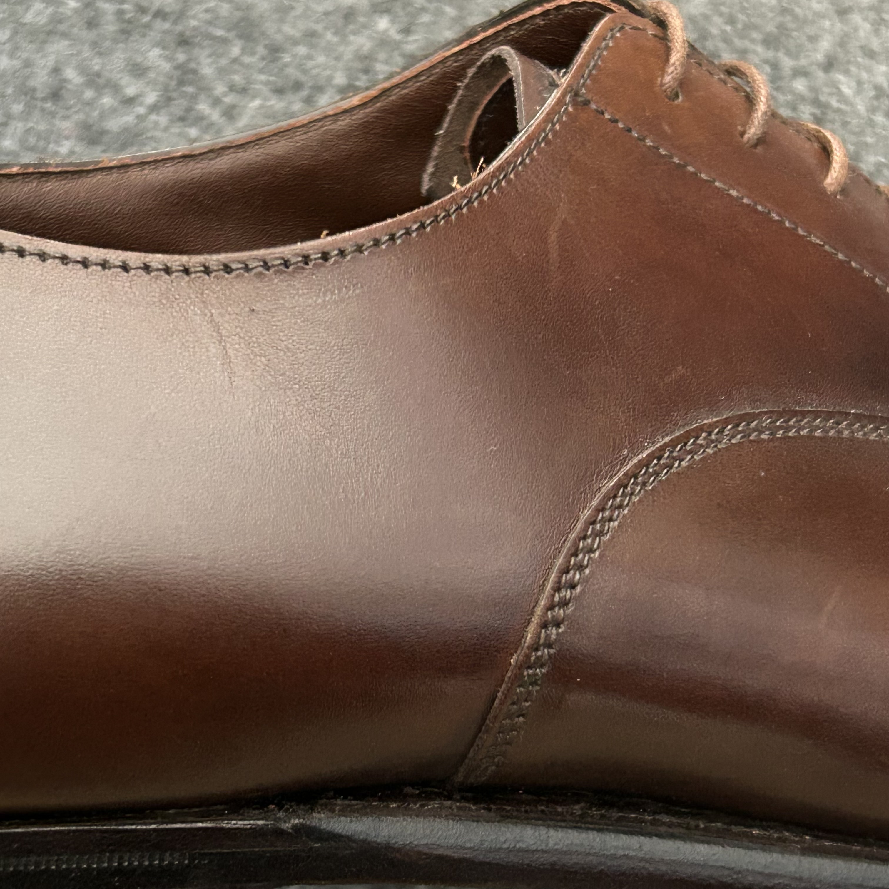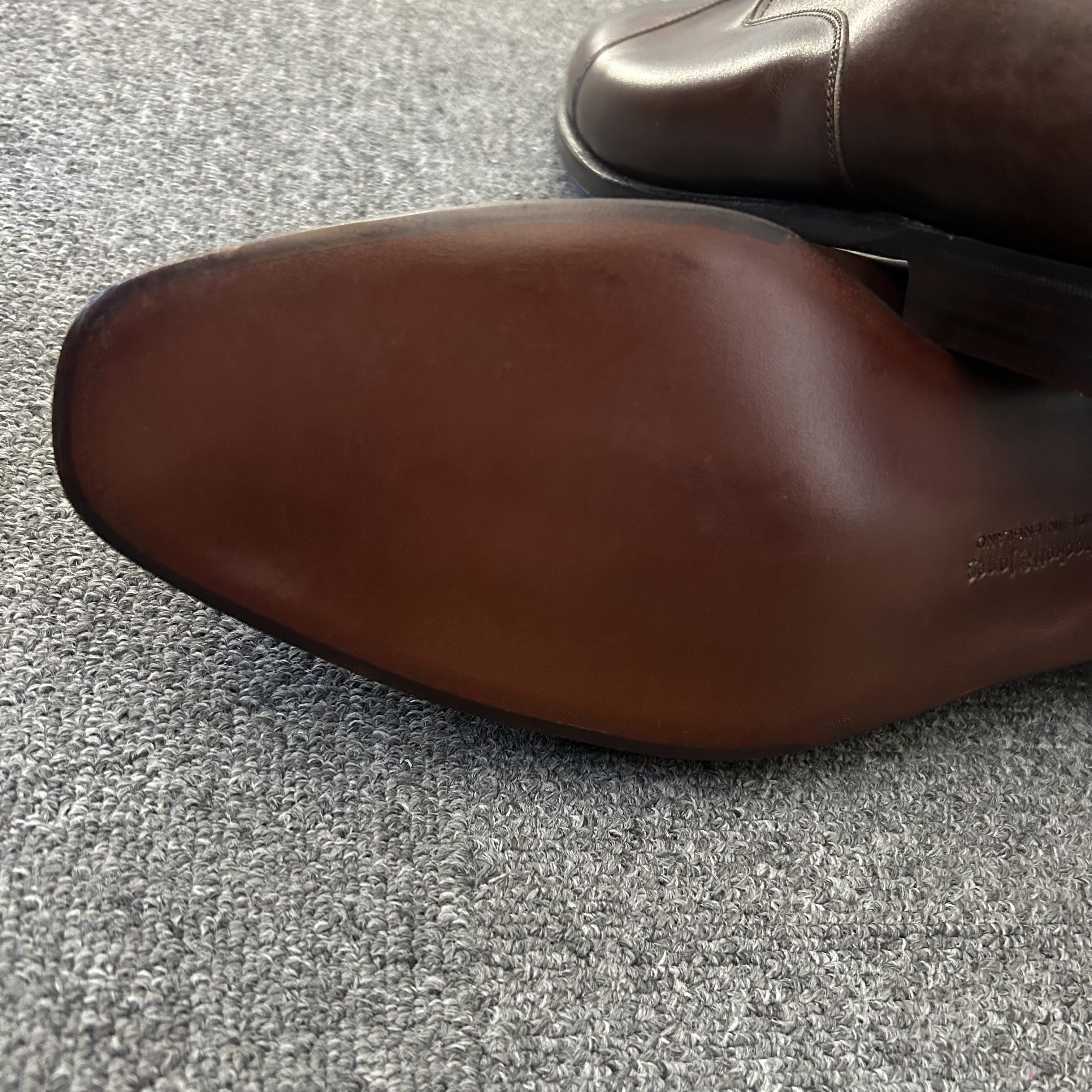 試着による履きシワ、保管時のスレや小傷が目立ちます。