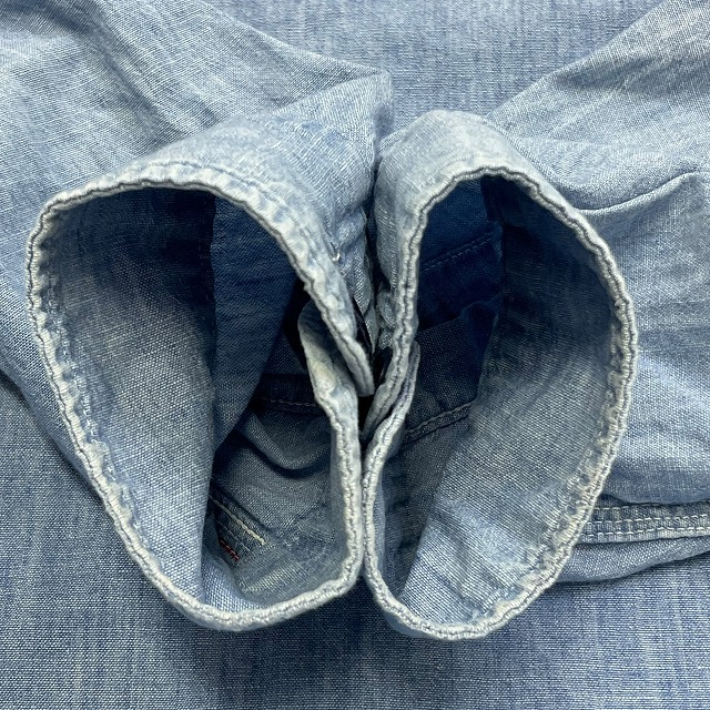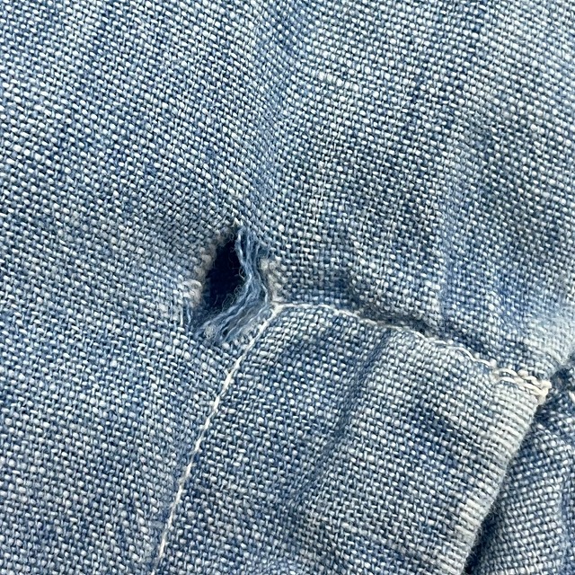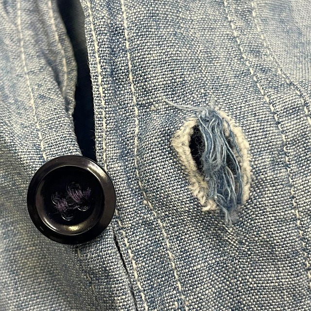 左袖の開き付近に破れがあり、ボタンホールにホツレがございます。