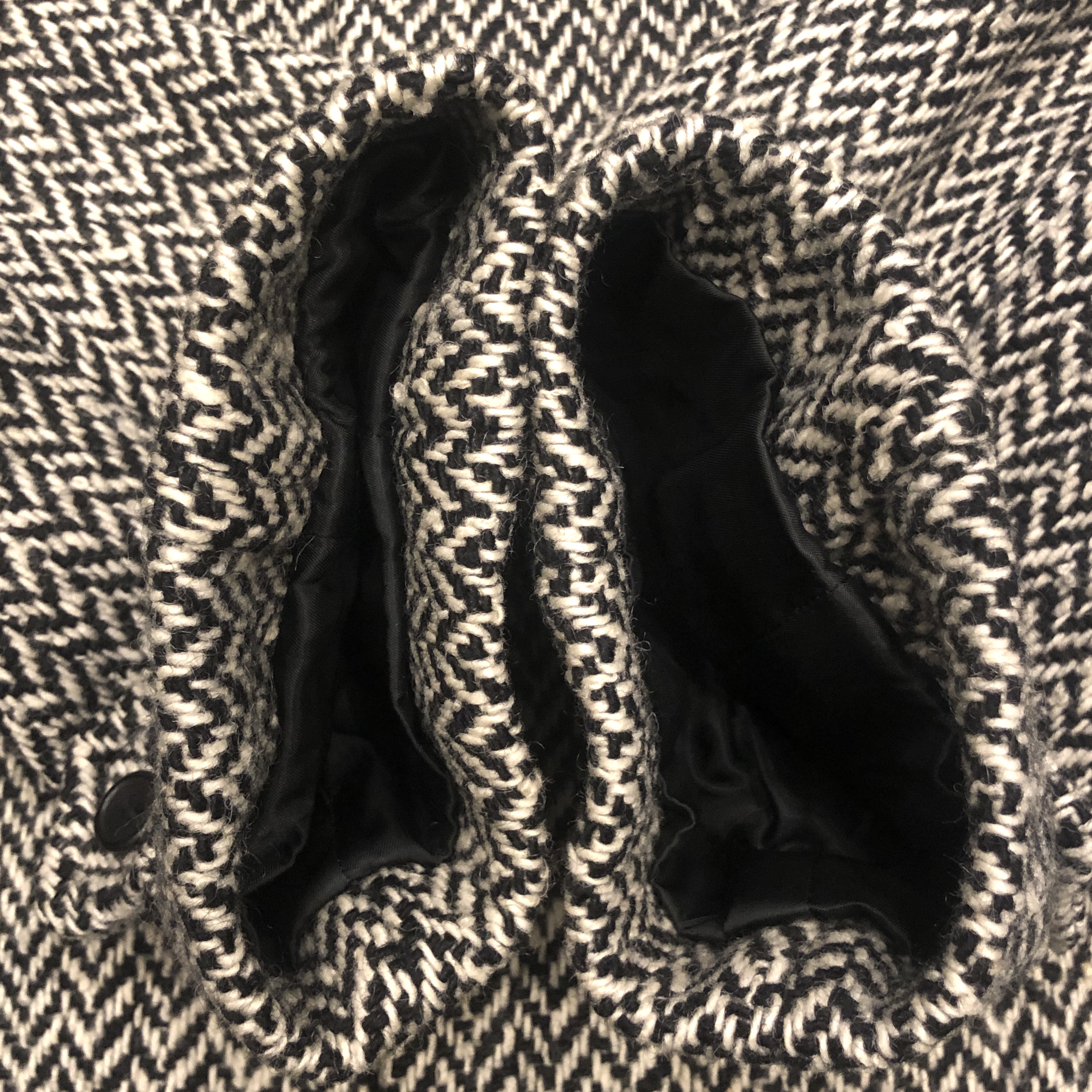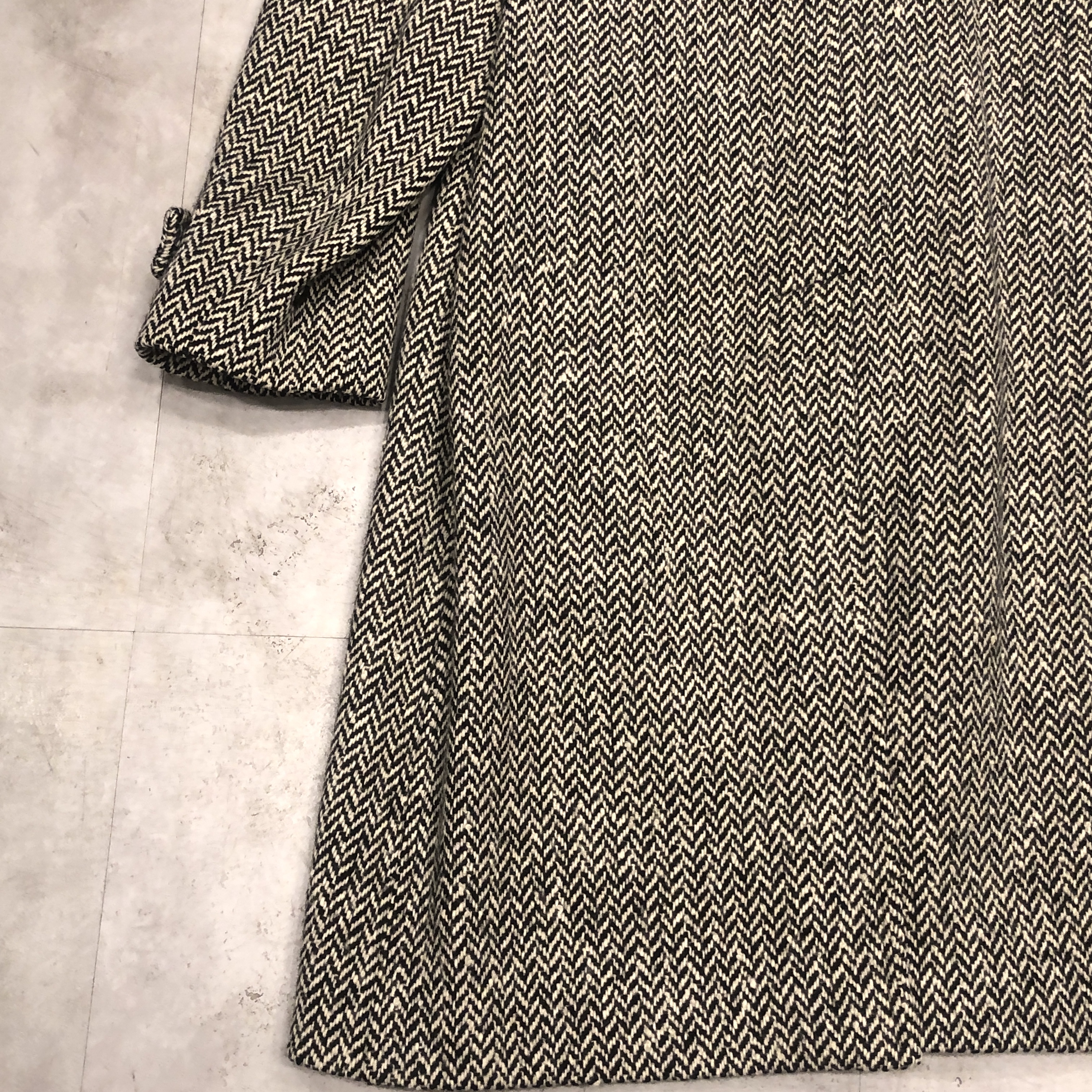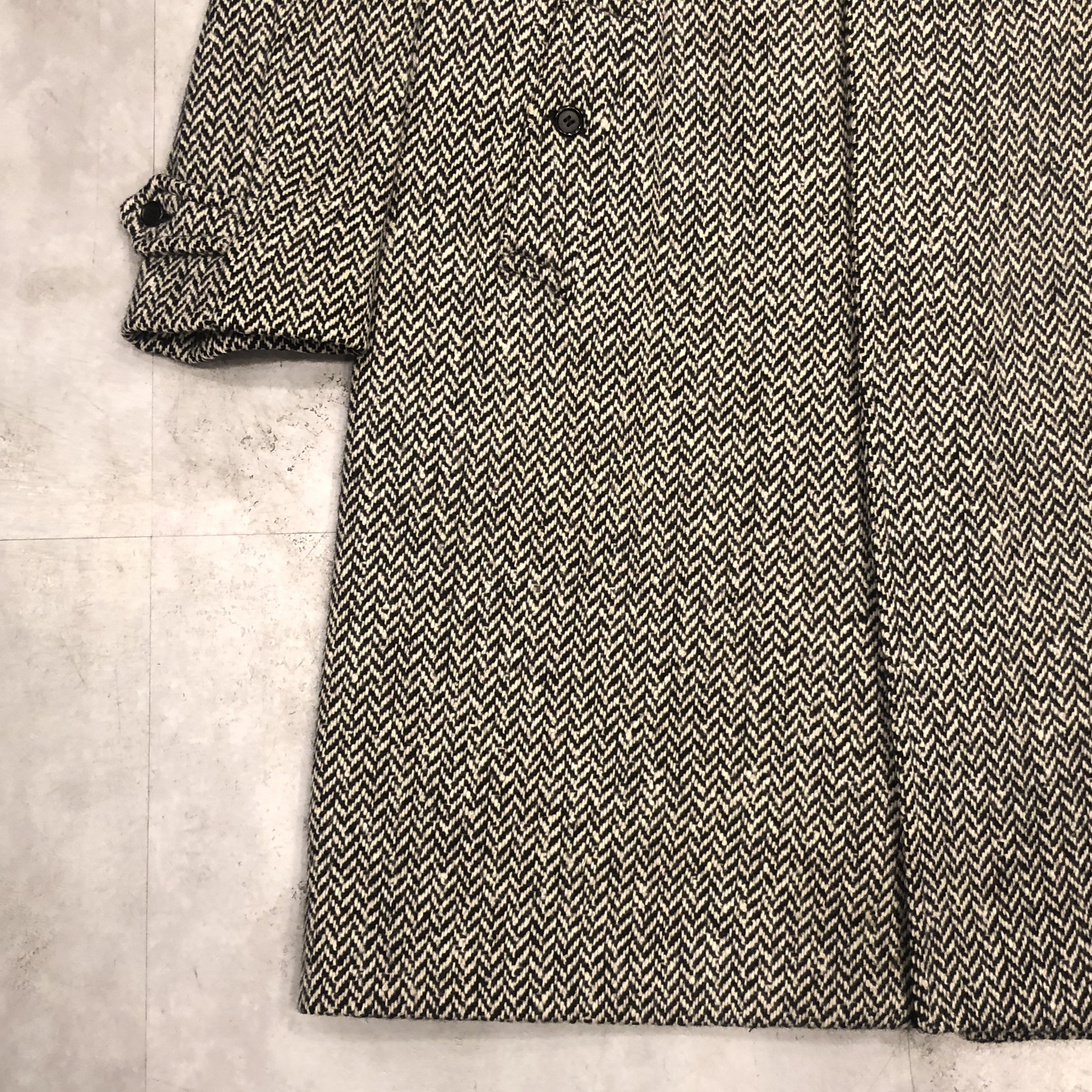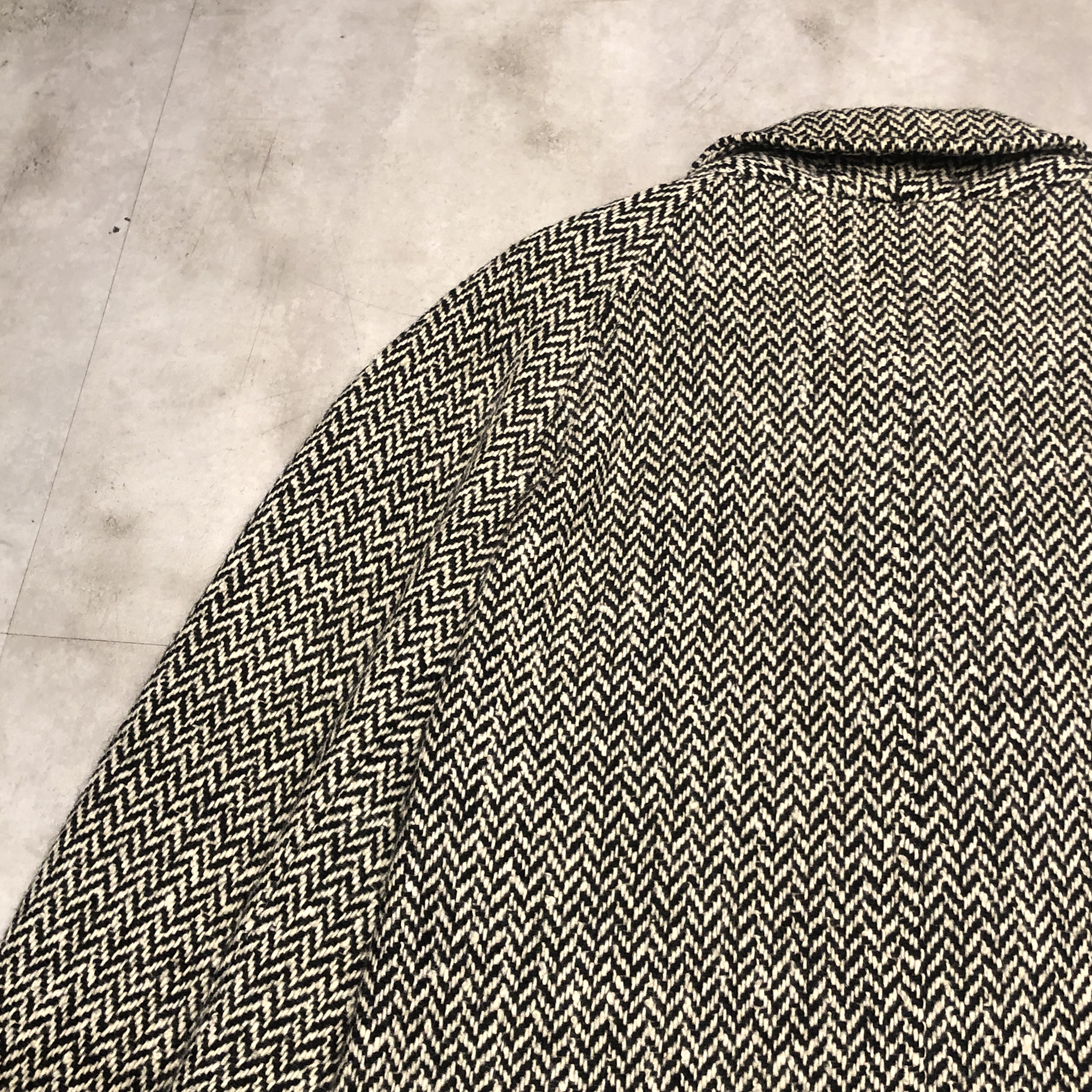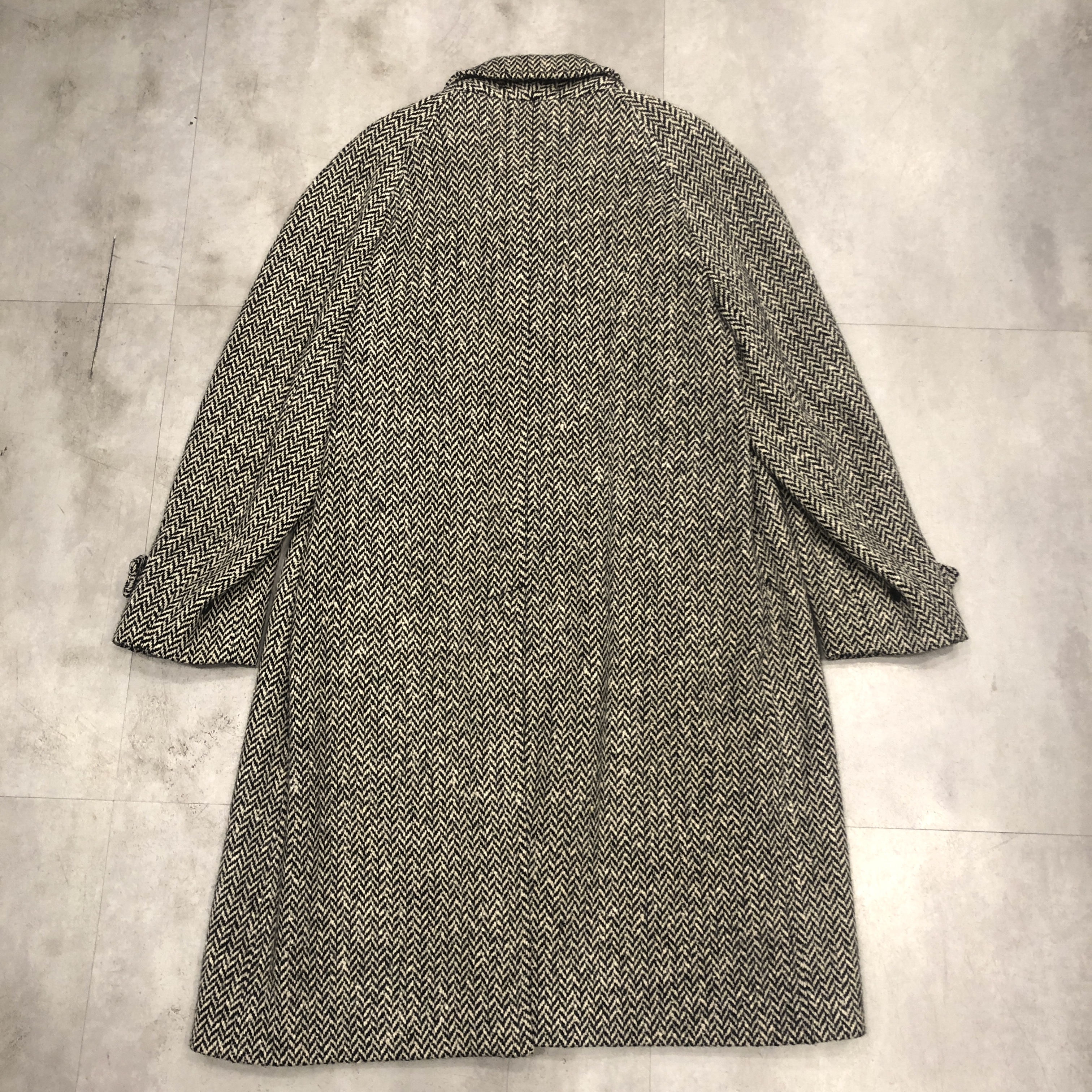 バルマカーンコートの最高峰といえば英国製Burberrys、その中でも流通数が比較的少ない“IRISH TWEED”仕様が入荷しました。タグにはMade in England 、生地は名前の通り本場アイルランド産のヘリンボーンツイードを使用しており、一般的なバルマカーンの無地ウールとは一線を画す表情豊かな佇まい。ブラック×ホワイトのシンプルかつシックな配色です。シルエットは王道のラグランスリーブで、サイズ表記は54 REG。たっぷりとしたAラインに落ちる美しいドレープは、スーツの上から羽織っても、太めの軍パンにざっくり合わせてもサマになる万能さ。裏地は総裏仕様で滑りも良く丁寧な仕立て。Burberrysの中でも“コート屋”としての矜持が最も色濃く出るのがこの手のバルマカーンですが、さらにアイリッシュツイードという付加価値が付くことでワンランク上の存在感に昇華しています。今後ここまで雰囲気の良い個体にはなかなか出会えないと思いますので、お探しだった方は是非この機会に。