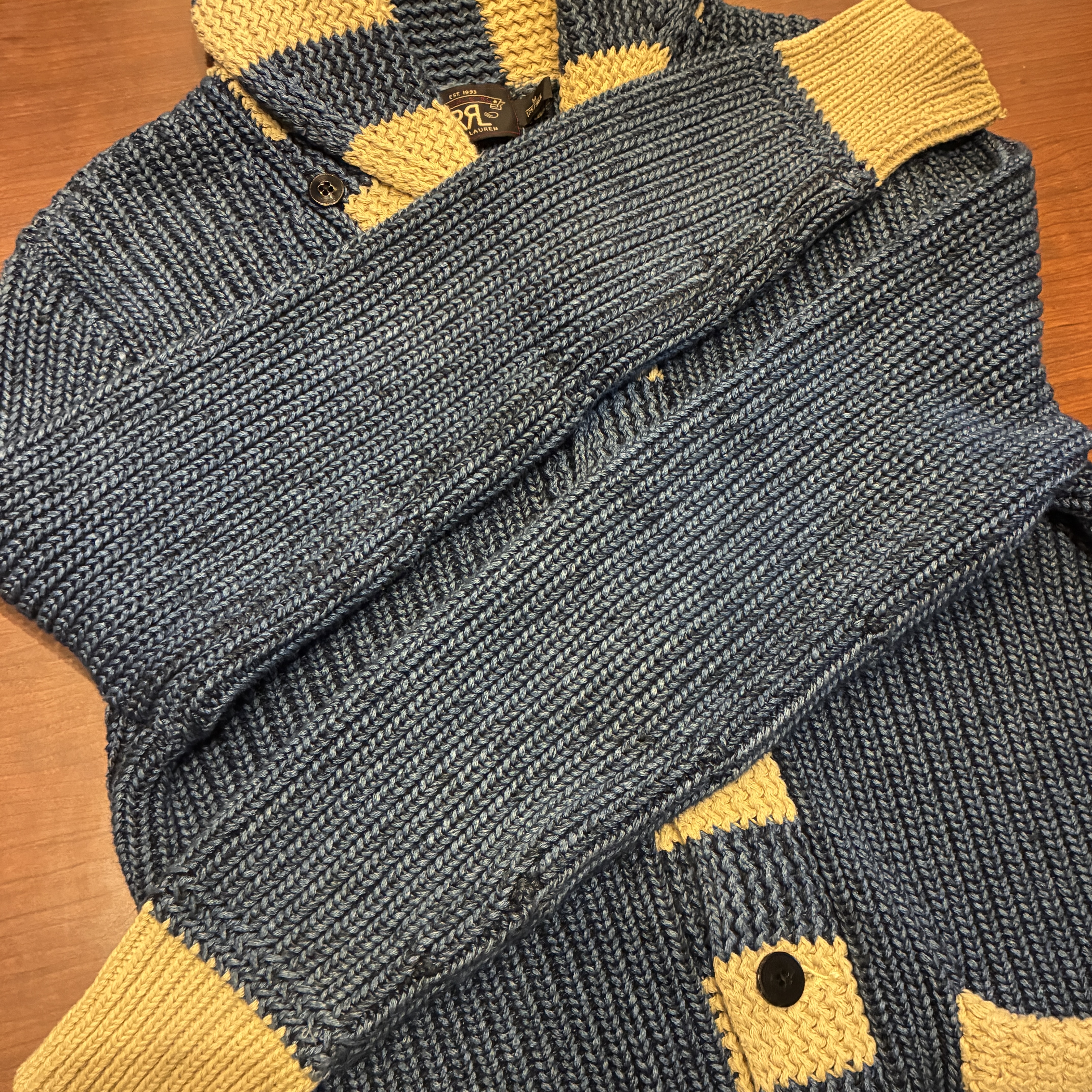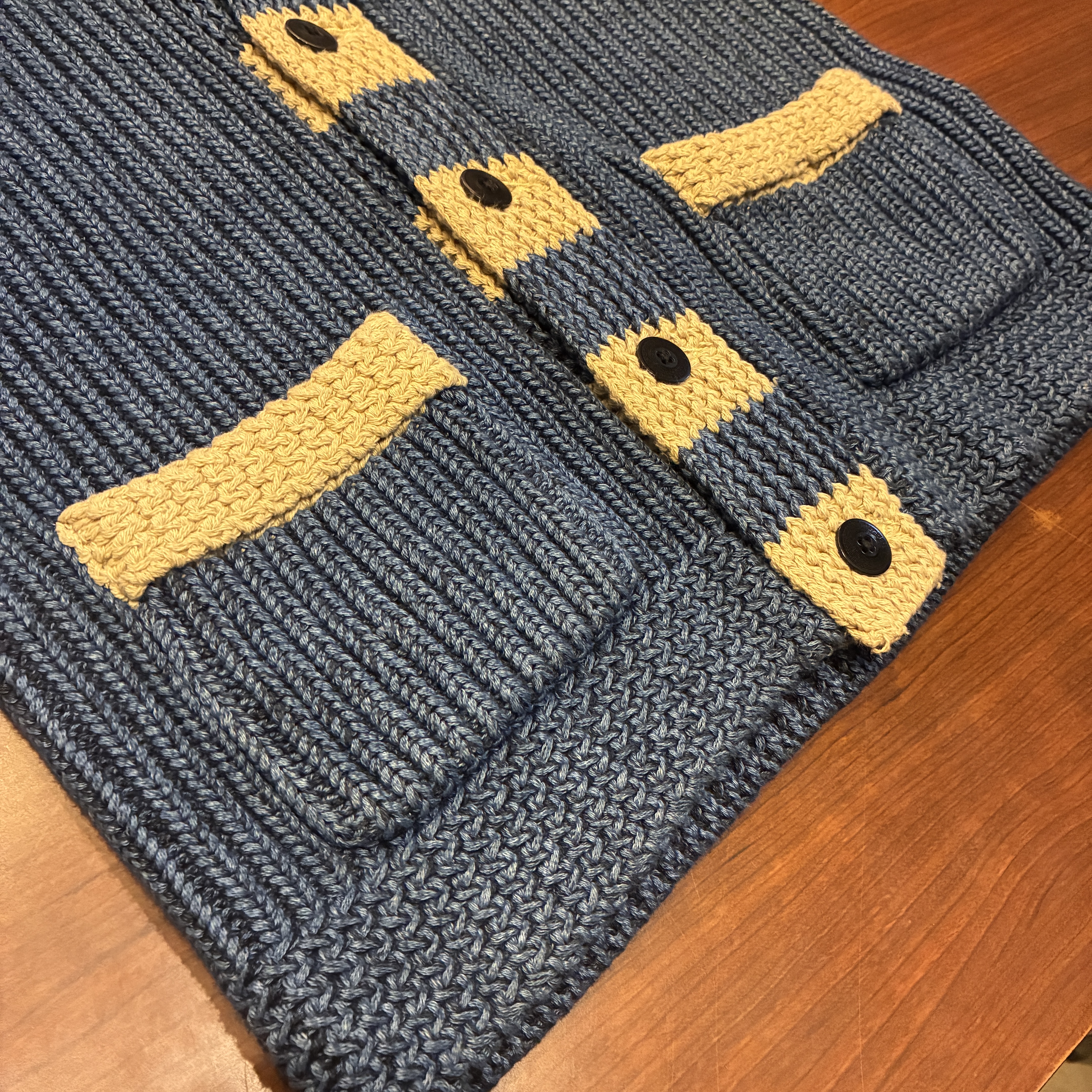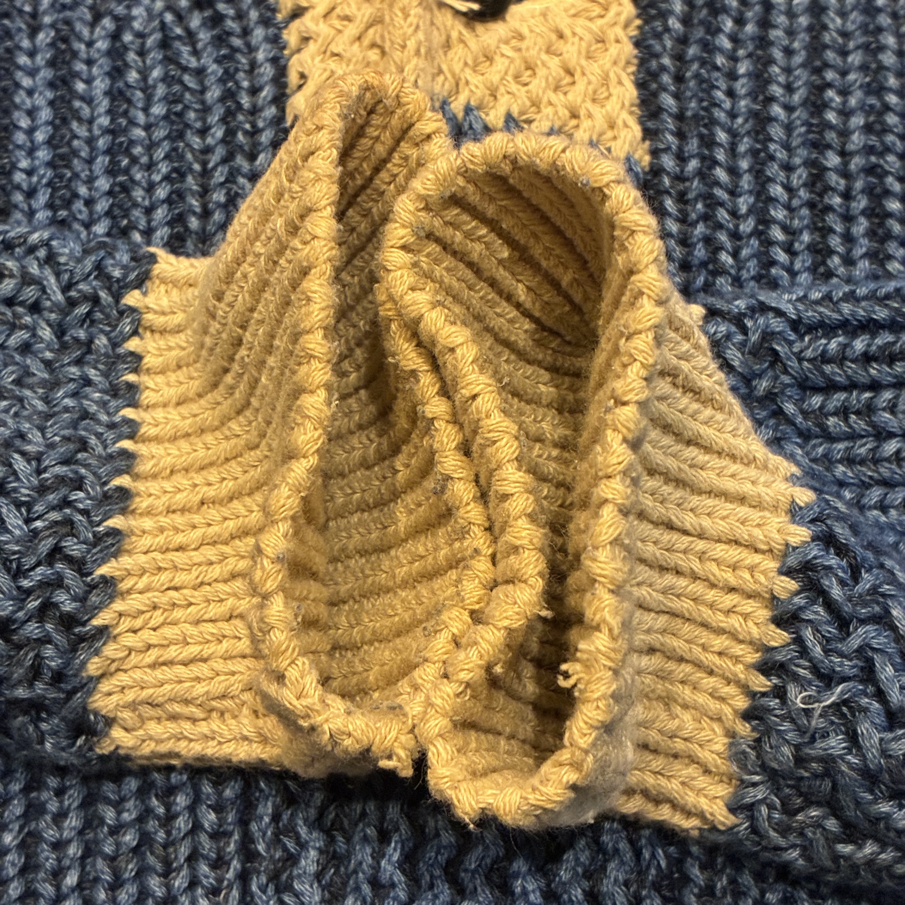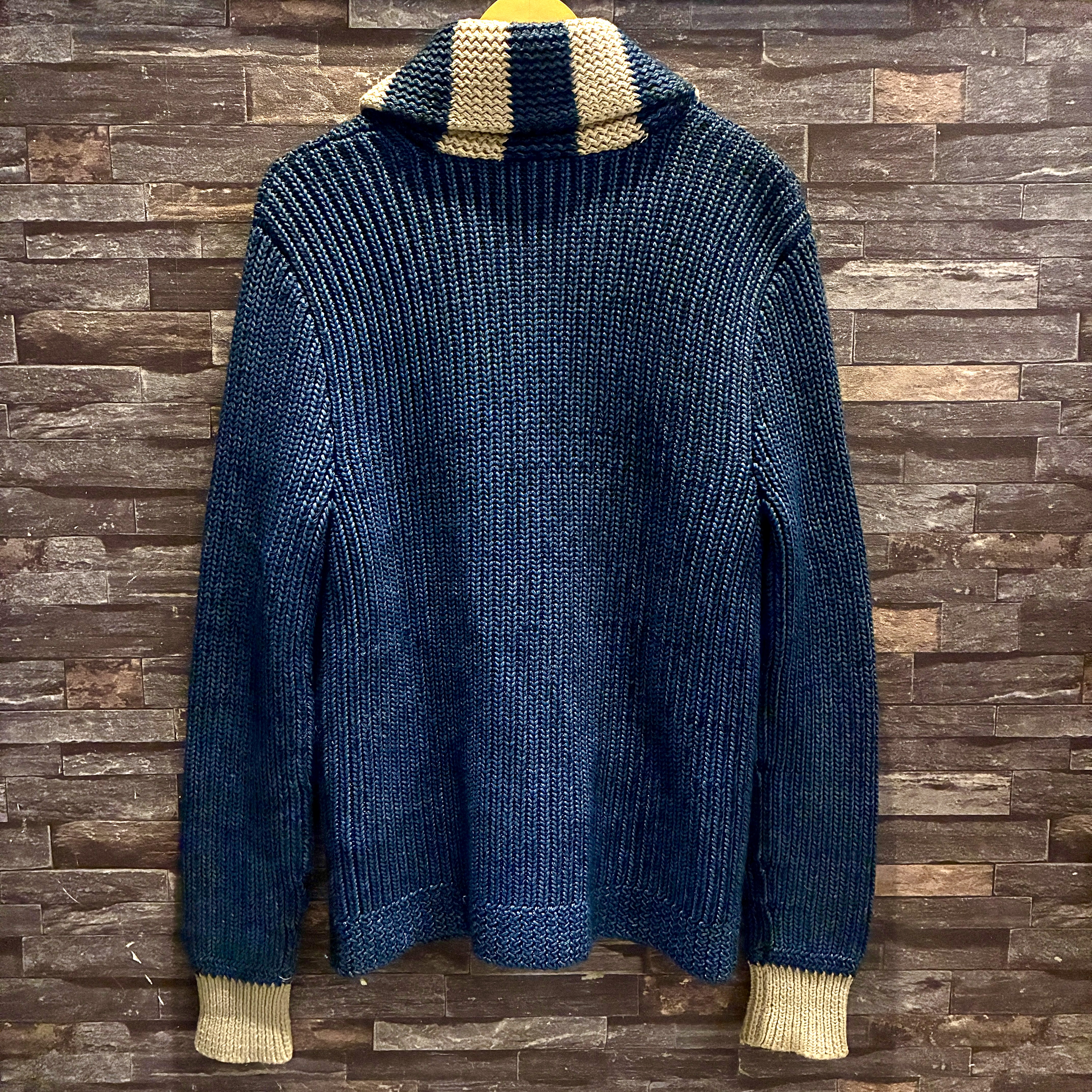 - ハンドニット製品特有の糸の飛び出しや毛羽立ち等の多少の着用感が見られますが、目立つダメージ等は無くまだまだ問題無く着用していただける状態です。