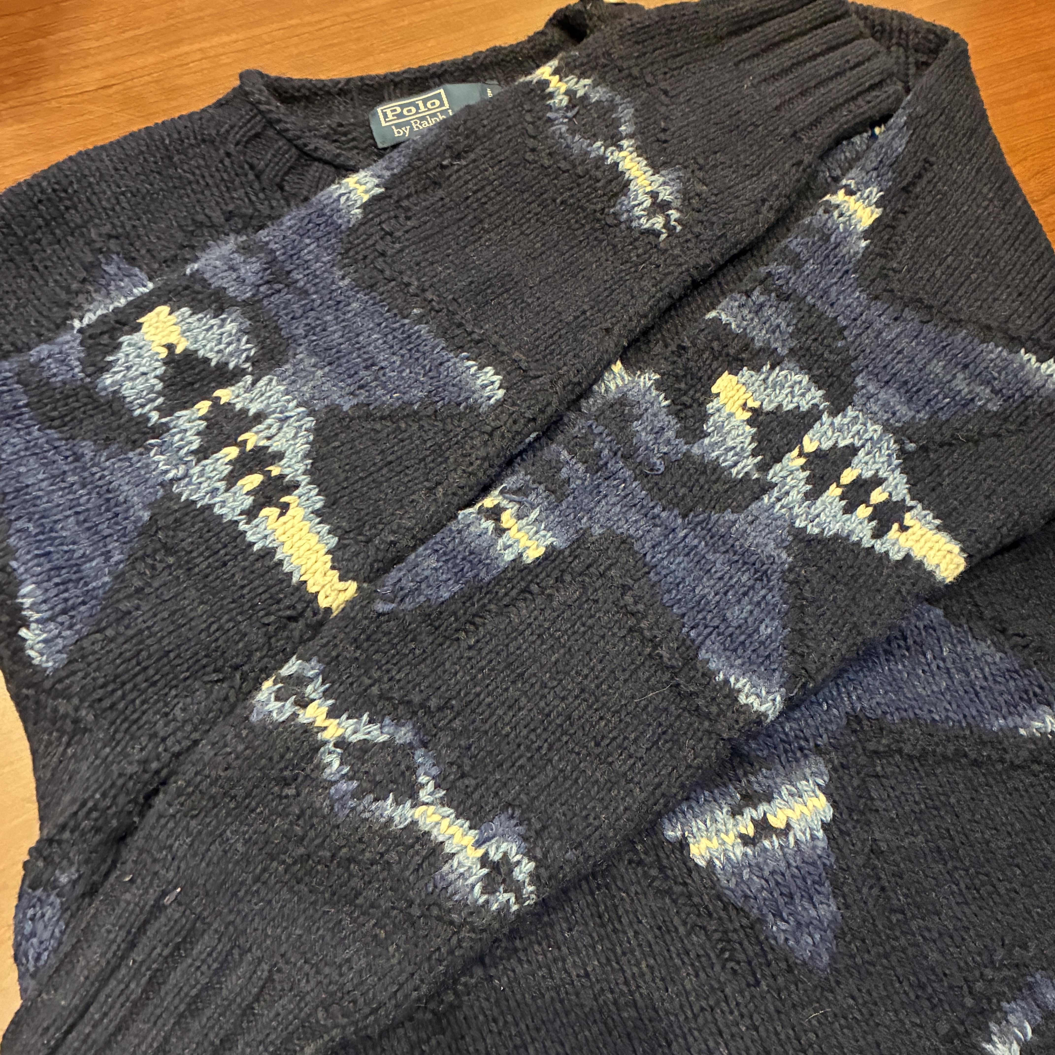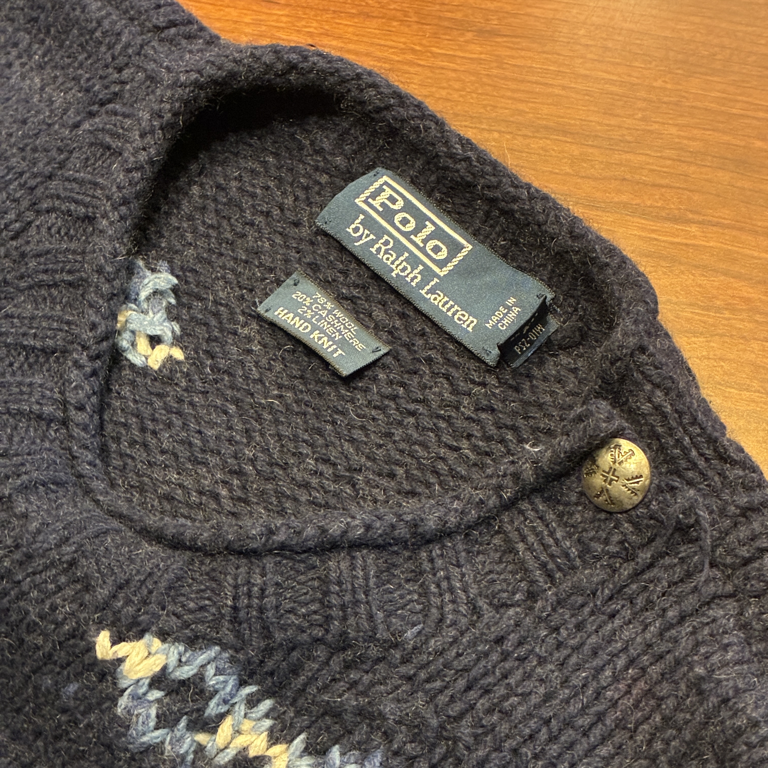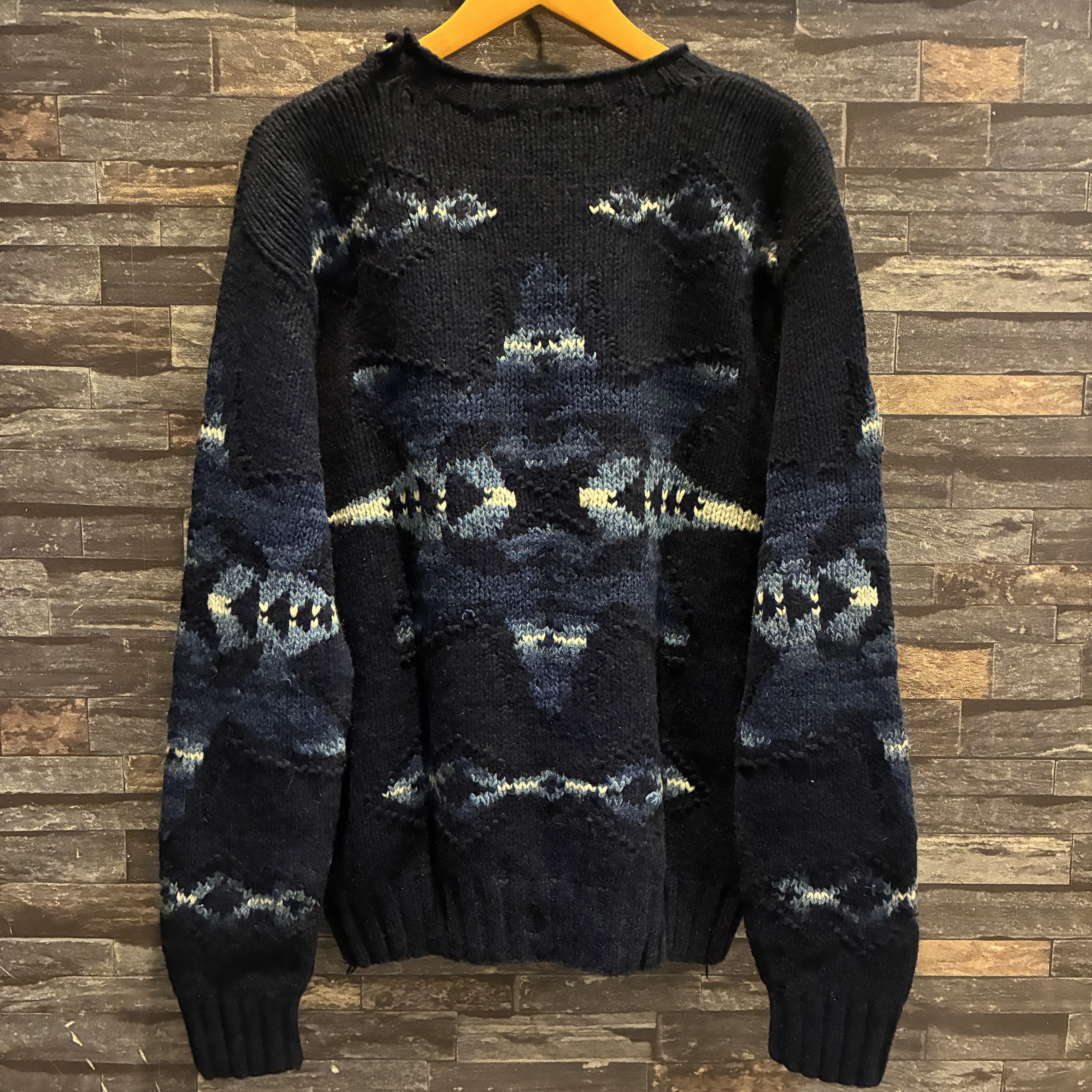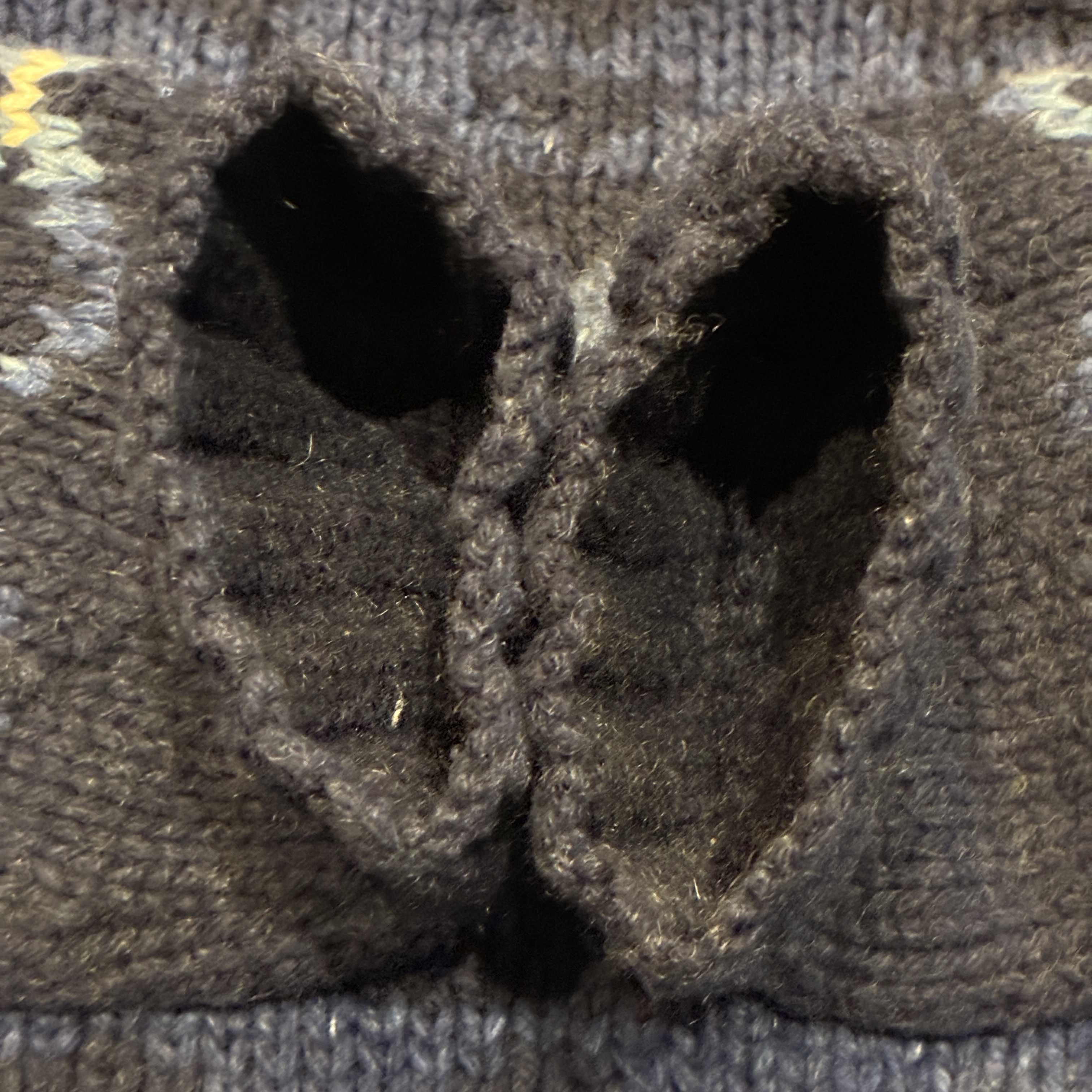 - ハンドニット製品特有の多少の毛羽立ちや糸の飛び出し、毛潰れ等の着用感がございますが、目立つ汚れやダメージは無くまだまだ問題無く着用していただける状態です。