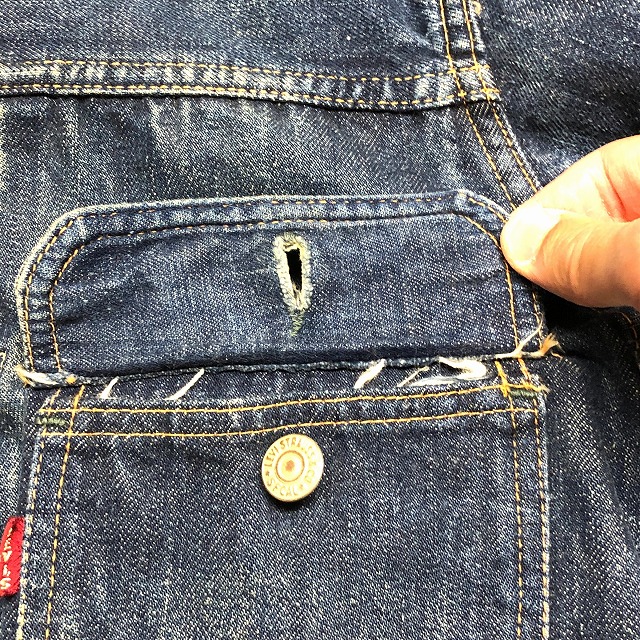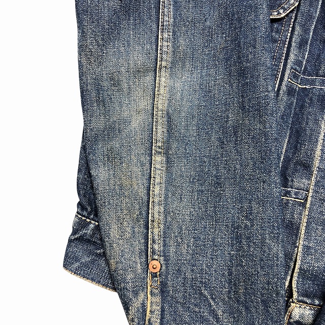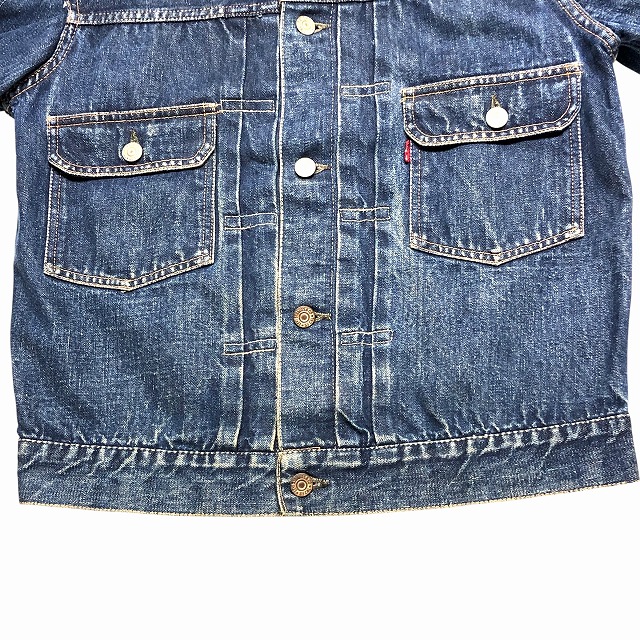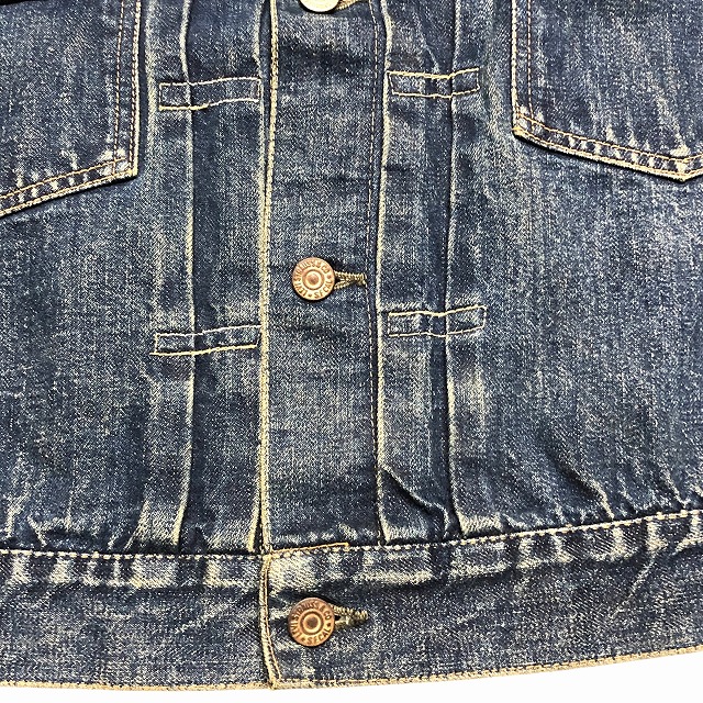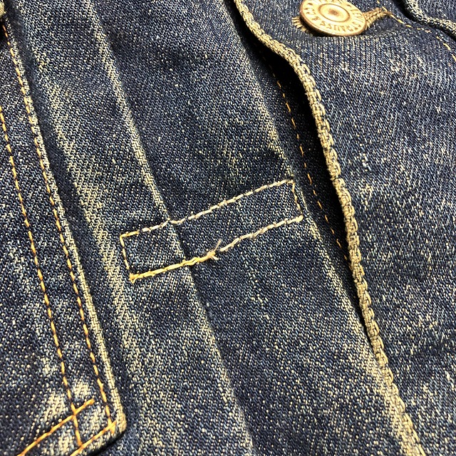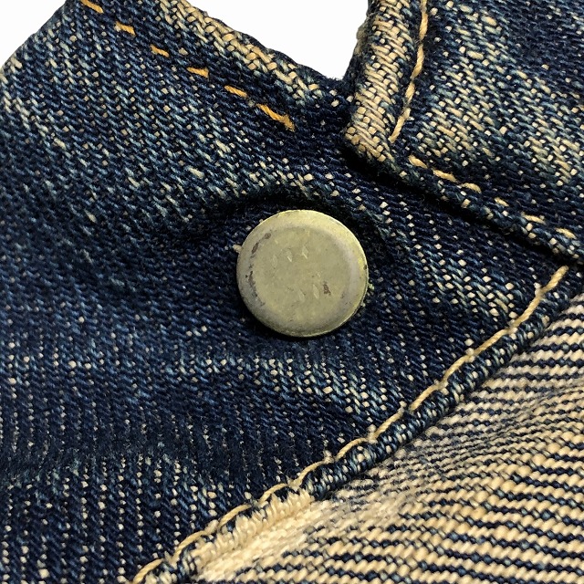 均等V、ボタン裏刻印『ツブツブ』、胸ポケット裏 ライトオンスデニム、フロント折り返しステッチ、