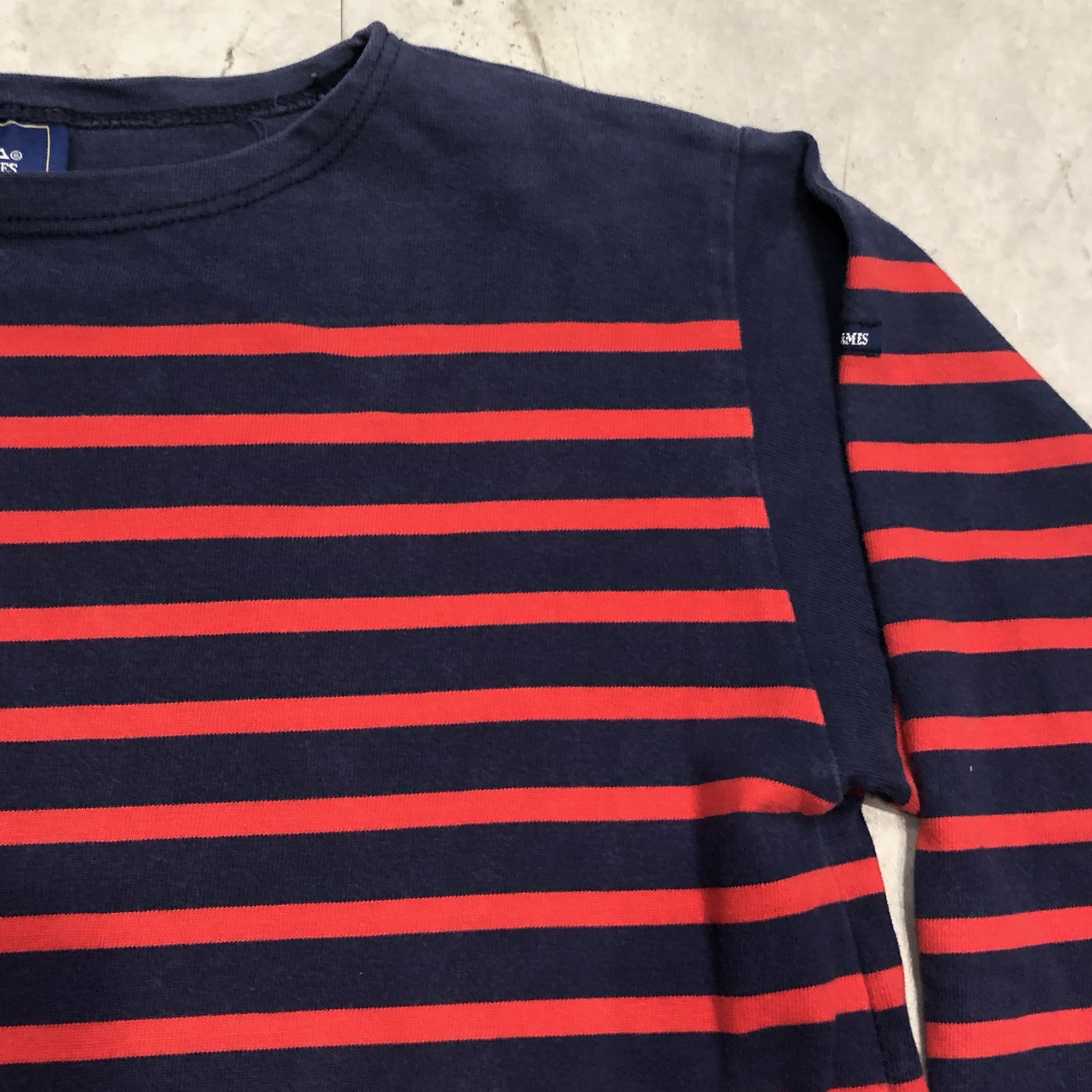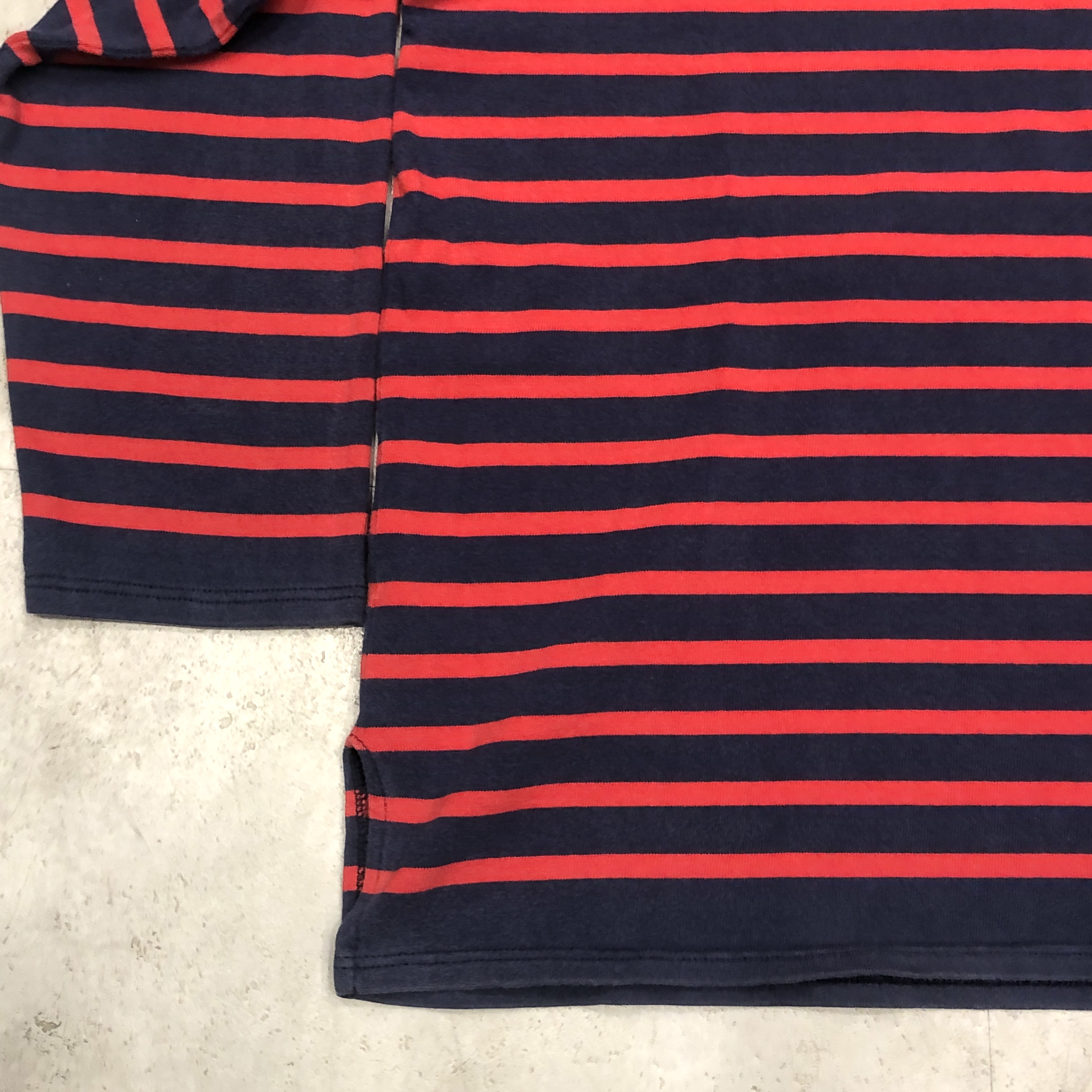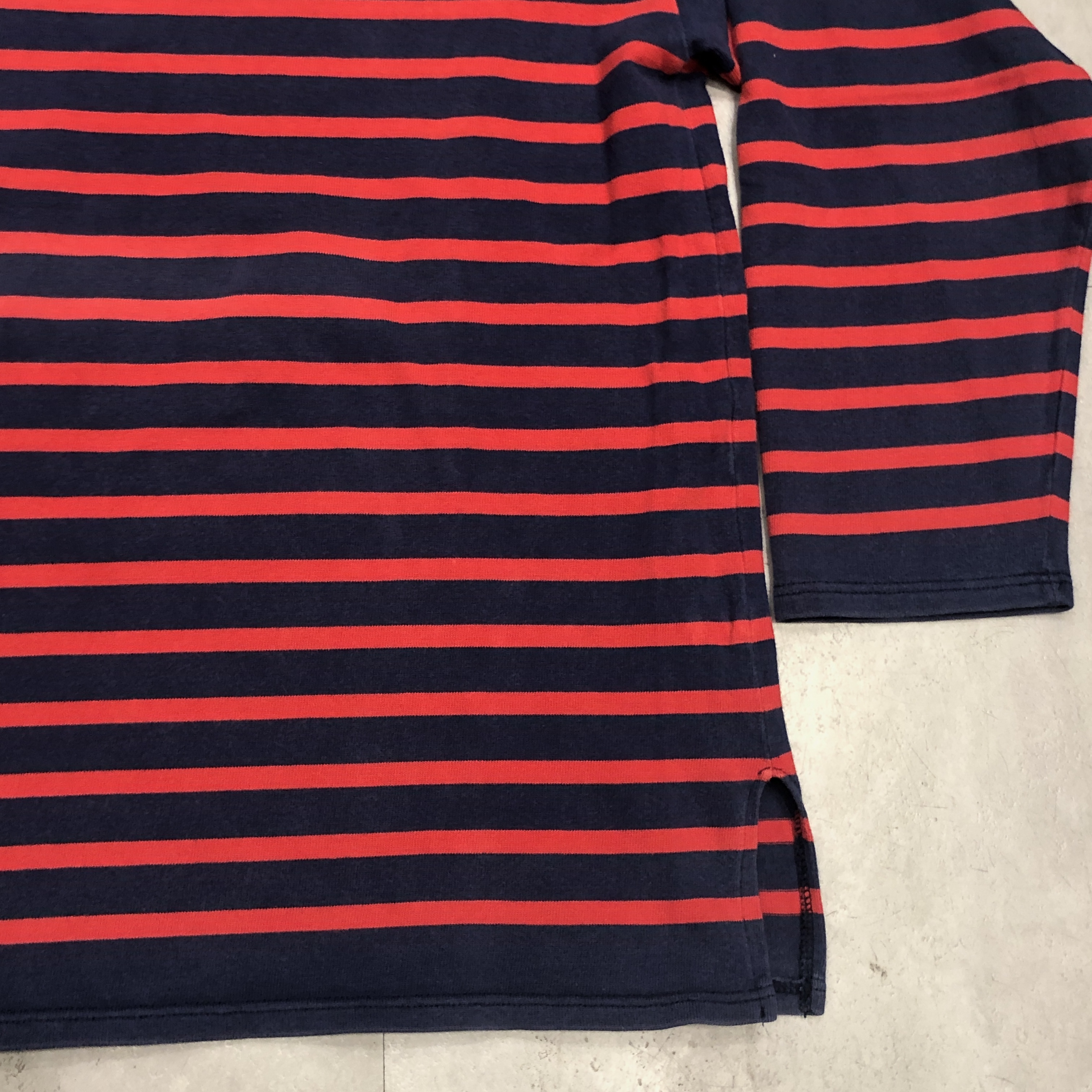 サイズ ML 実寸 肩幅 47.5cm 身幅 53.5cm 袖丈 50cm 着丈 63cm ※多少の誤差はご容赦ください。 状態 年代相応の着用感、スレ等が画像の様にございますが、古着慣れされた方でしたら問題なく着用していただける範囲です。 ※弊社の取扱商品は基本的には中古品の為、写真に写しきれない細かな汚れや擦れ、アタリ等は全て記載しきれない場合がございます。また撮影環境により、実際の色味に若干の誤差が生じる場合がございます。採寸値の±2.5cm内は誤差とさせていただき、誤差内での採寸違いやイメージの相違、細かなダメージの有無等による返品、返金、交換等は一切承れませんのでご了承下さい。ヴィンテージ、古着にご理解のある方のみご購入ください。 ※弊社のオンラインショップ掲載商品は店頭での販売も行っています。 そのため同時に注文がなされた場合には、全て店頭販売を優先させて頂きますので、予めご了承ください。 商品詳細 SAINT JAMESの中でも海を色濃く感じるモデル「NAVAL」。 定番の「OUESSANT」とは一味違い、薄手のコットン生地を採用。軽やかな着心地と、スッキリと長めの着丈、そして裾のスリットがシルエットに動きを生み出します。ネイビーとレッドの絶妙な配色も使い勝手抜群。季節を問わずインナーとしても一枚でも活躍してくれます。そして本個体は80年代後半から90年代の希少な一品。 お探しの方はぜひこの機会に。