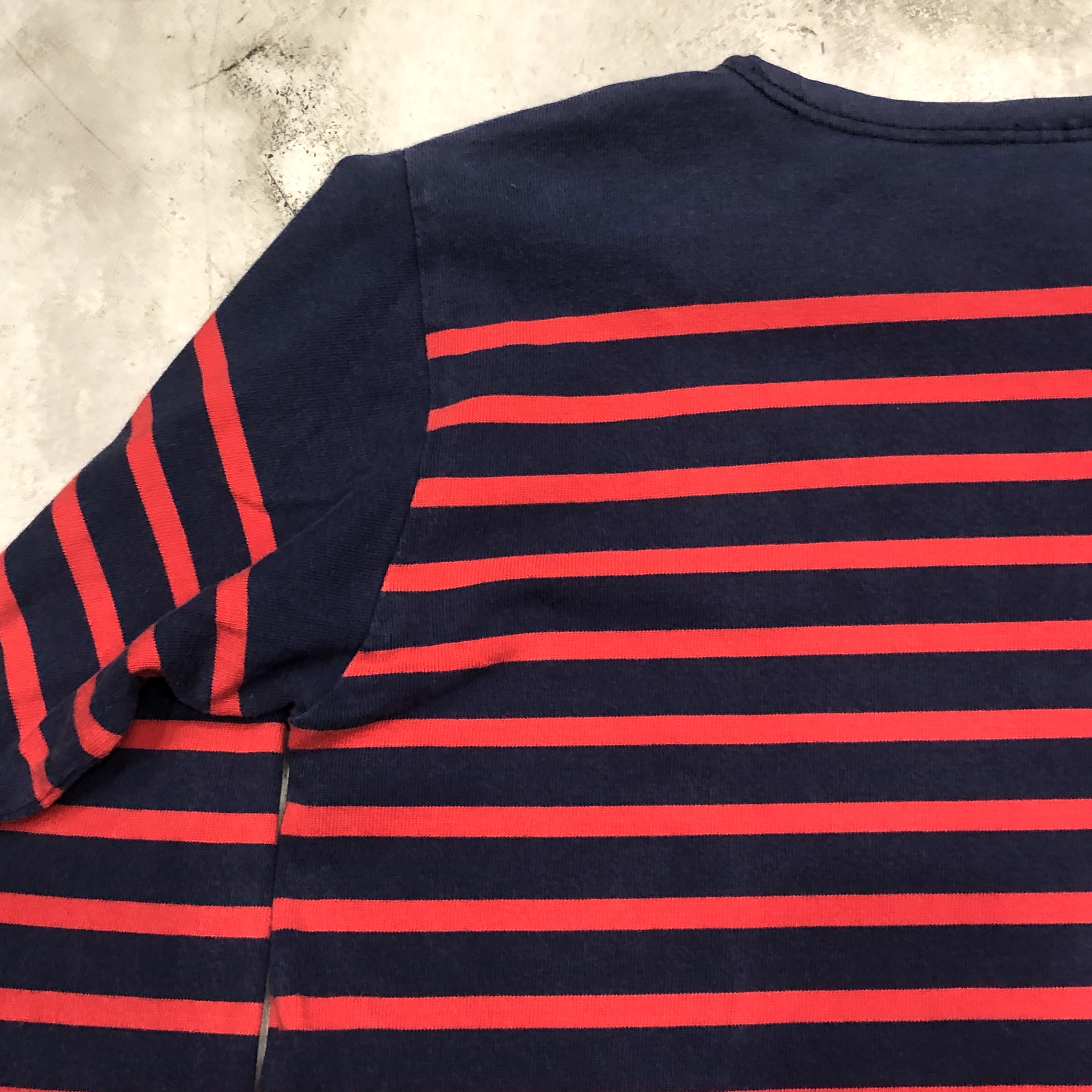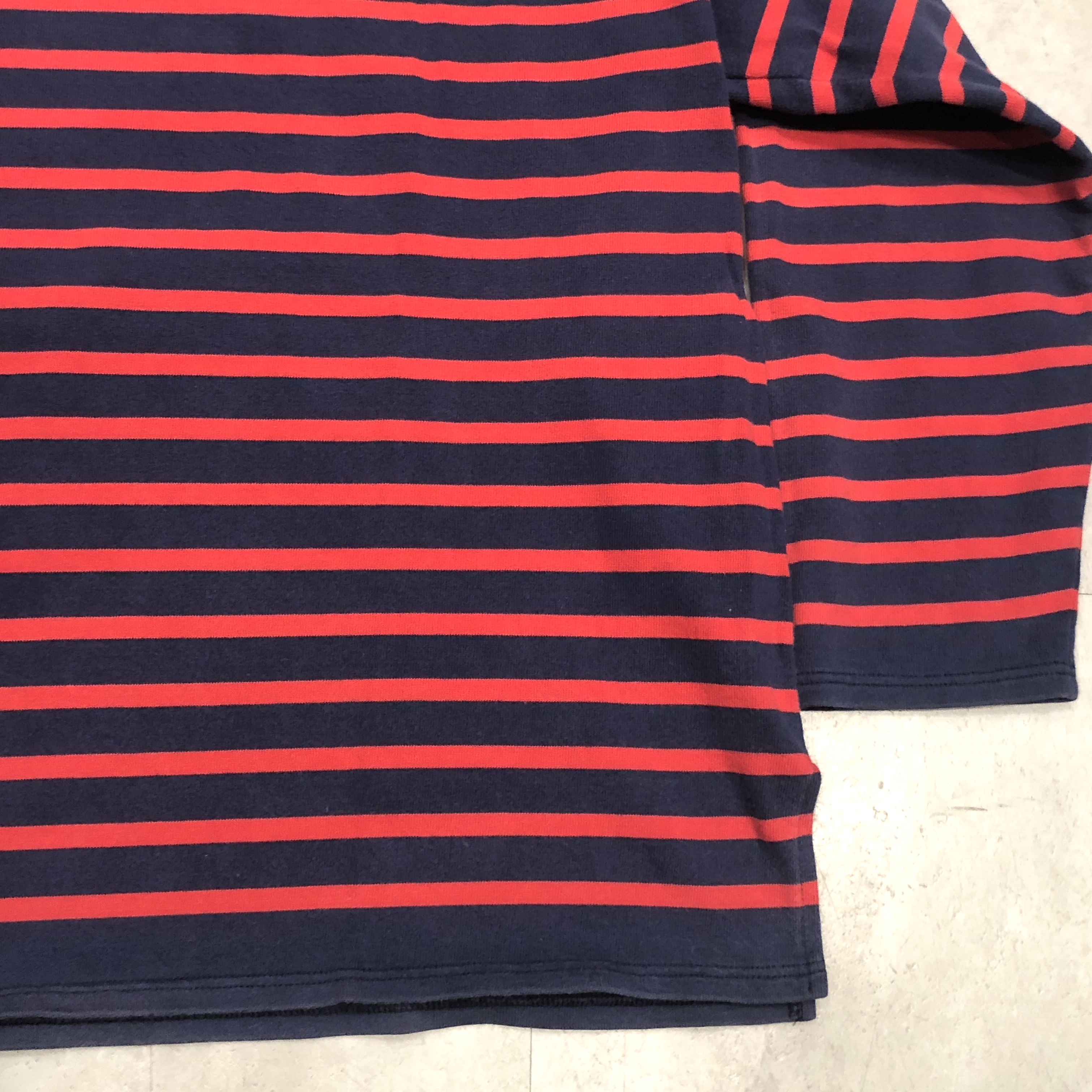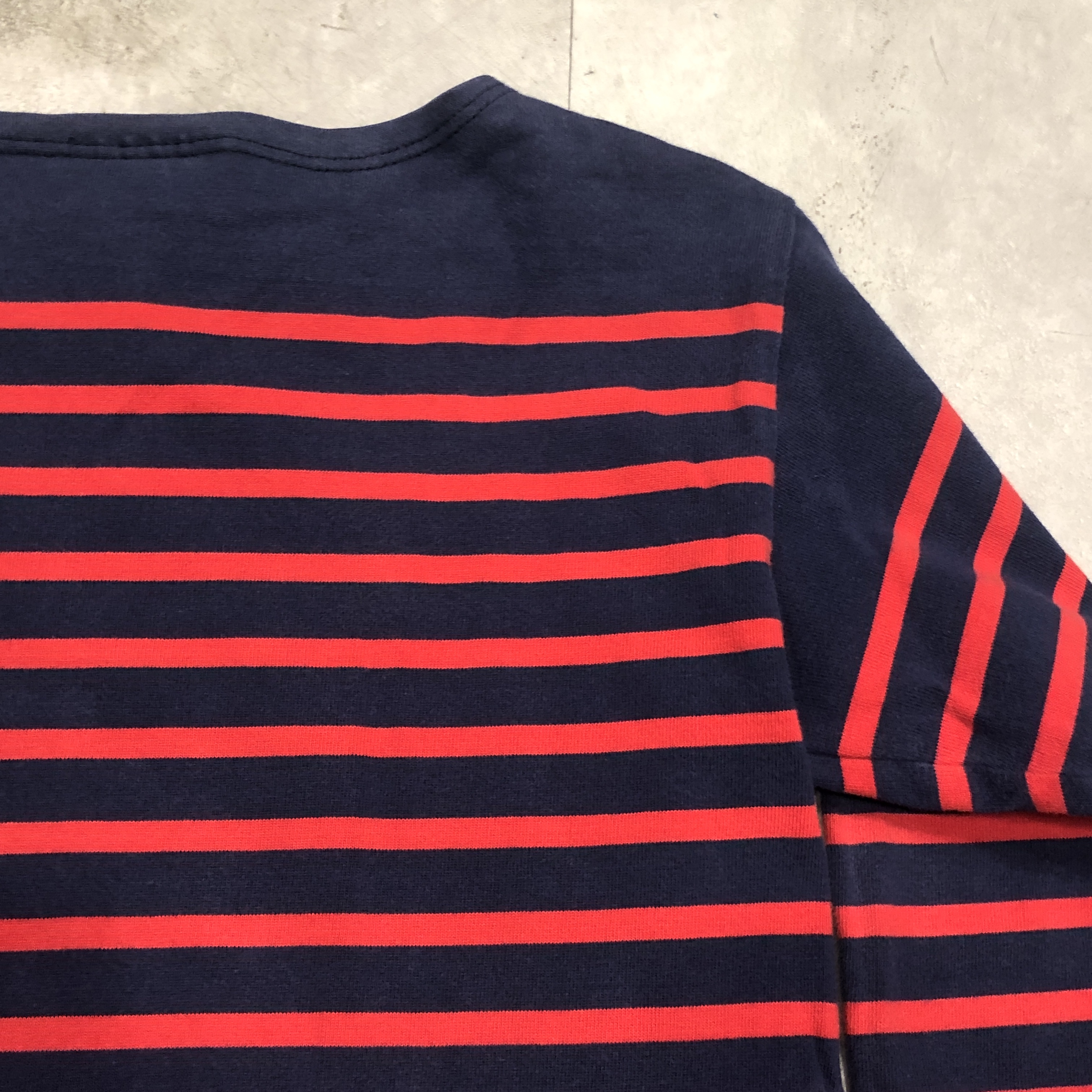 サイズ ML 実寸 肩幅 47.5cm 身幅 53.5cm 袖丈 50cm 着丈 63cm ※多少の誤差はご容赦ください。 状態 年代相応の着用感、スレ等が画像の様にございますが、古着慣れされた方でしたら問題なく着用していただける範囲です。 ※弊社の取扱商品は基本的には中古品の為、写真に写しきれない細かな汚れや擦れ、アタリ等は全て記載しきれない場合がございます。また撮影環境により、実際の色味に若干の誤差が生じる場合がございます。採寸値の±2.5cm内は誤差とさせていただき、誤差内での採寸違いやイメージの相違、細かなダメージの有無等による返品、返金、交換等は一切承れませんのでご了承下さい。ヴィンテージ、古着にご理解のある方のみご購入ください。 ※弊社のオンラインショップ掲載商品は店頭での販売も行っています。 そのため同時に注文がなされた場合には、全て店頭販売を優先させて頂きますので、予めご了承ください。 商品詳細 SAINT JAMESの中でも海を色濃く感じるモデル「NAVAL」。 定番の「OUESSANT」とは一味違い、薄手のコットン生地を採用。軽やかな着心地と、スッキリと長めの着丈、そして裾のスリットがシルエットに動きを生み出します。ネイビーとレッドの絶妙な配色も使い勝手抜群。季節を問わずインナーとしても一枚でも活躍してくれます。そして本個体は80年代後半から90年代の希少な一品。 お探しの方はぜひこの機会に。