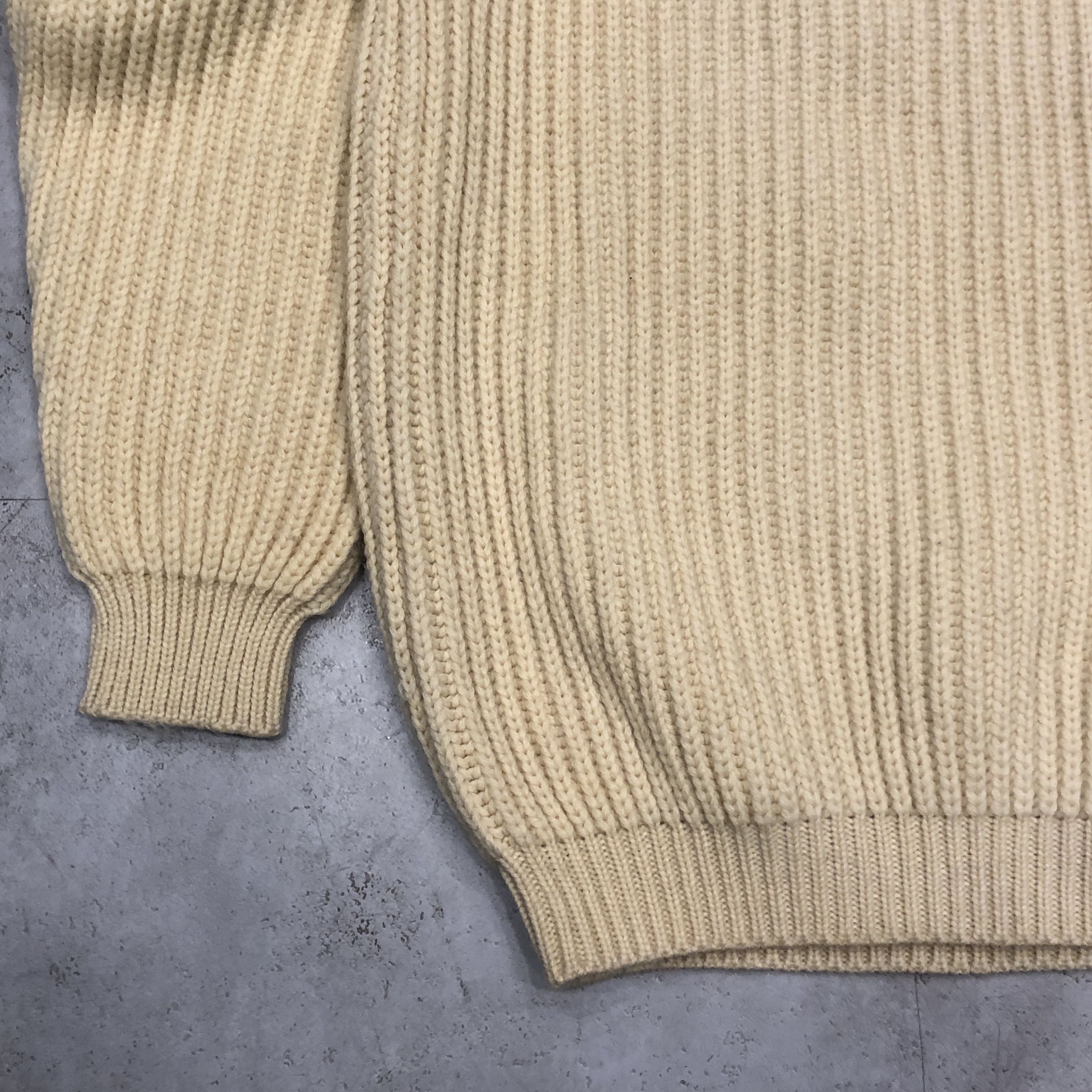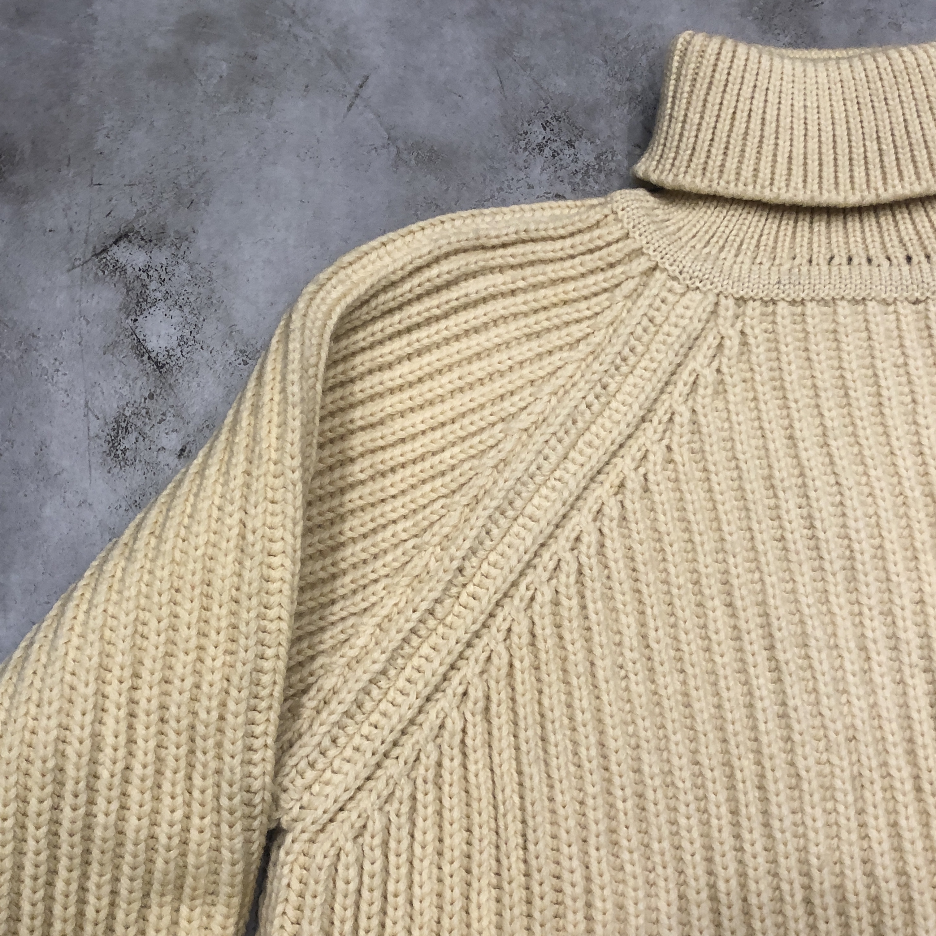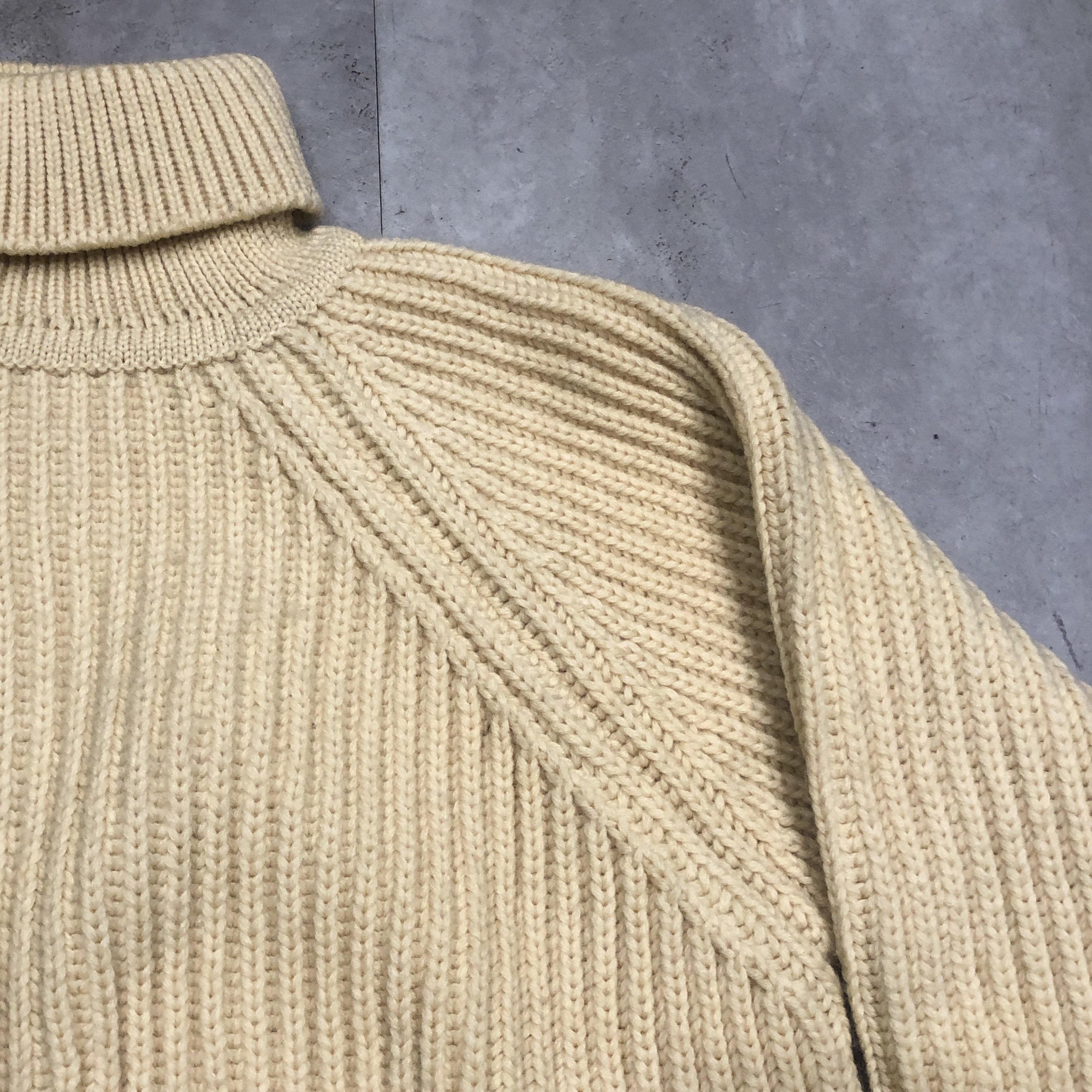 - アバクロ黄金期—— その誇り高きスコットランド製ウールリブ・タートルネックが入荷しました。肉厚で空気をふくんだ凹凸あるリブ、ぎゅっと目が詰まりながらも驚くほど柔らかい触り心地は、現行ではほとんど味わえないクラシックニットの魅力をそのまま留めています。淡いバタークリームのようなオートミールカラーがまた秀逸で、北欧の漁師ニットを思わせる無骨さと、スコットランドニット特有の上品さが絶妙に同居。ヴィンテージアバクロらしく、ラグランスリーブによる丸みのある肩線が美しいシルエットをつくり、冬のスタイルに静かな存在感を与えてくれます。アウトドア、ミリタリー、クラシックのどれにも自然に馴染み、ニット好きなら一度は手にしておきたい完成度の高い一着です。