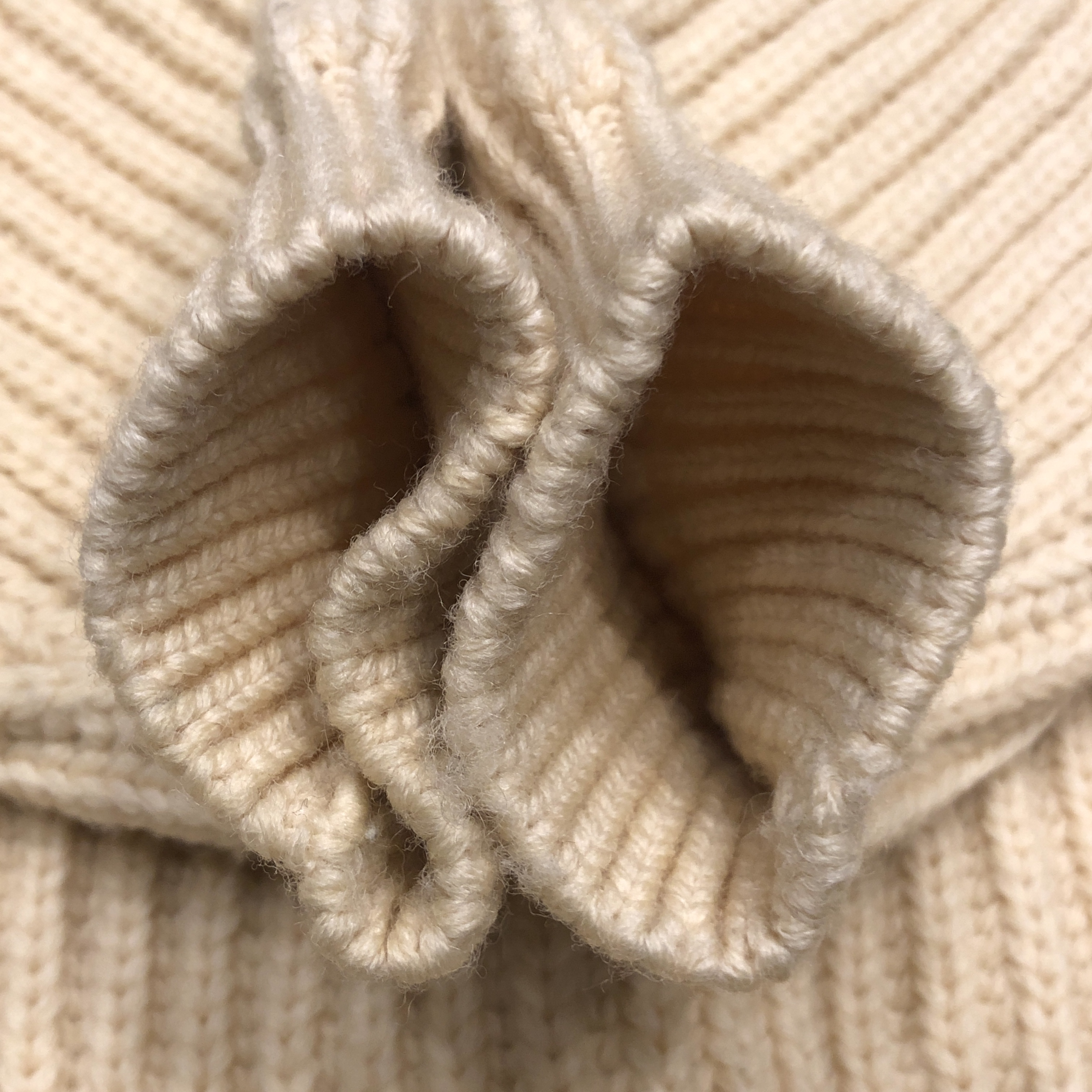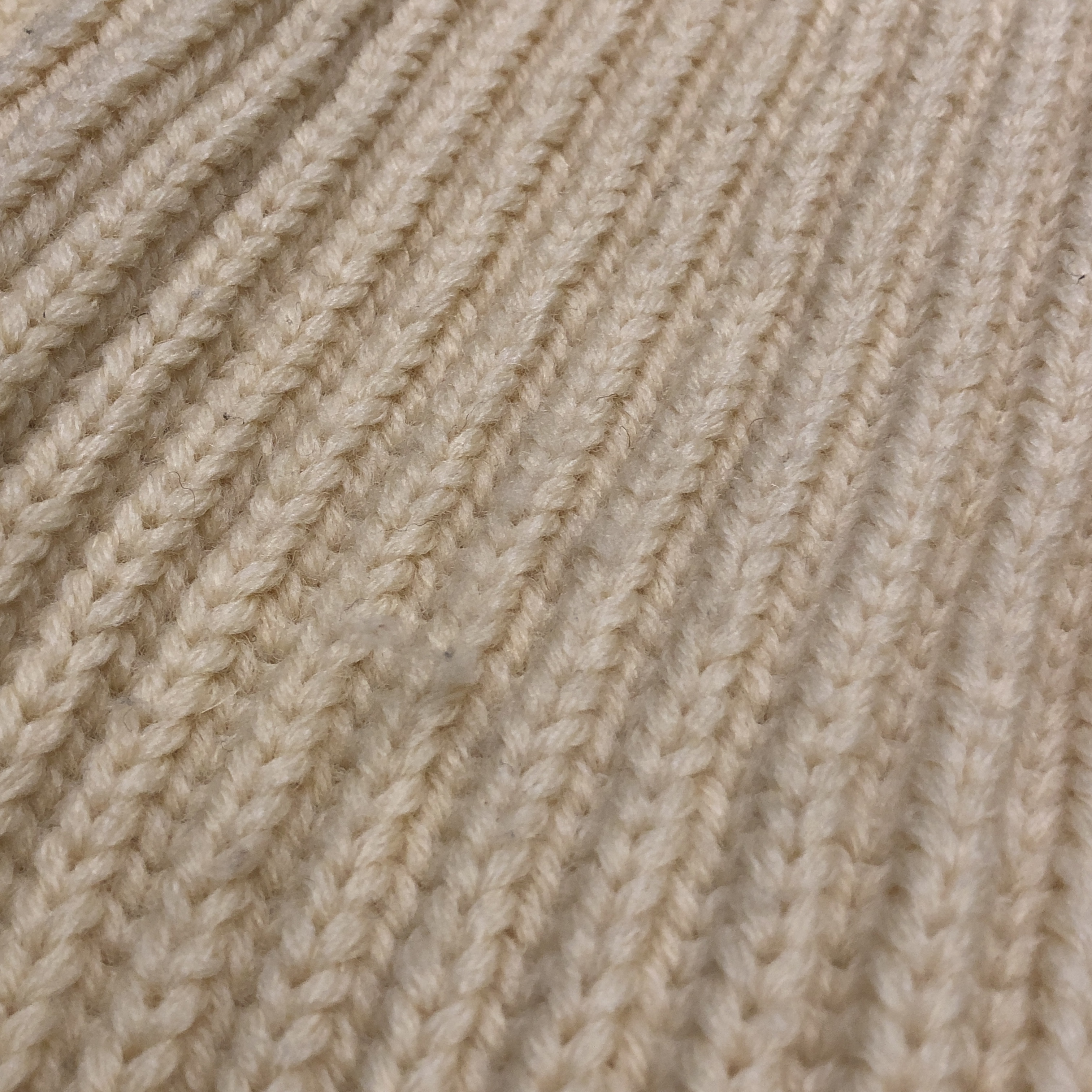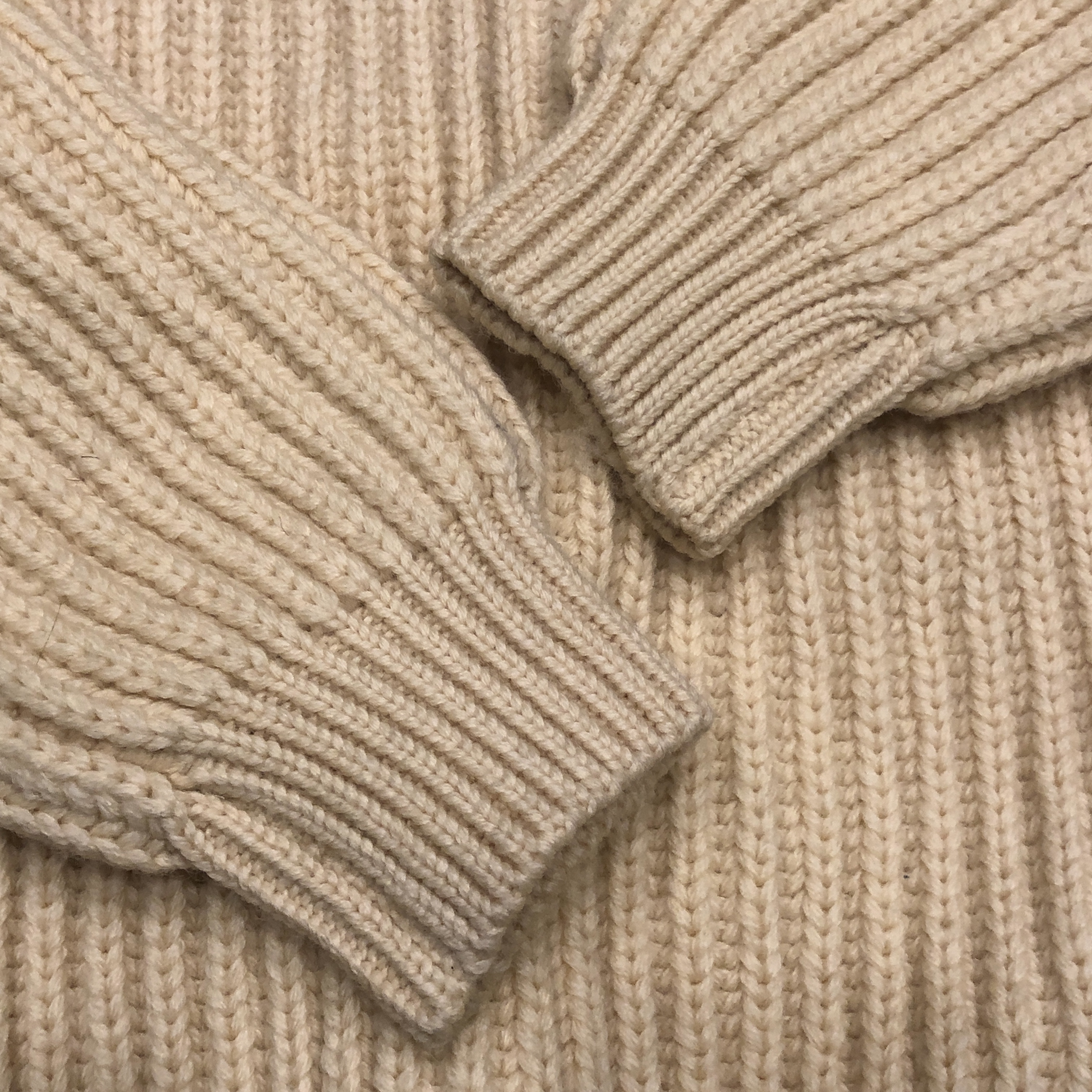 - アバクロ黄金期—— その誇り高きスコットランド製ウールリブ・タートルネックが入荷しました。肉厚で空気をふくんだ凹凸あるリブ、ぎゅっと目が詰まりながらも驚くほど柔らかい触り心地は、現行ではほとんど味わえないクラシックニットの魅力をそのまま留めています。淡いバタークリームのようなオートミールカラーがまた秀逸で、北欧の漁師ニットを思わせる無骨さと、スコットランドニット特有の上品さが絶妙に同居。ヴィンテージアバクロらしく、ラグランスリーブによる丸みのある肩線が美しいシルエットをつくり、冬のスタイルに静かな存在感を与えてくれます。アウトドア、ミリタリー、クラシックのどれにも自然に馴染み、ニット好きなら一度は手にしておきたい完成度の高い一着です。