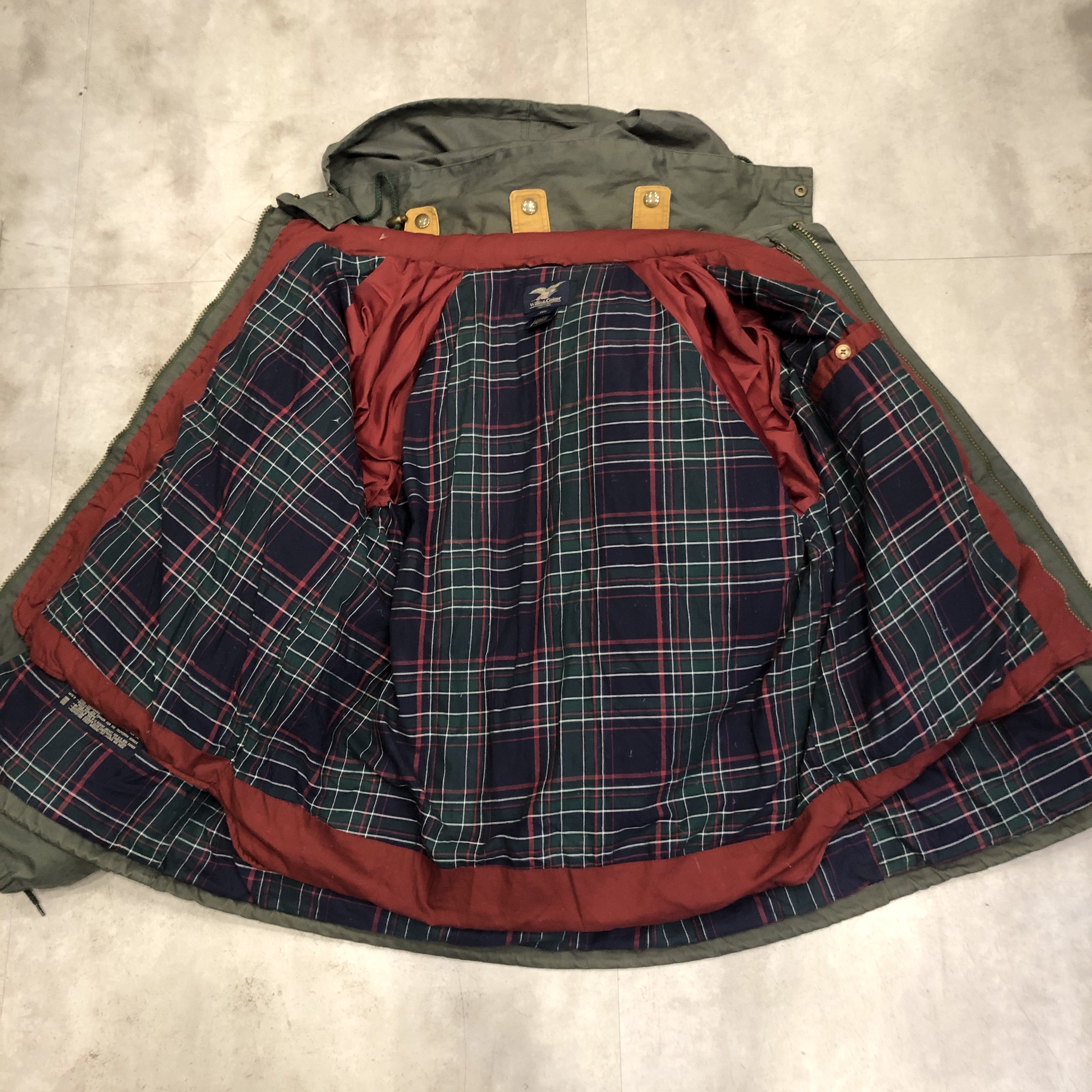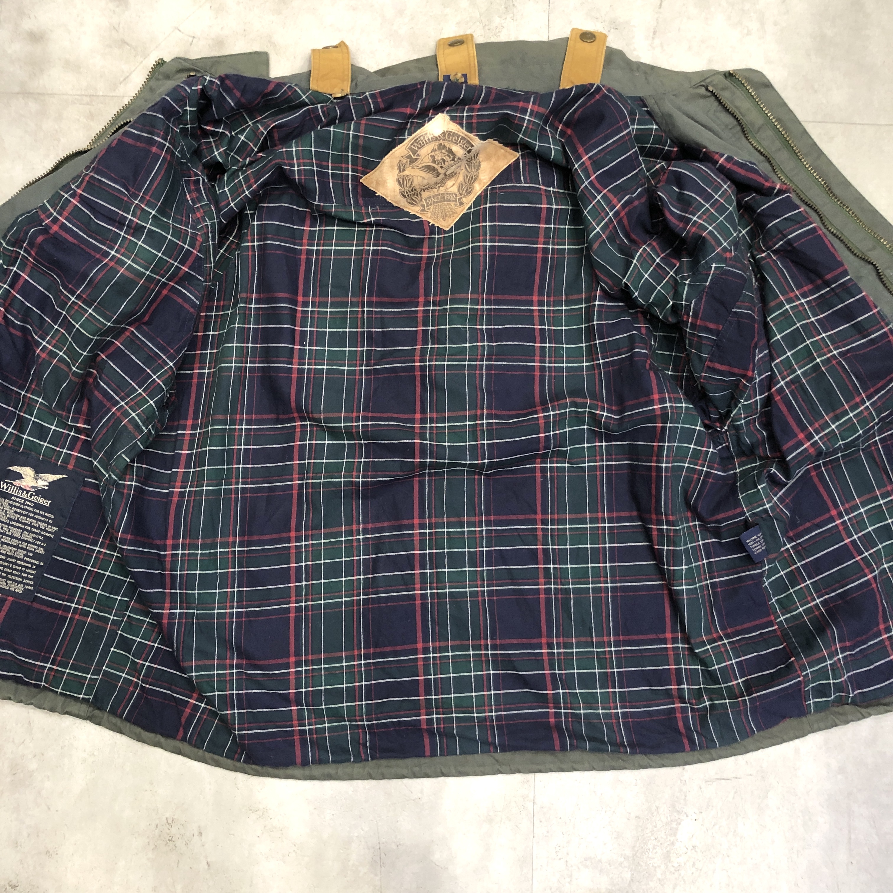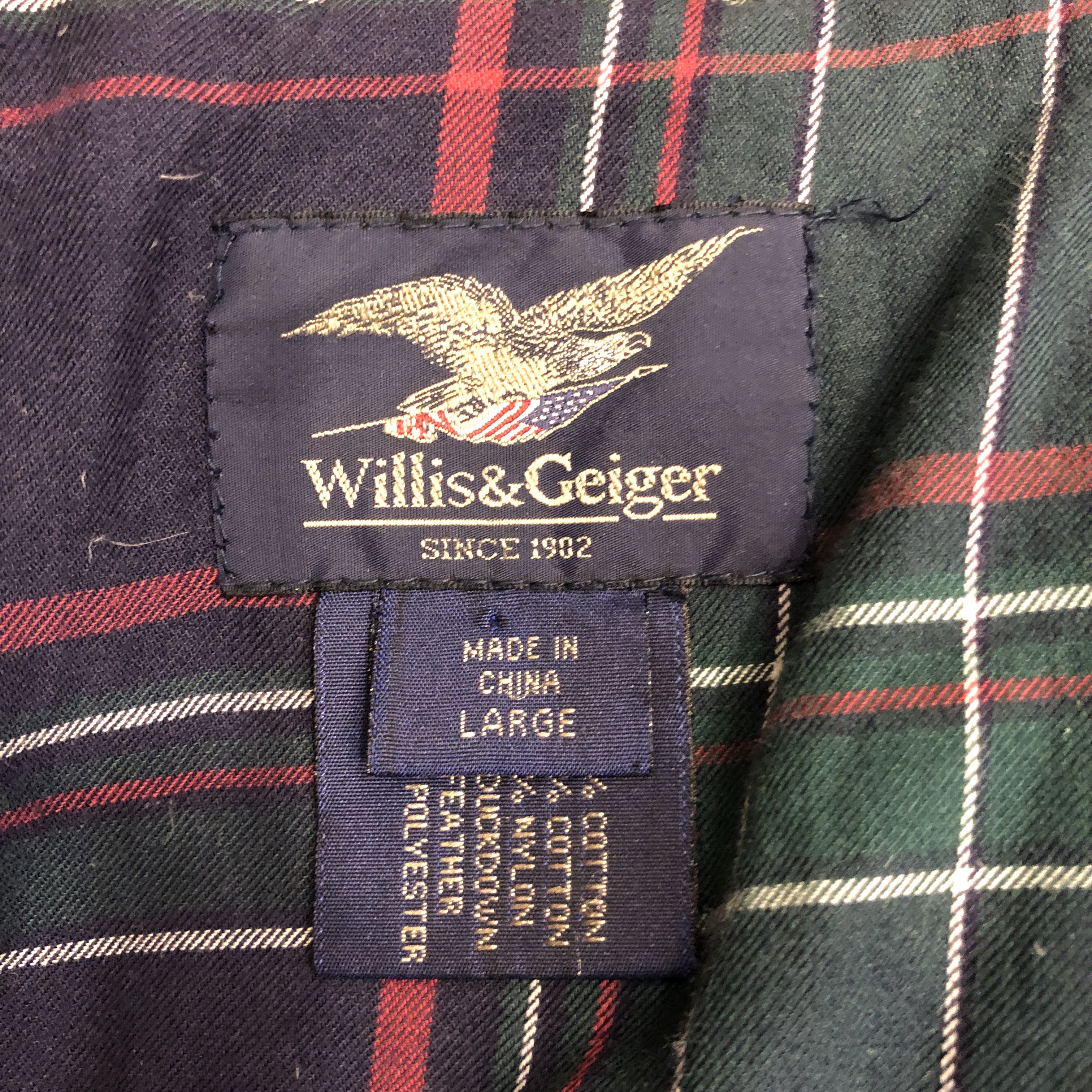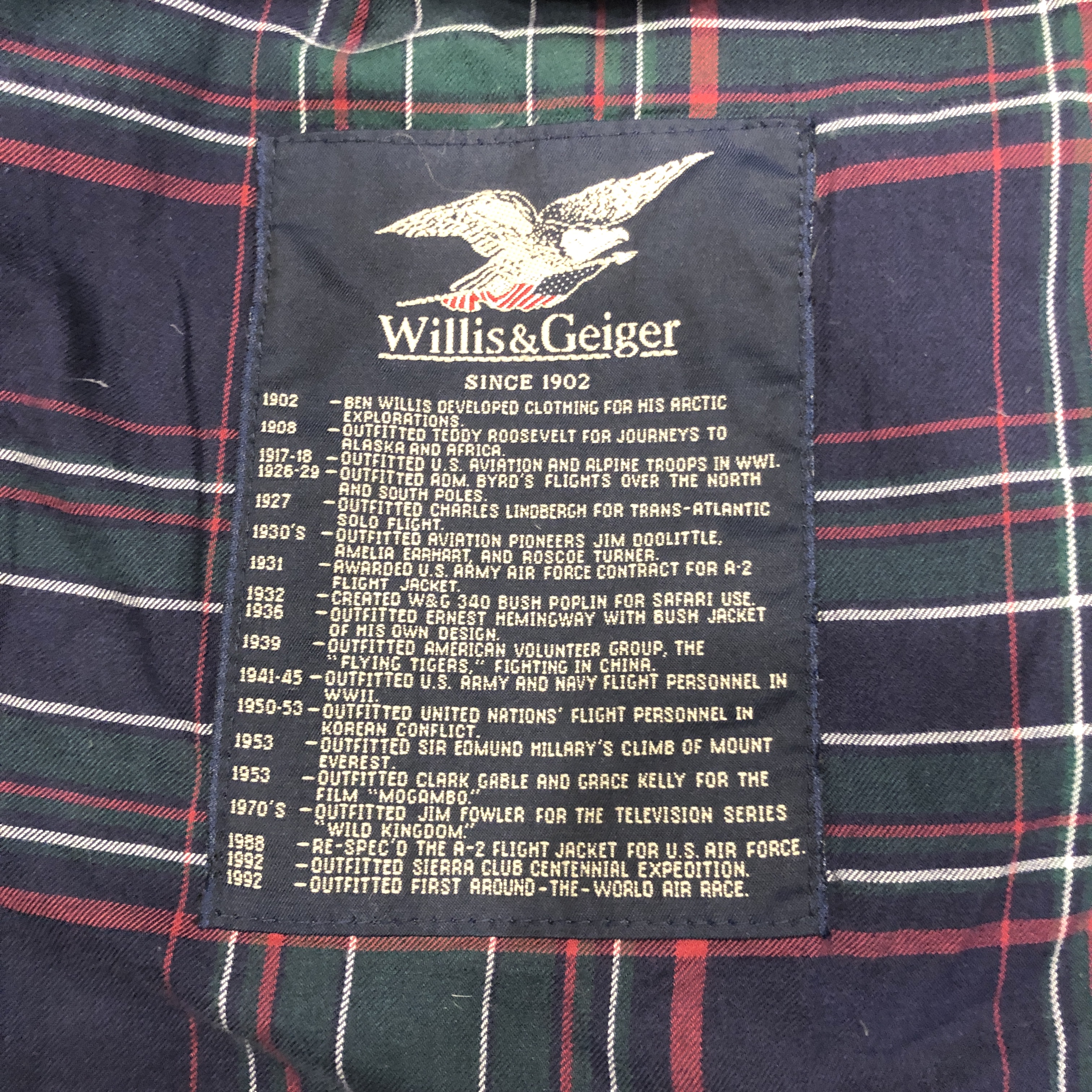 - アメリカ古き良きアウトドア文化の象徴、1902年創業の名門 WILLIS & GEIGER が手掛ける希少な“2WAYフーデッドジャケット”のご紹介です。本体のコットンシェルに象徴的なタンレザーパッチが配された武骨で味わい深い佇まいと、名だたる冒険家たちが愛した同ブランドらしい“ギアとしての服”の迫力が漂う一着。深いオリーブのボディに大容量フラップポケット、ドローコード、比翼のボタンワークなど、すべてが実用本位に設計されています。更に“2WAY構造”の仕組みになっており、内側には単体で着用可能なバーガンディの80%ダックダウン×20%フェザーの中綿キルティングライナーが備わり、象徴的なタータンチェック裏地、そして袖のワッペンが存在感を放つ軽快なダウンジャケットとしても十分成立する完成度です。本体+ライナーで冬まで対応する重衣料、ライナー単体でライトアウター、アウター単体で春秋のフィールドジャケットとして、まさに“三役”をこなす万能アウターであり、BarbourやFilson、Eddie Bauerなどクラシックなアウトドアギアが好きな方には特に響くはず。ヴィンテージW&Gの中でもここまで実用性の強い個体は多くなく、ブランドの真髄である“本物の道具としてのウェア”を味わえる逸品です。