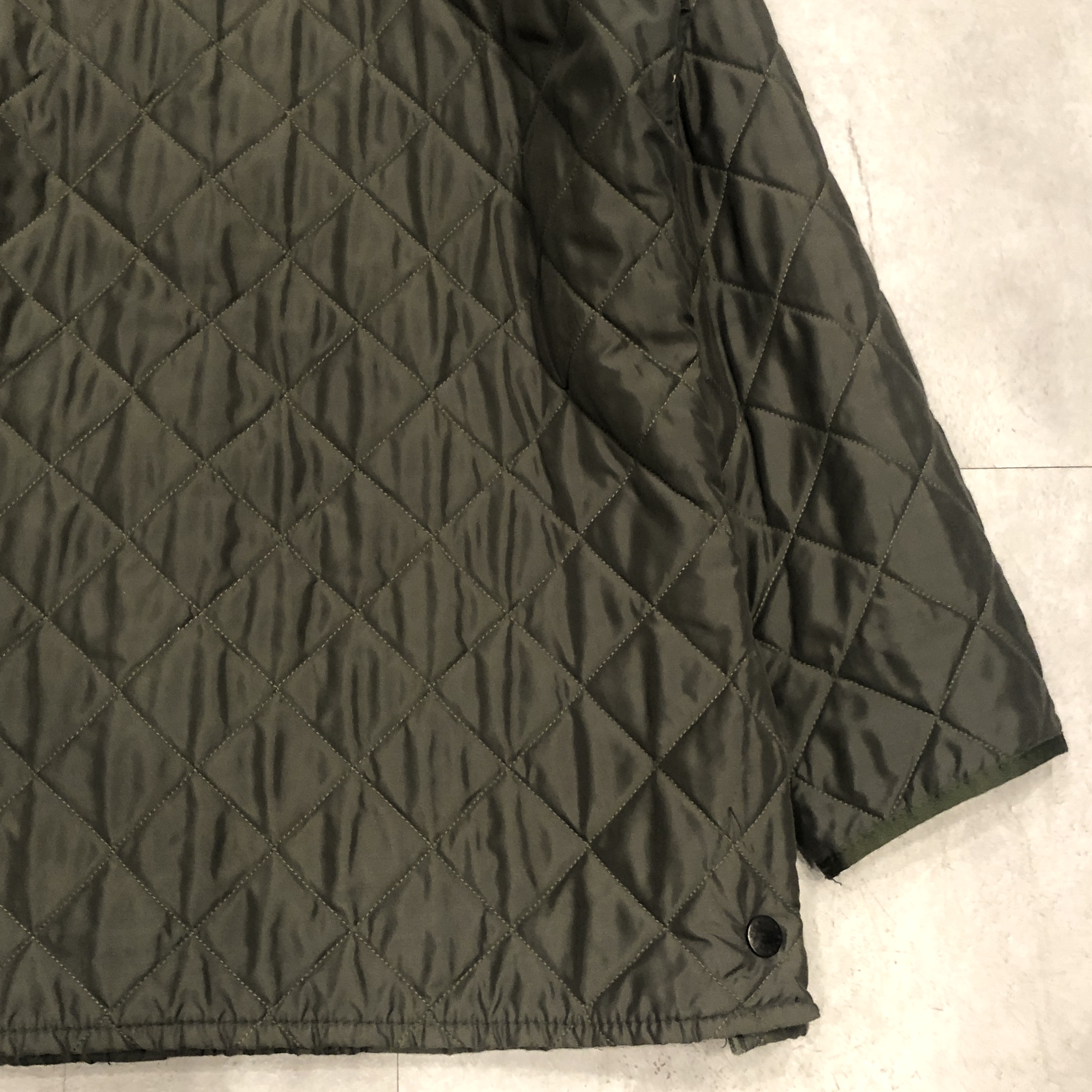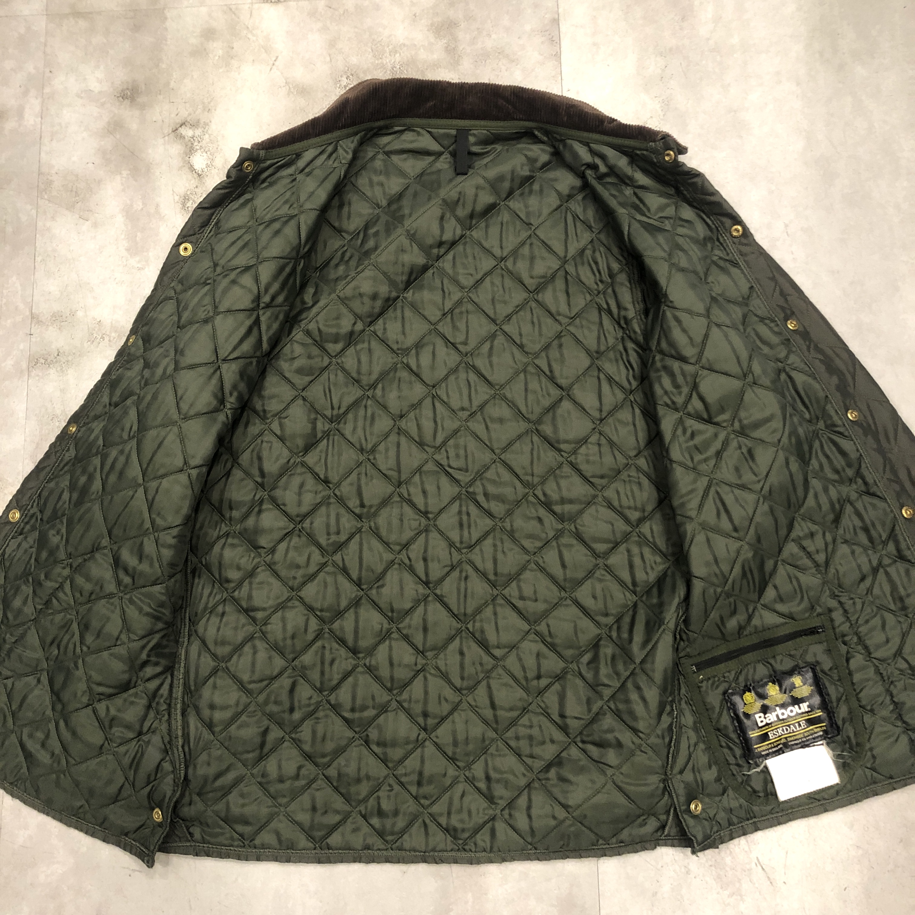 まず目に入るのは、Barbour ならではの“深みのあるオリーブ”。現行には出せない、あの“くすみ感”と“落ち着いた艶”がちゃんと残っているのがポイント。