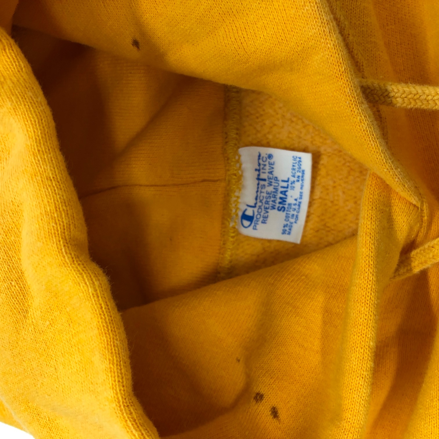 - 画像の様に、首元内側にシミ、右袖に小穴があります。