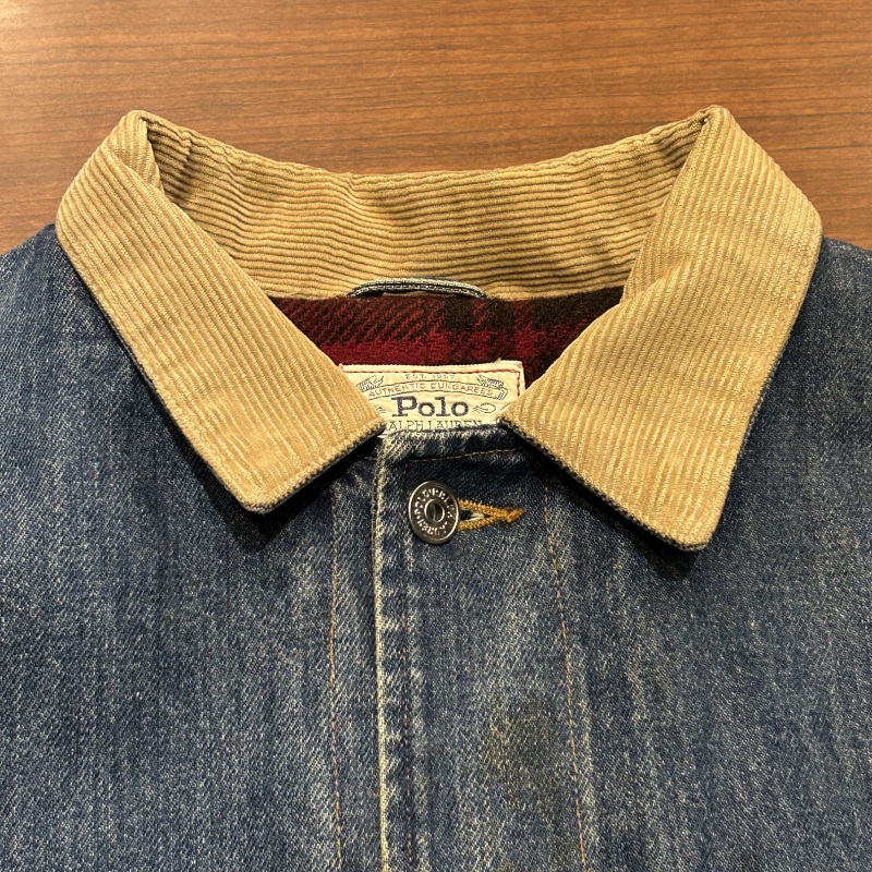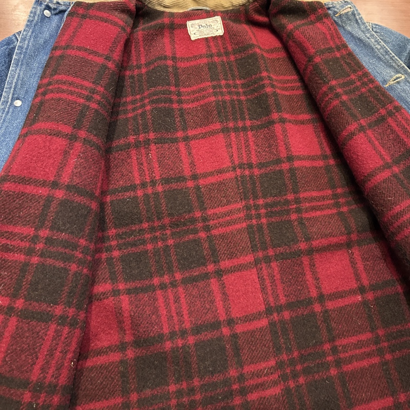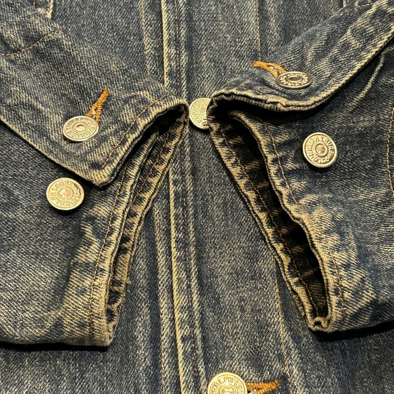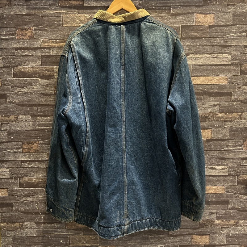 - 袖や裾など複数箇所にシミ、袖裏地のステッチ抜け、デニム特有の色落ちやアタリ等の着用感がございます。その他に目立つ汚れやダメージ等は無く、古着慣れされた方におすすめです。