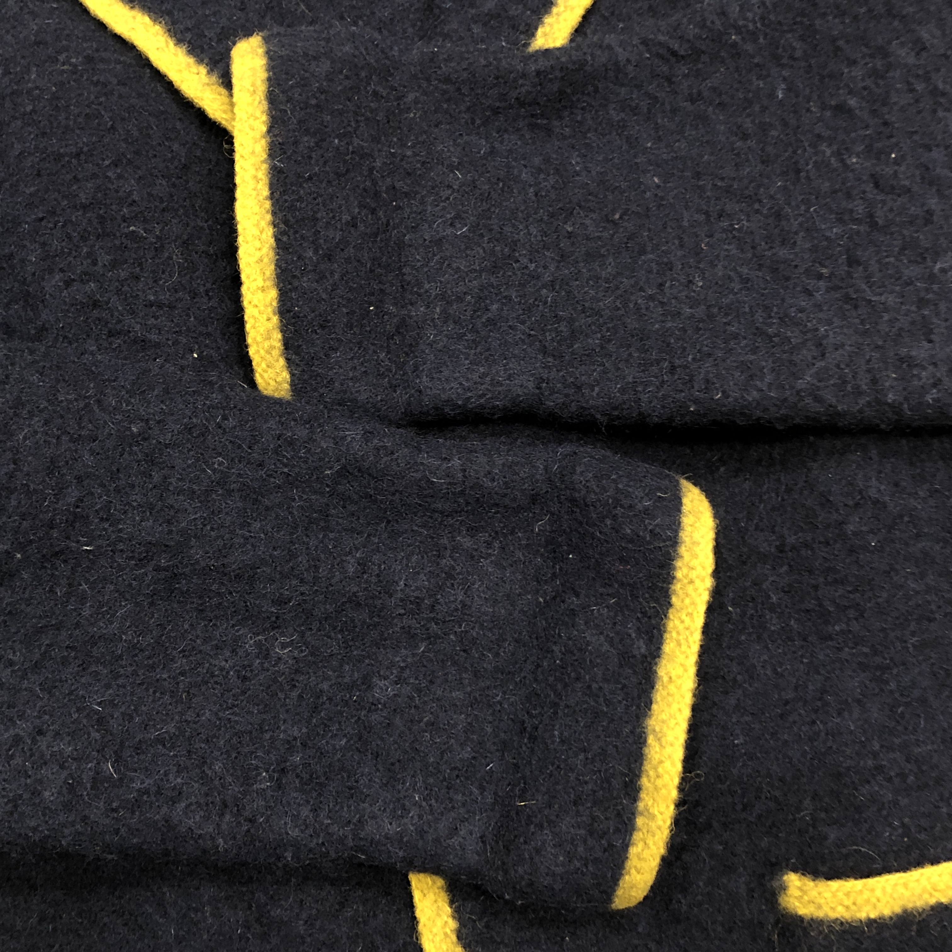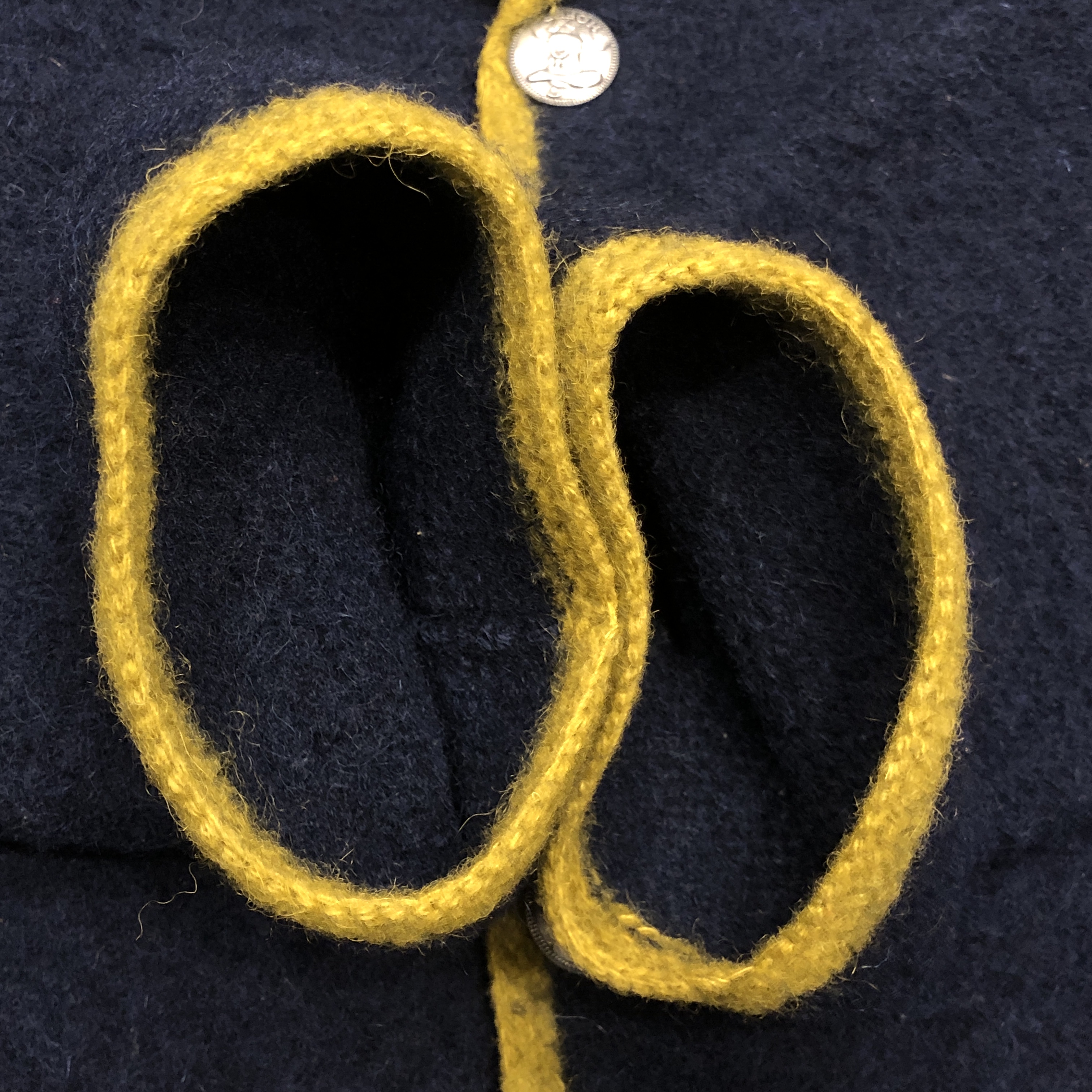 最大の魅力は、高貴なネイビーベースに施されたくすんだイエローのトリムと、コインモチーフのメタルボタン。チロル地方のクラフト文化と歴史が、こうしたディテールに色濃く息づいています。