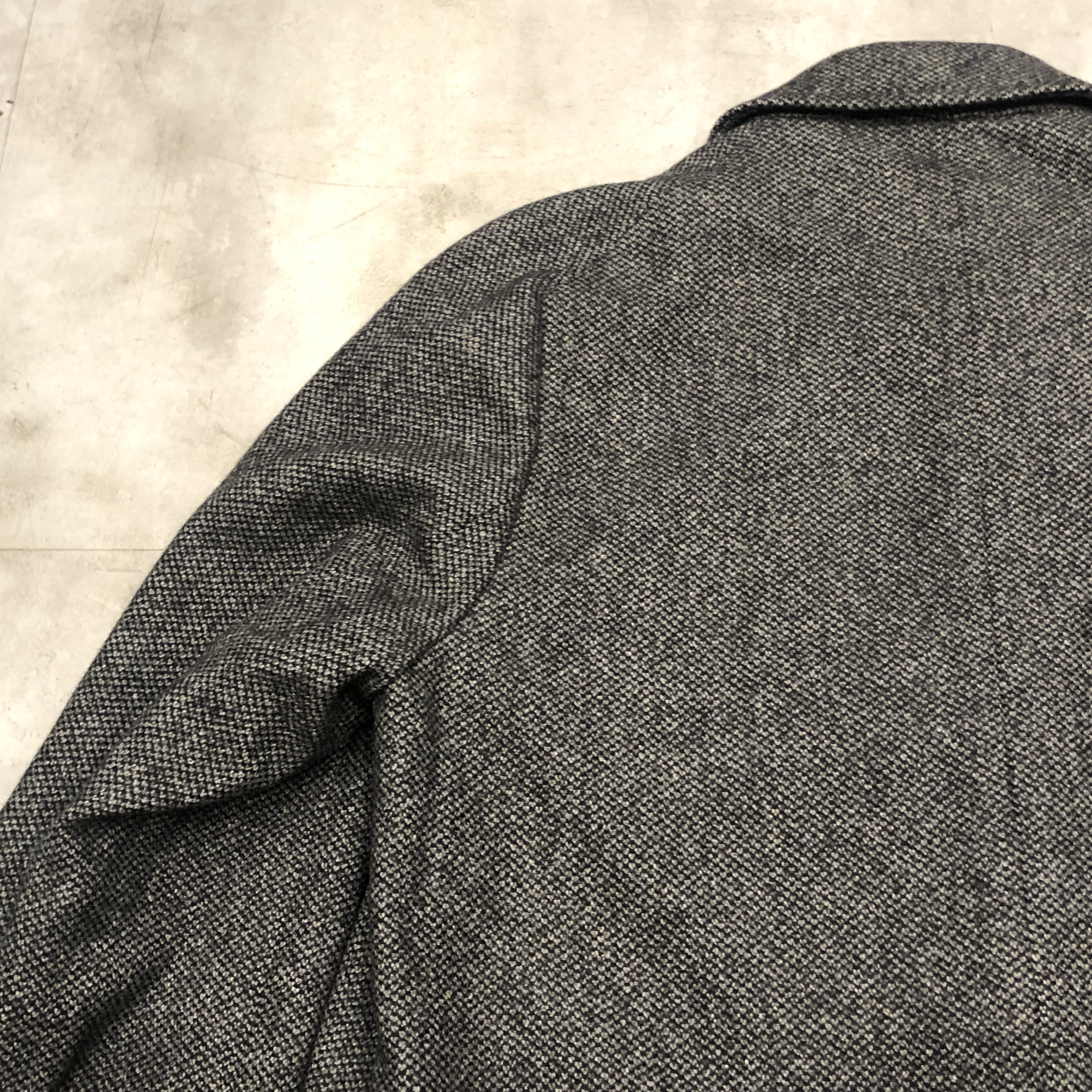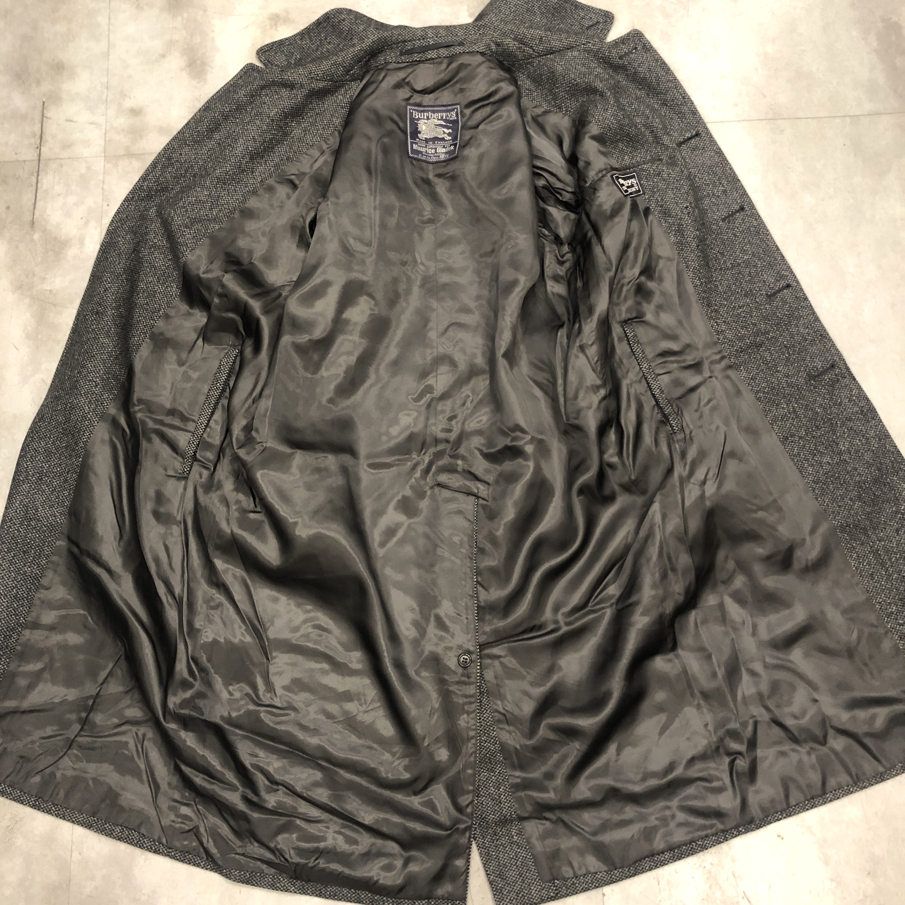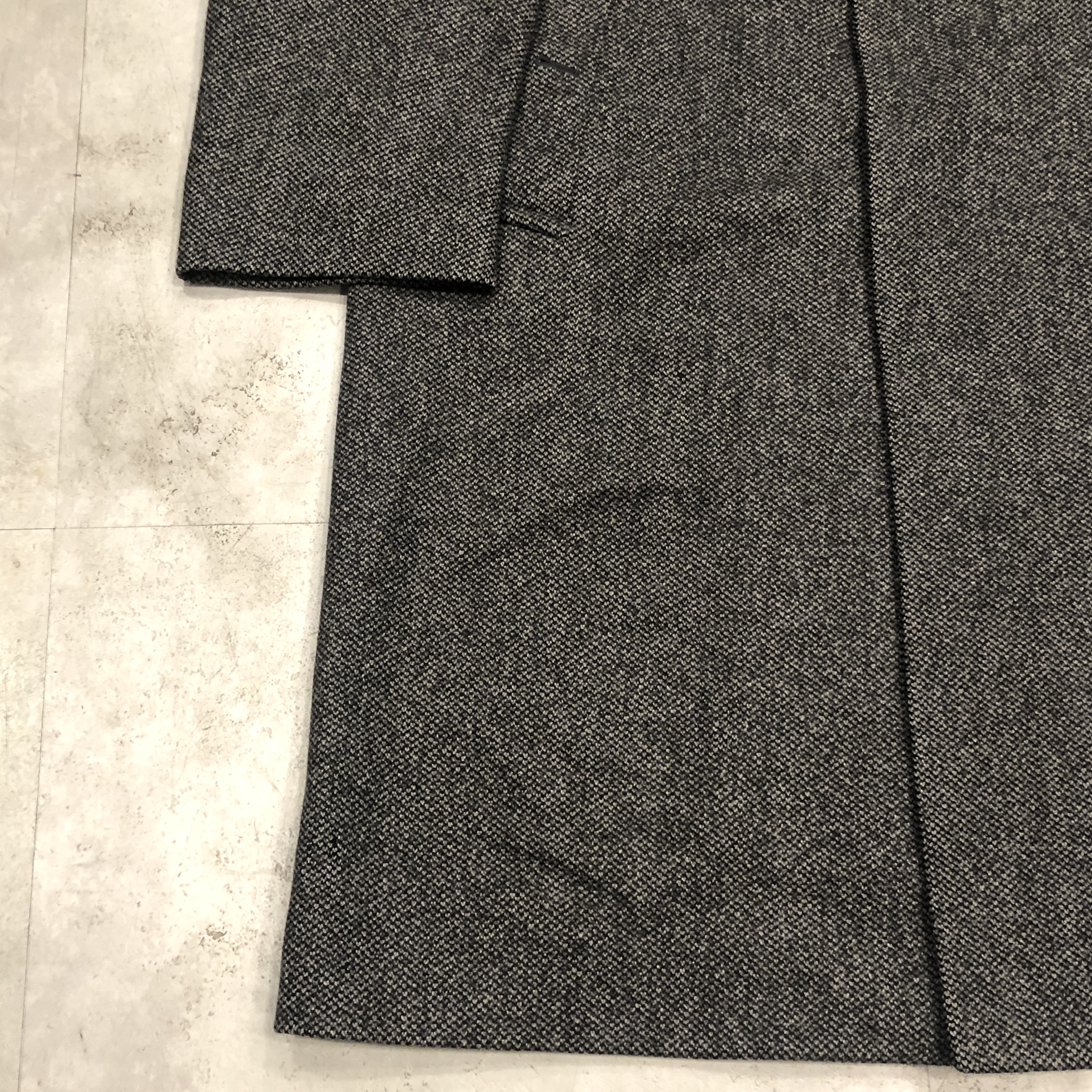 BURBERRYのスコティッシュサクソニーのサドルショルダーコートのご紹介です。グレーベースの細かなミックスツイードは、スコットランド製サクソニーウール(タグ表記100%WOOL)ならではのふくらみと柔らかさがありつつ、ぎゅっと目が詰まっていて冬場のアウターとしてとても心強い質感。肩は所謂サドルショルダーで、シルエットが実にエレガントです。フロントは比翼仕立てで、余計な装飾を削ぎ落としたミニマルな表情ですが、裏側には「MADE EXPRESSLY FOR Maurice Gladek, METZ」と入るスペシャルタグが付き、ヨーロッパの高級紳士服店別注で仕立てられたグレードの高さがうかがえます。ライニングは100%ビスコースで袖通しなめらか、サイズは表記46 REGのゆったりとしたフィッティング。スーツの上からガバッと羽織ってもシルエットが崩れにくく、ニット+デニムに合わせて少しラフに着崩してもサマになる、まさに“上質な日常着”としてのバーバリーの真骨頂を味わっていただけるコートだと思います。