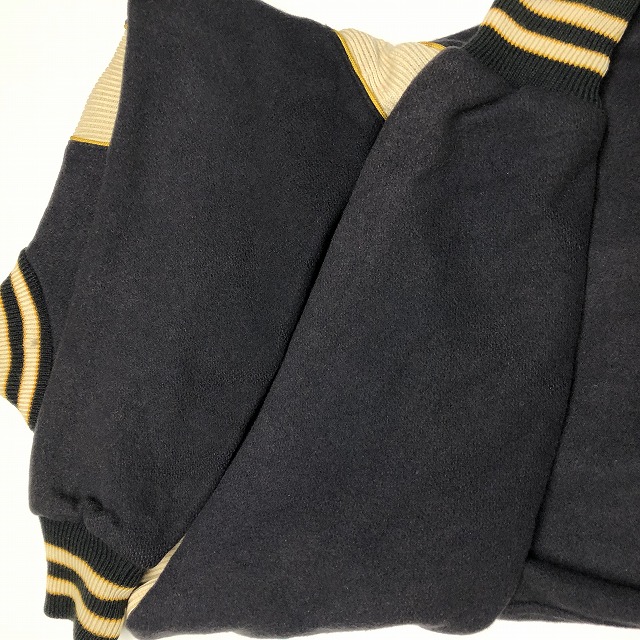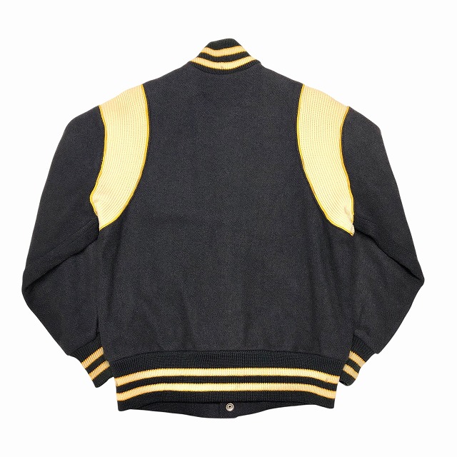 肩にリブの切り替え、黒のスナップボタン、各リブは黄色×白×黒のボーダーです。