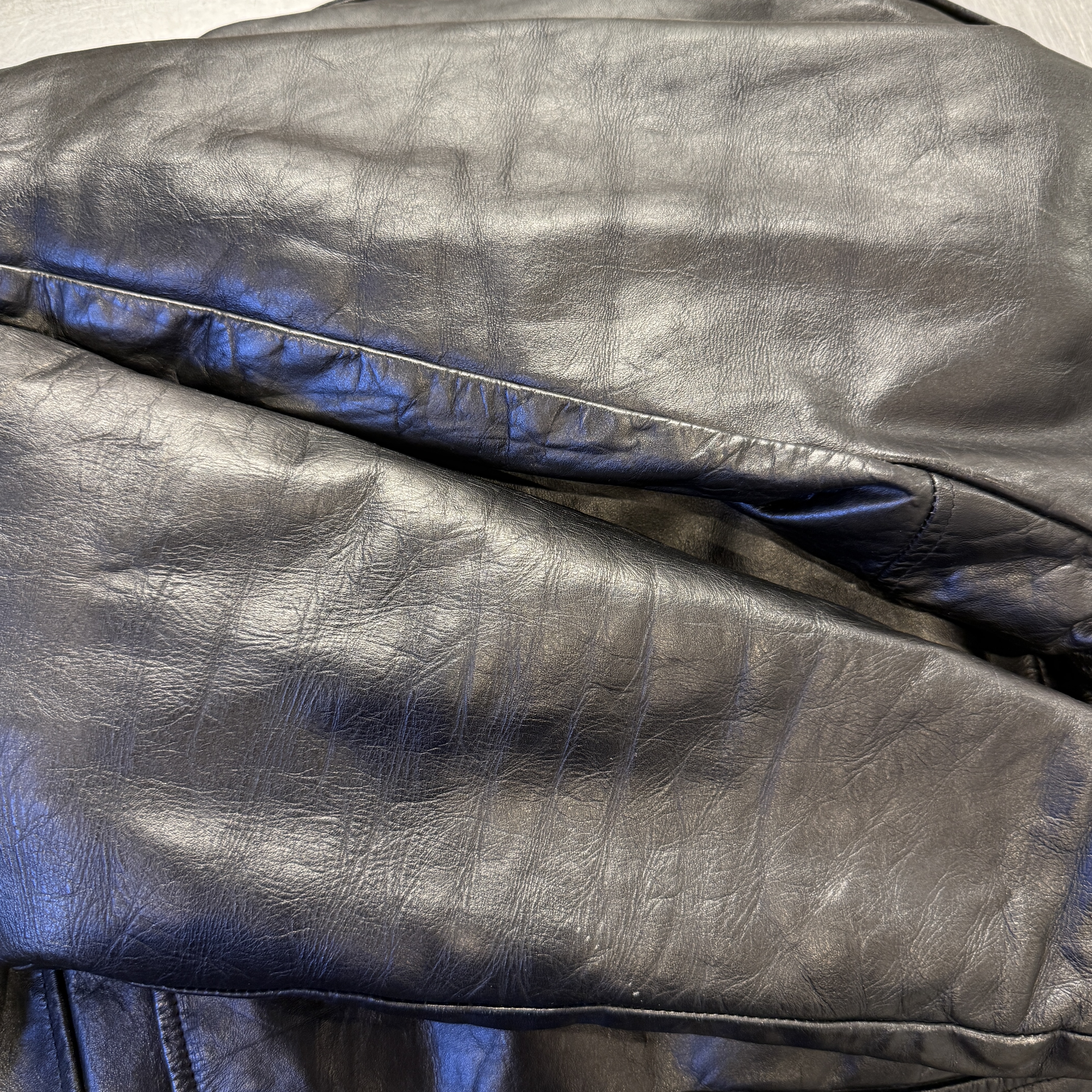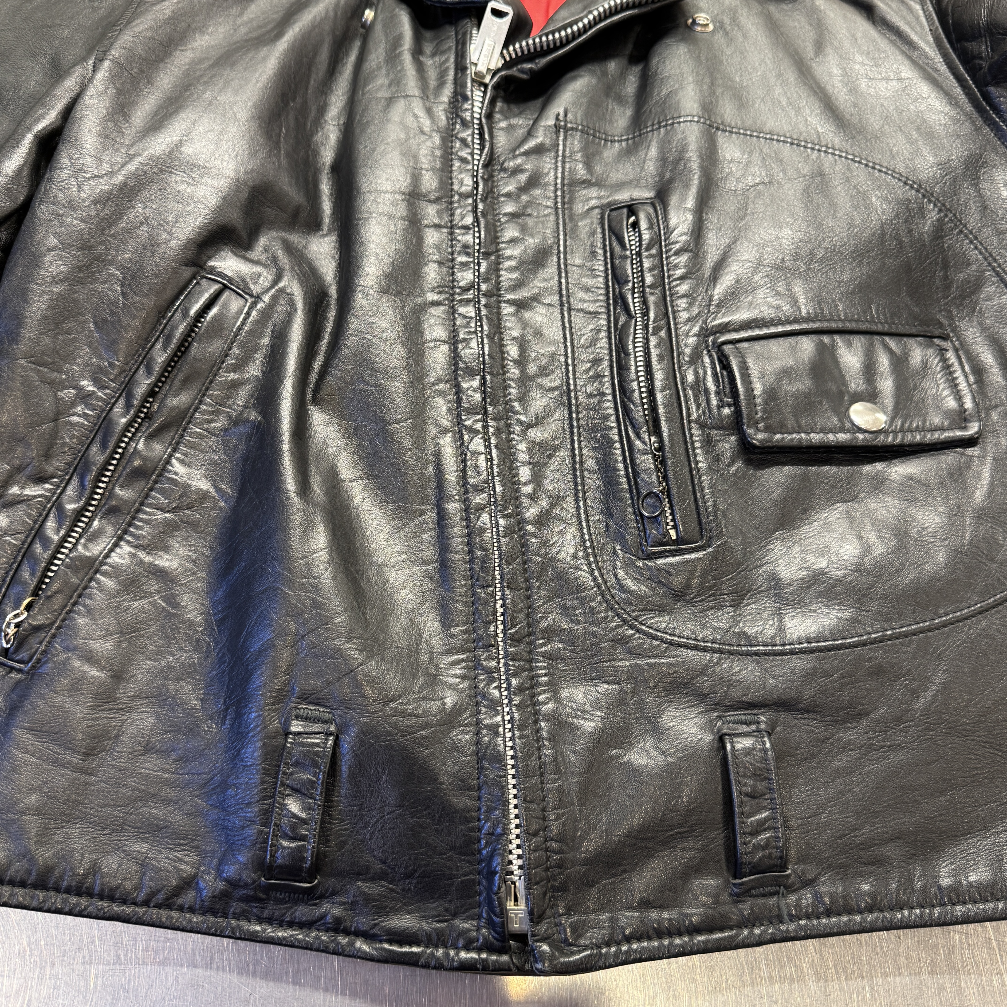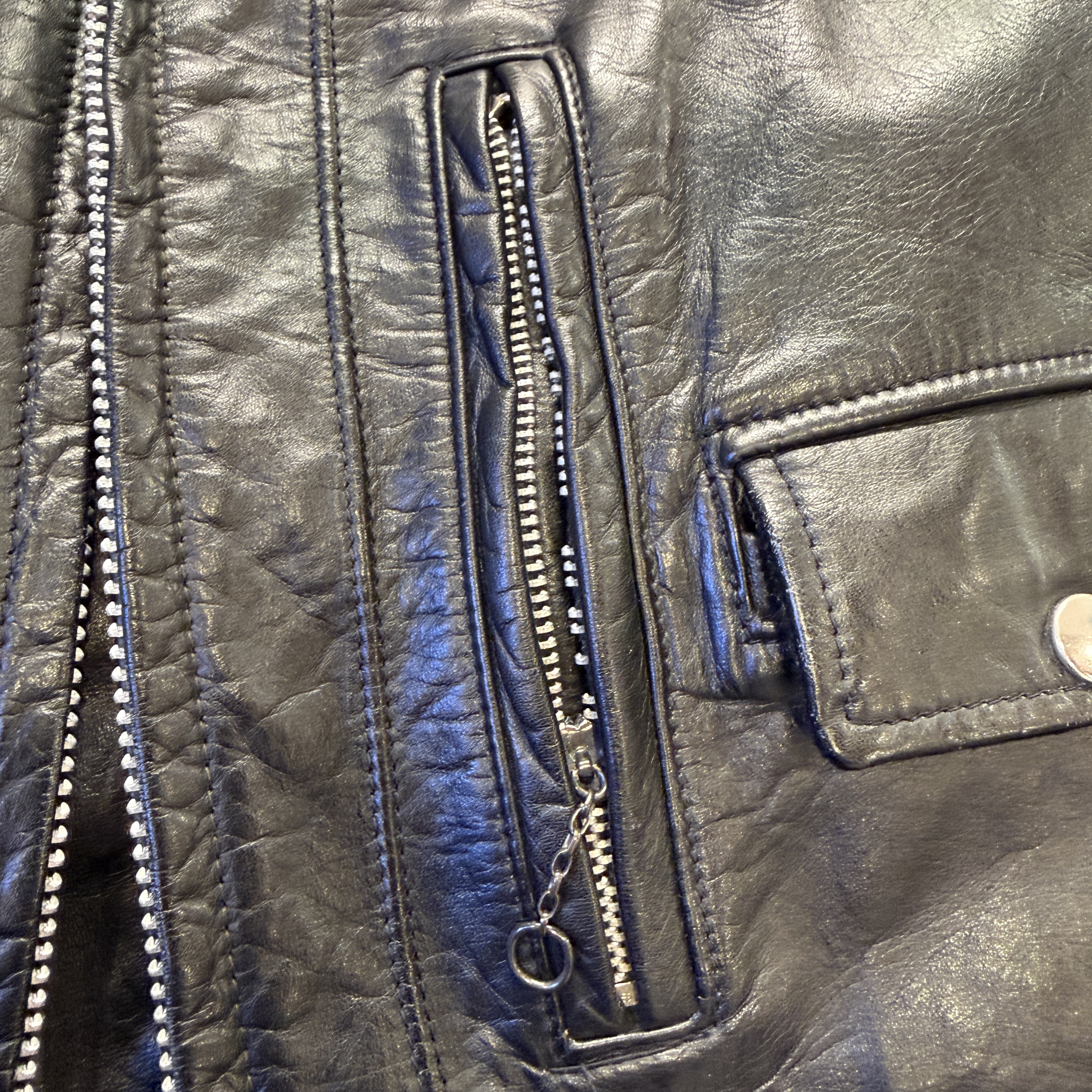 - 画像の様にレザー特有のスレやシワやスレ、左胸部分のジップ不良等の着用感ございますが、問題なく着用可能な状態です。