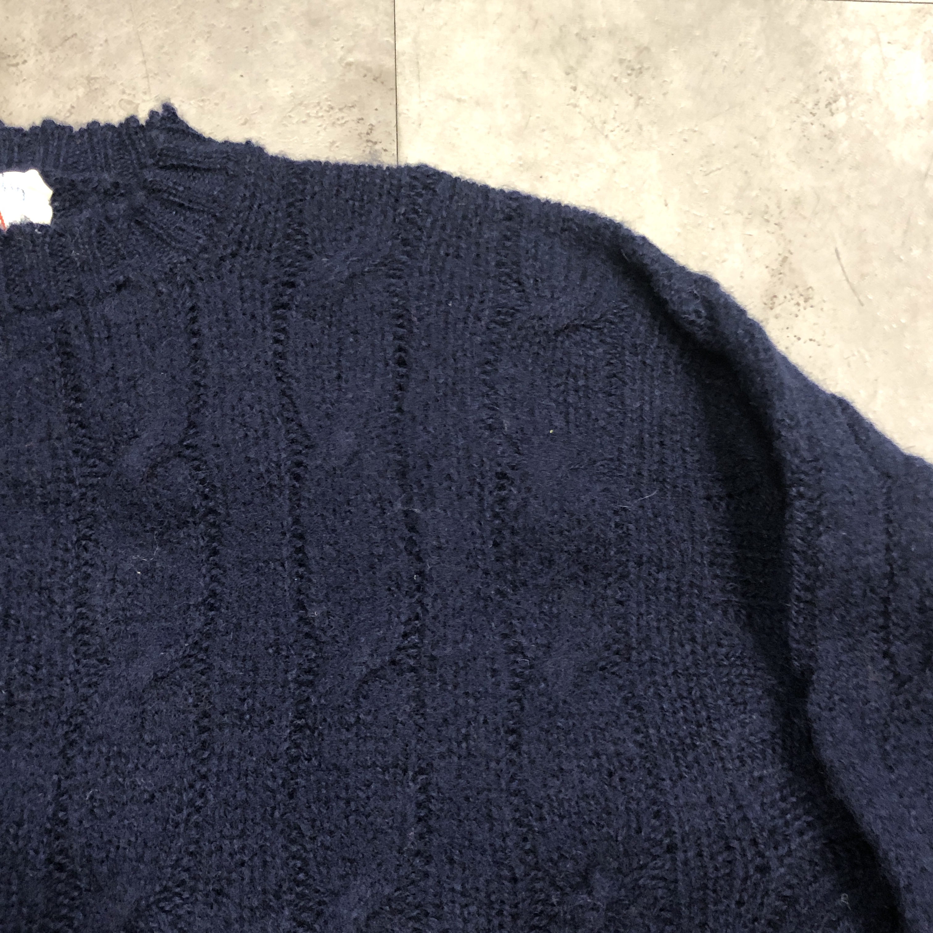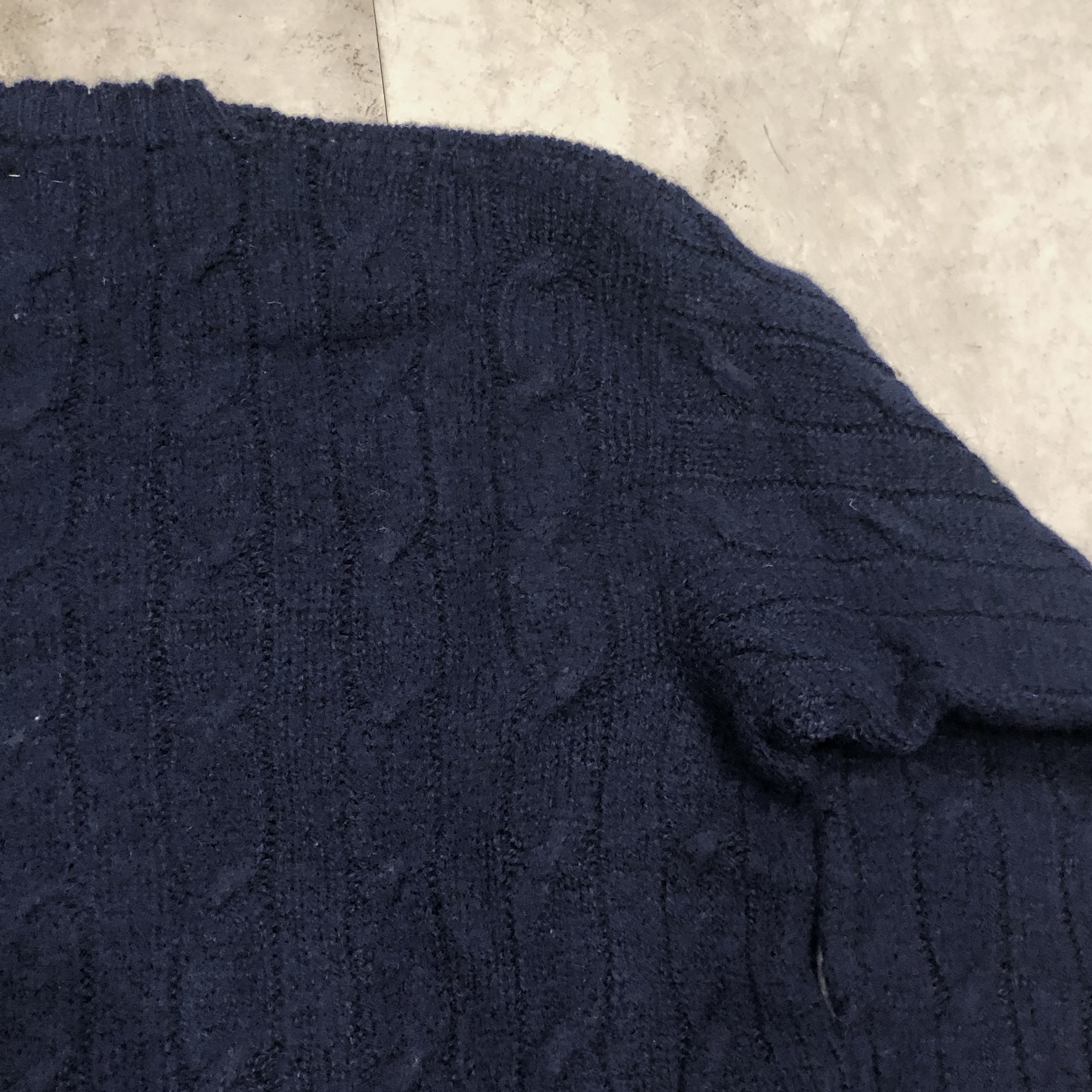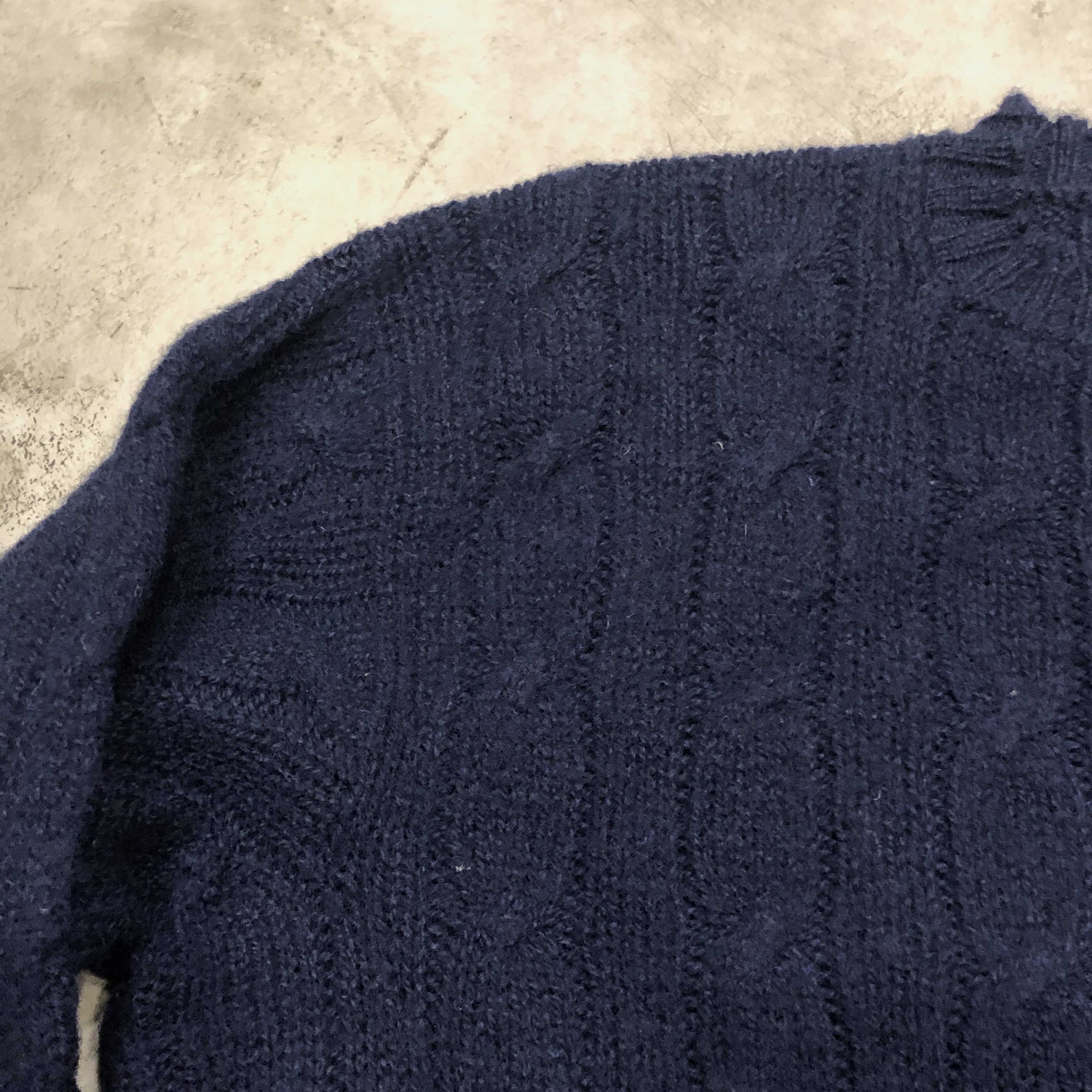 深みのあるネイビーカラーに、クラシックなケーブル編み。