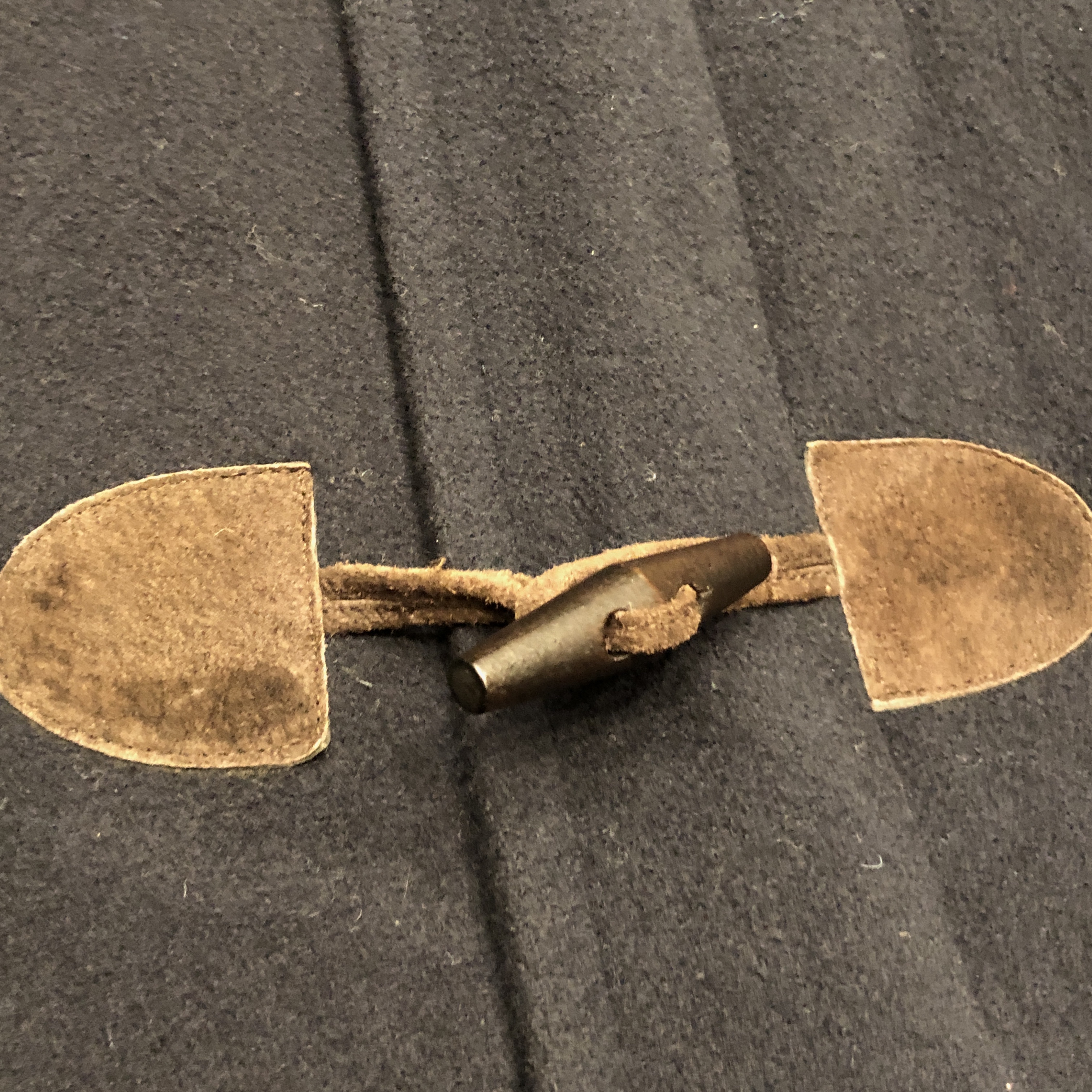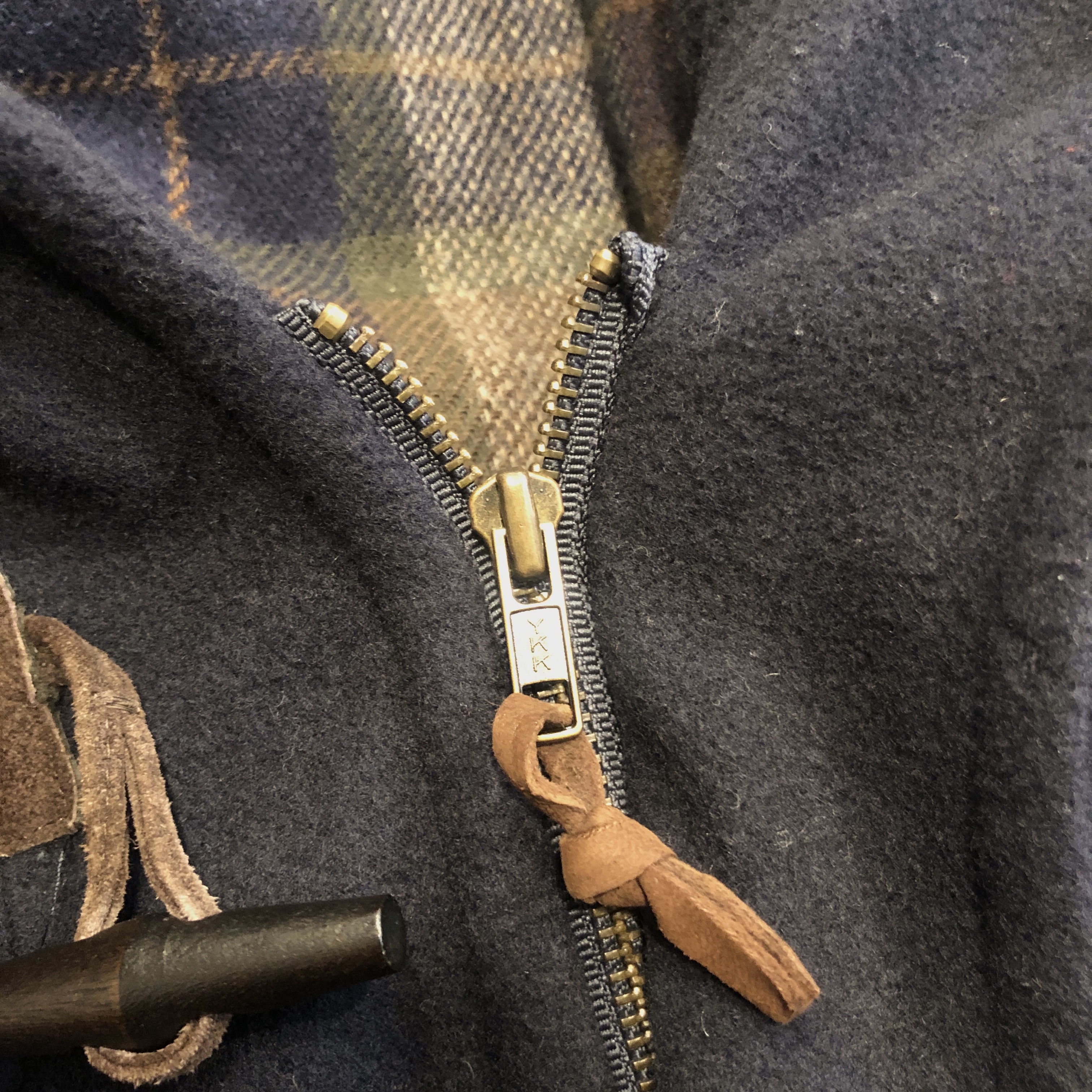 フロントのトグルはレザー×木製トグルの王道仕様。