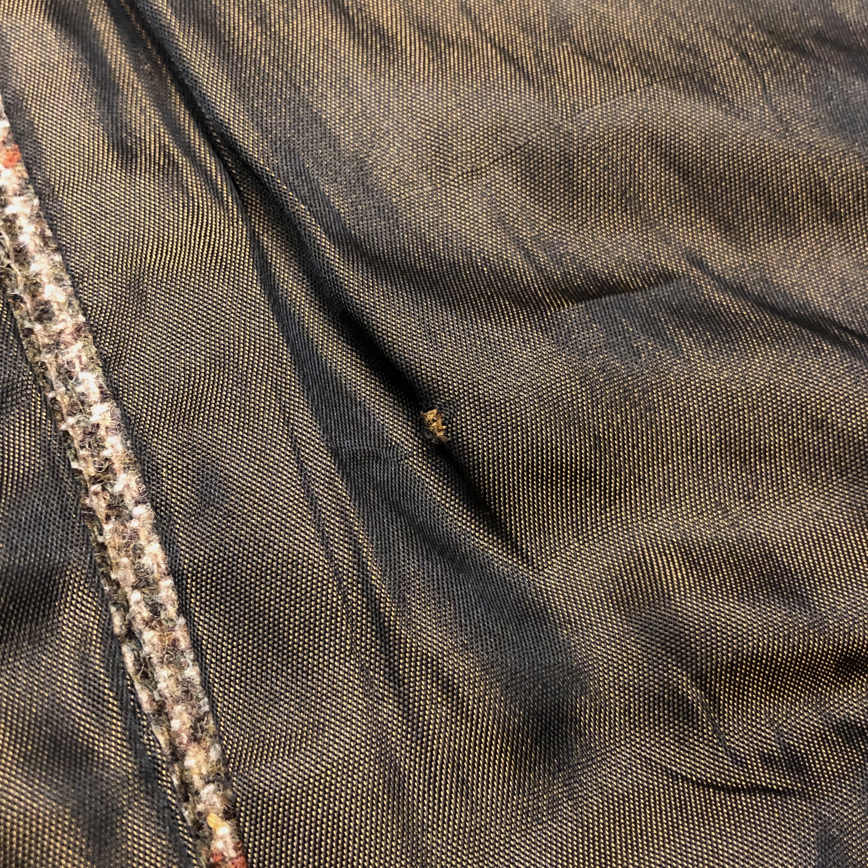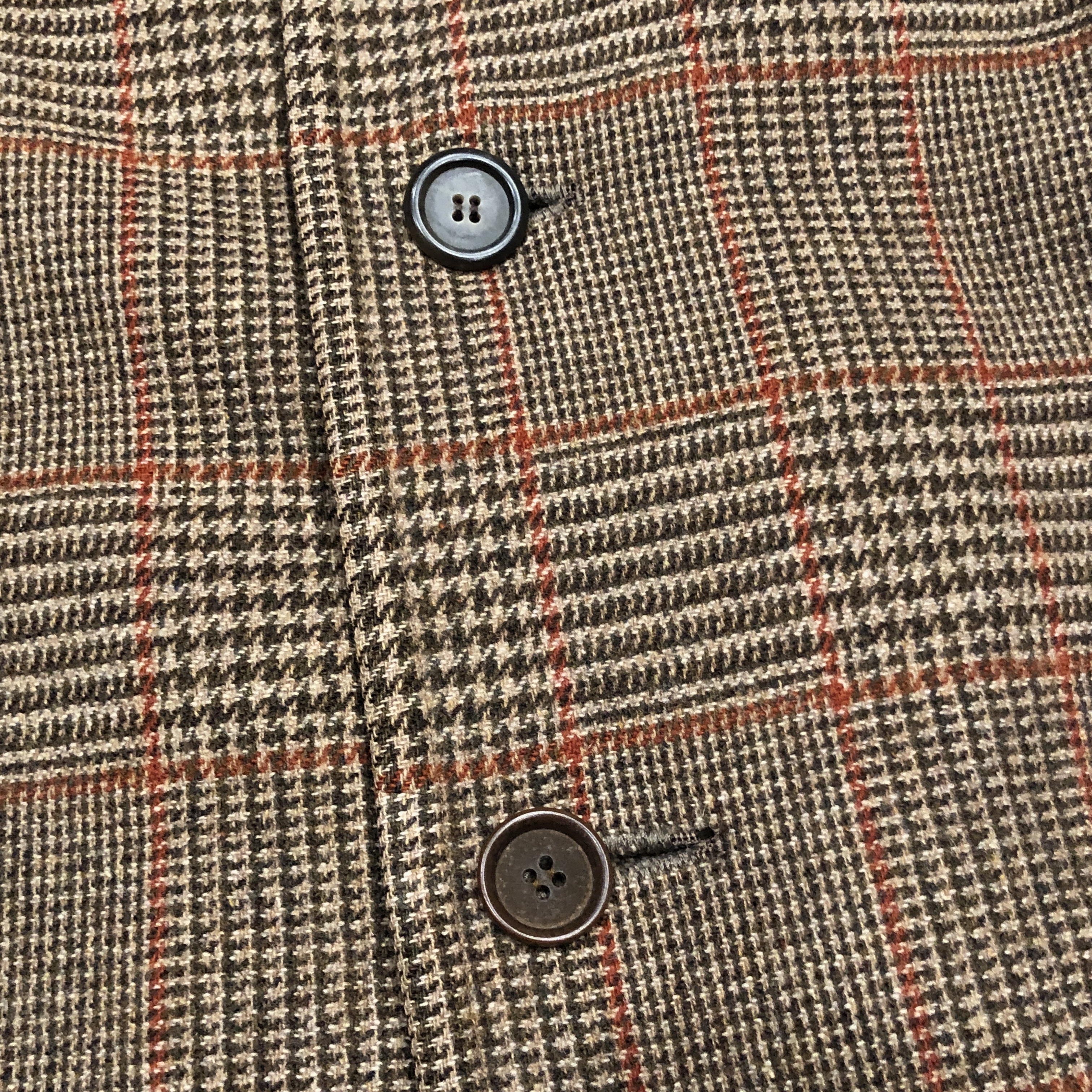 年代相応の着用感、内側裾付近のダメージ、内側左脇下のリペア跡等が画像の様にございますが、古着慣れされている方でしたら問題なくお使いいただける範囲です。正面一番下のボタンが画像の様に色目の異なる物となっております。