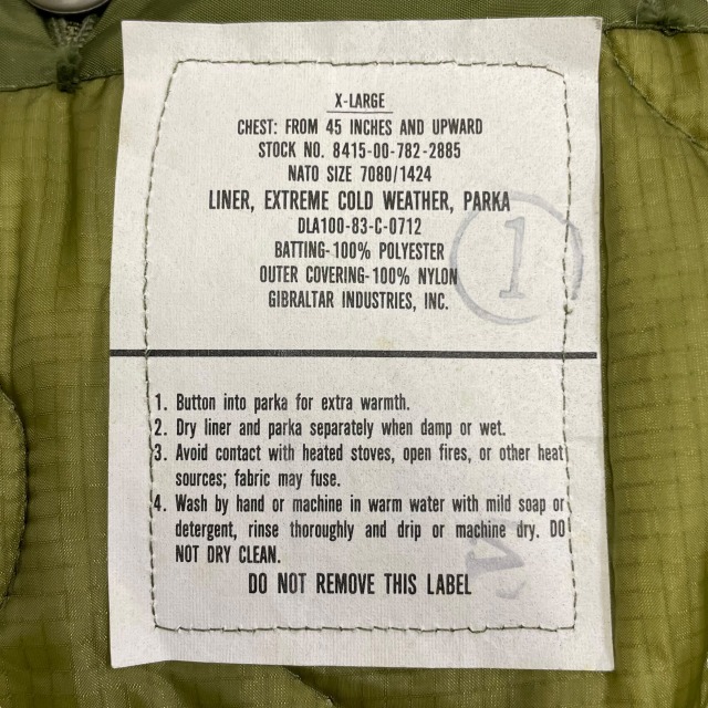 「デッドストック、ライナー付き、XL」