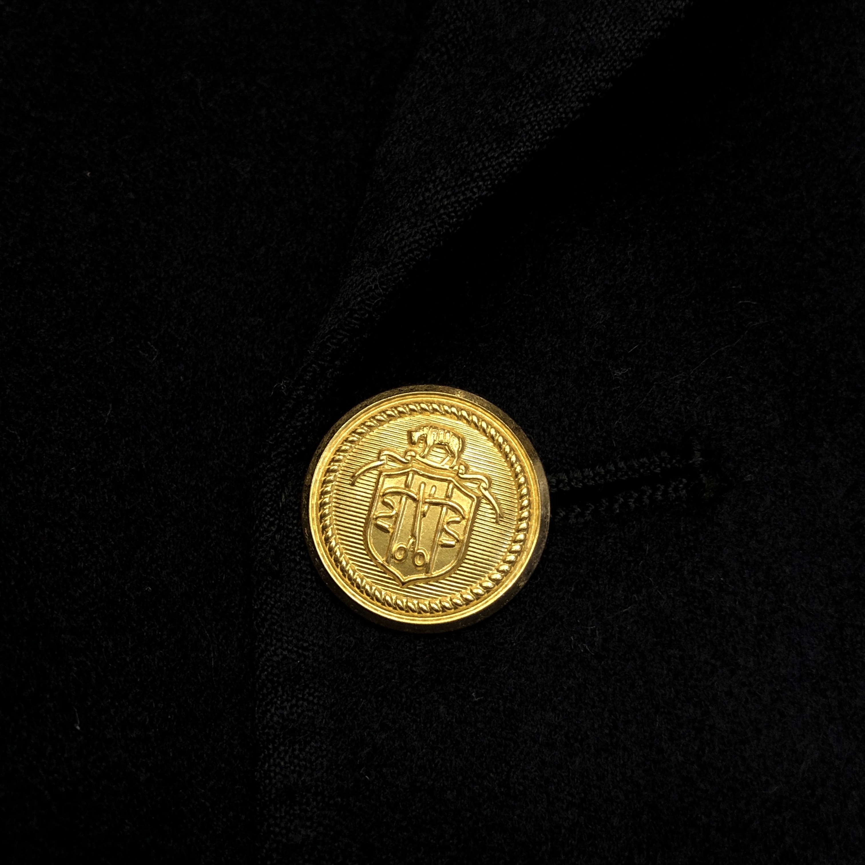 ゴールドボタンが醸し出す格式と、ダークネイビーの奥深いトーンが絶妙に響き合い、タイドアップはもちろん、デニムとのカジュアルな合わせにも映えます。