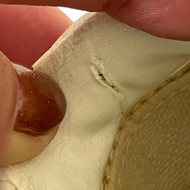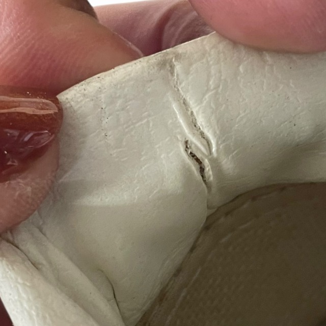 踵のレザー部分に破れがあり、ソールに減りがございますが、現状は着用可能な状態です。