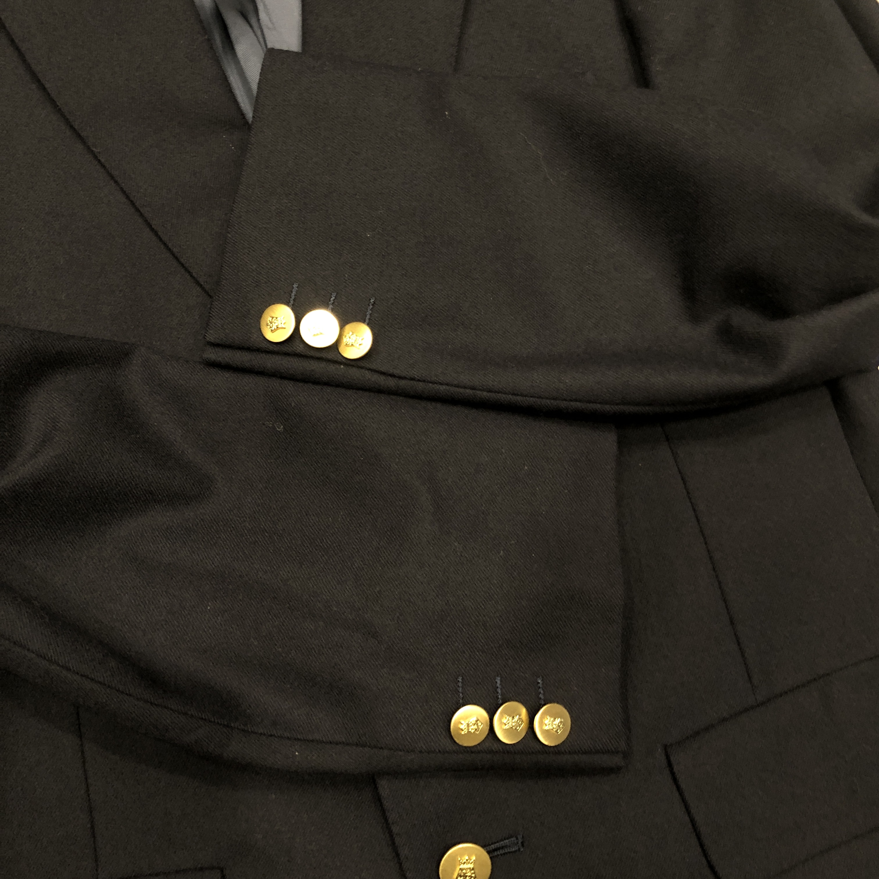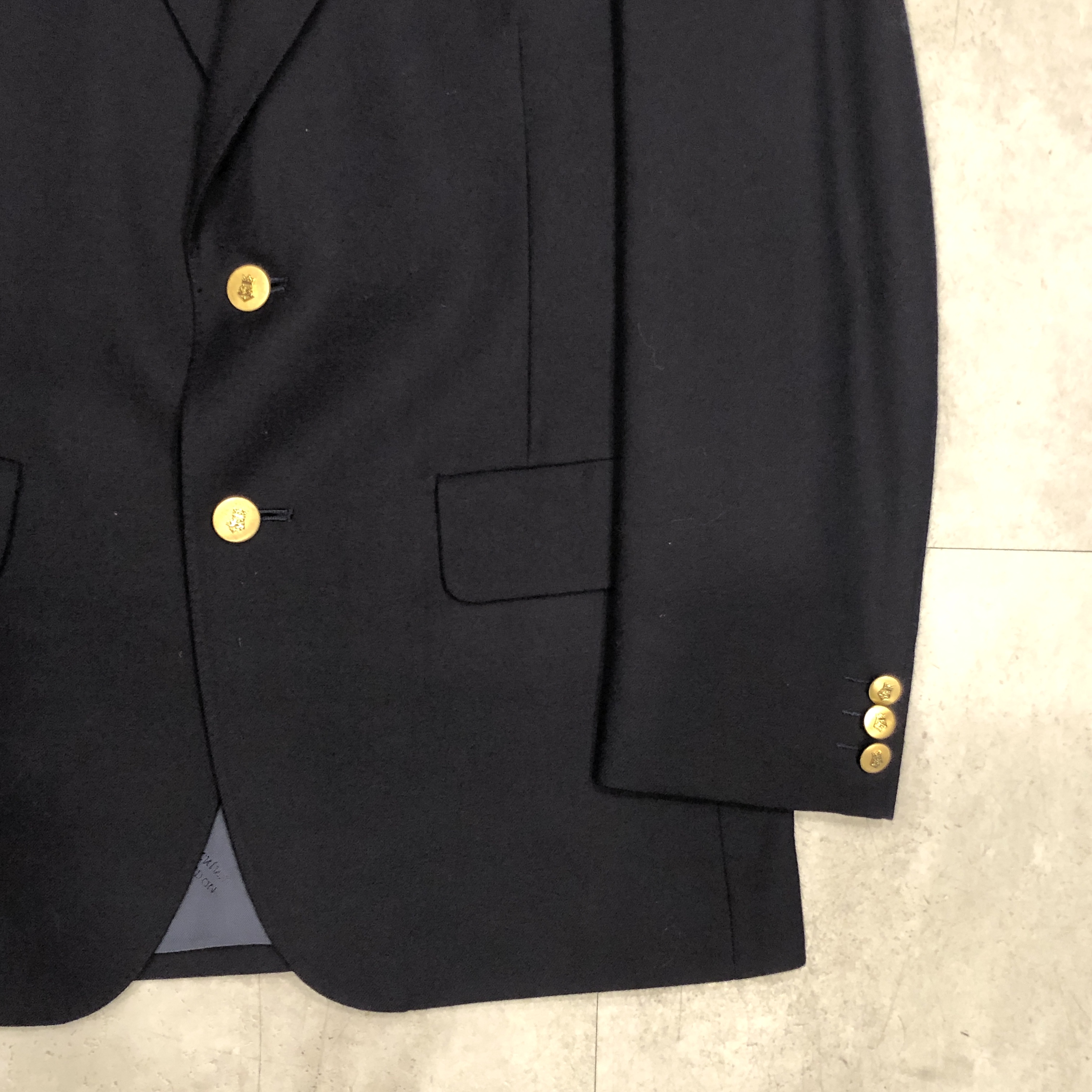 ライニングにまで散りばめられたロゴ、重厚感ある金ボタン、まさにクラシック・ブリティッシュの美学を体現したようなブレザーです。