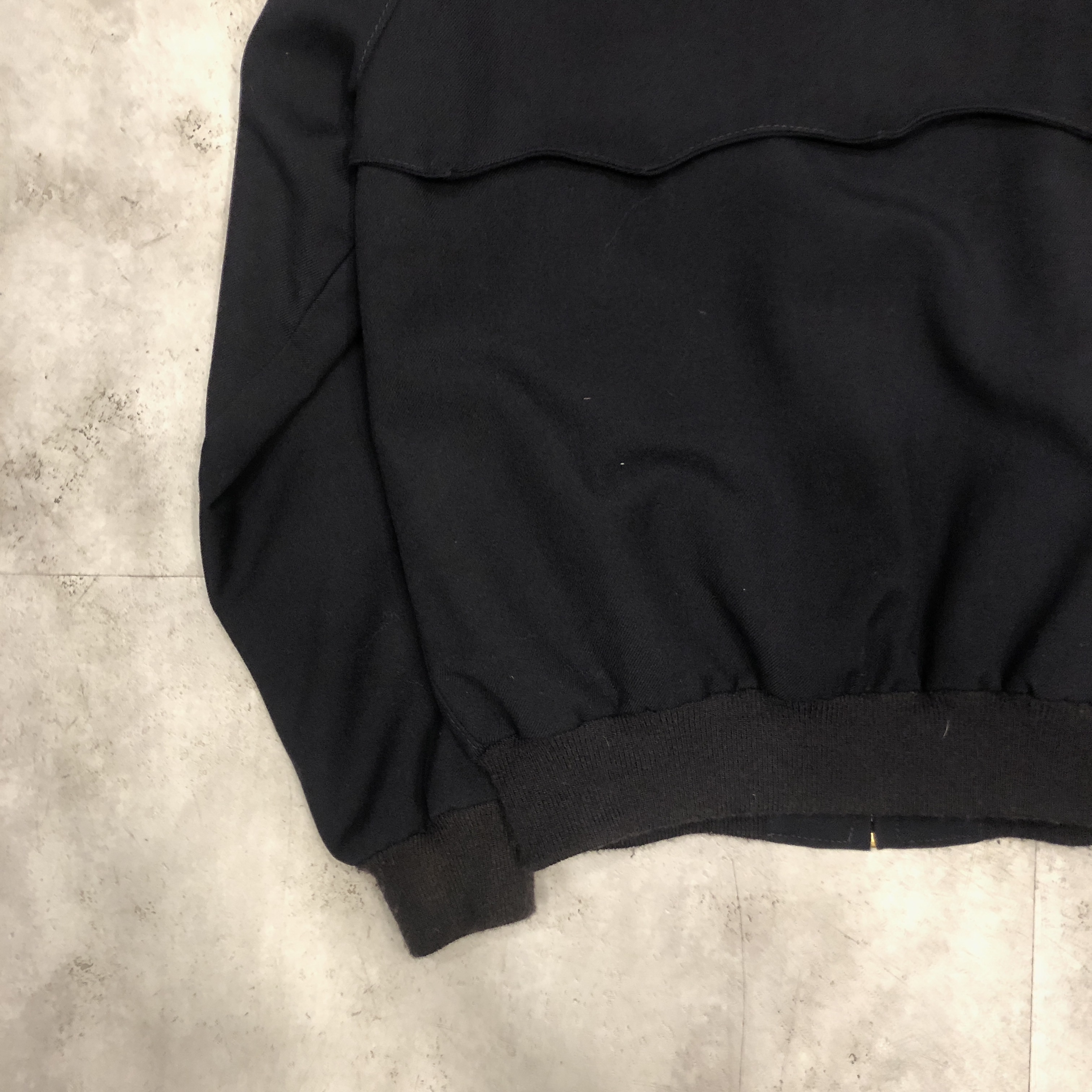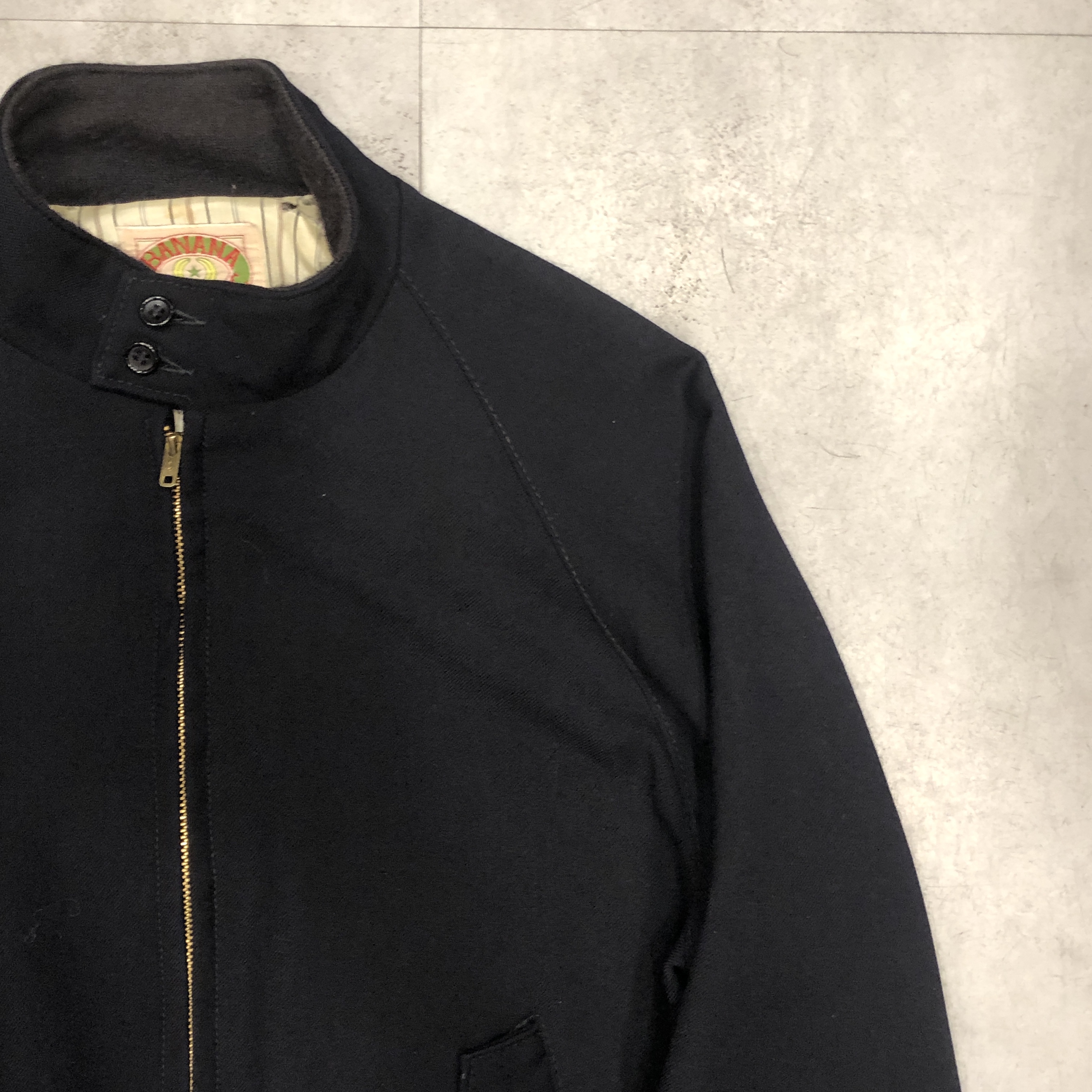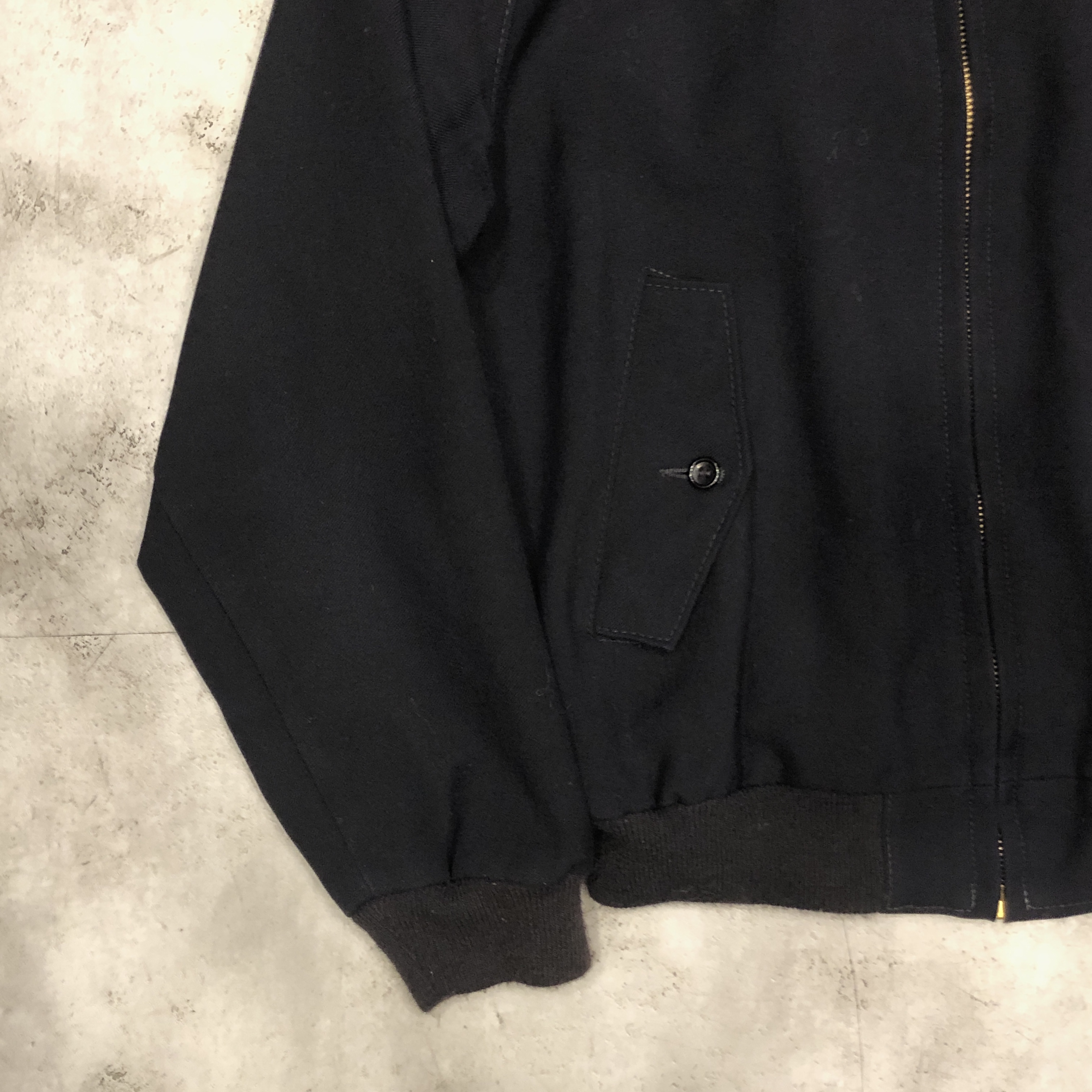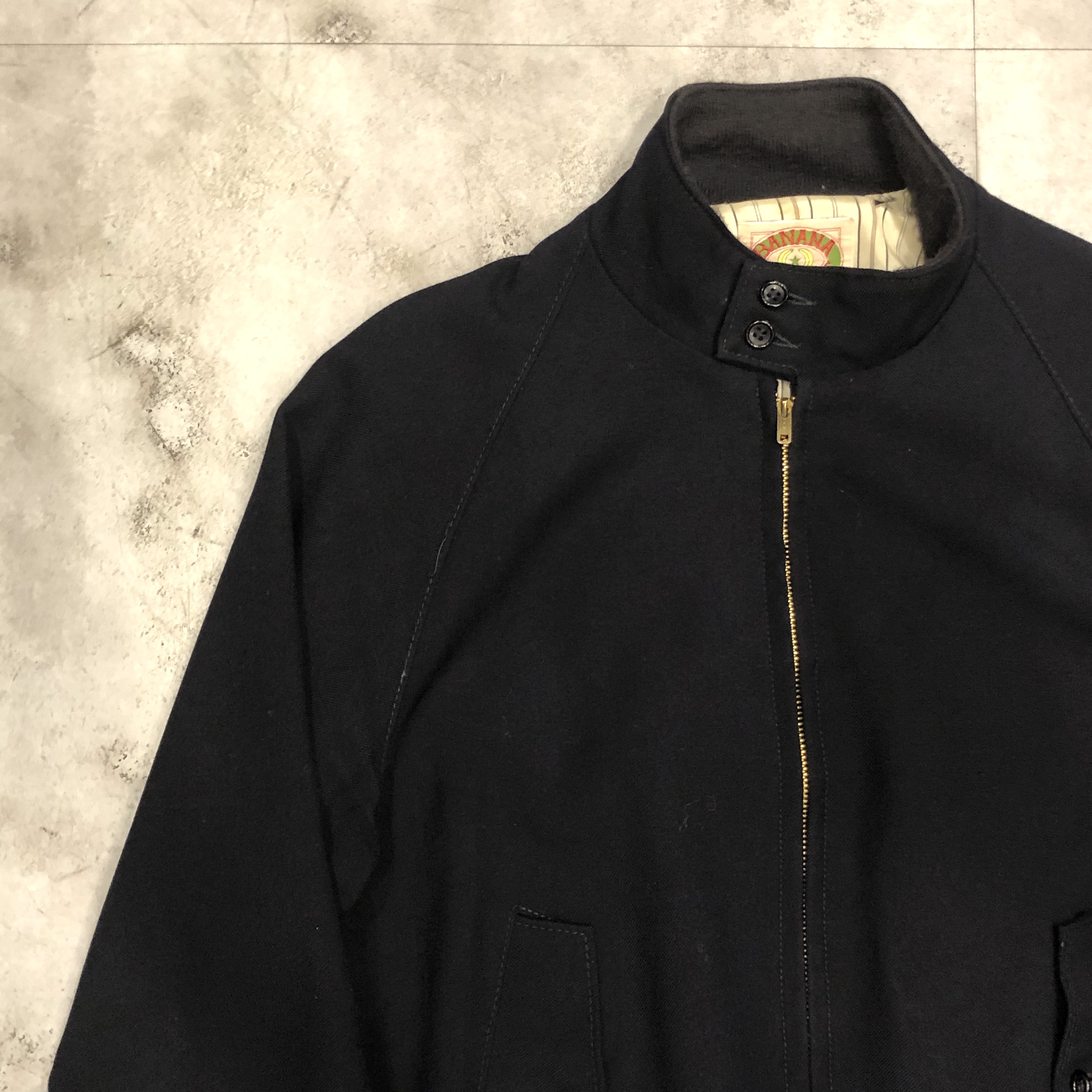 ウールギャバジンならではの深いネイビーの光沢、しっとりとした落ち感、柔らかく体に馴染む質感は、現代の生地では再現が難しく、ヴィンテージ特有の“時間の重み”が宿っています。スタンドカラー+チンストラップ、ラグランスリーブ、裾と袖口のリブ仕様、ゴールドのフロントジッパー、背面ヨークの独特なカッティングなど、ハリントンジャケットのスポーティさと上品さが絶妙に同居する、当時のバナリパらしいデザインも魅力です。