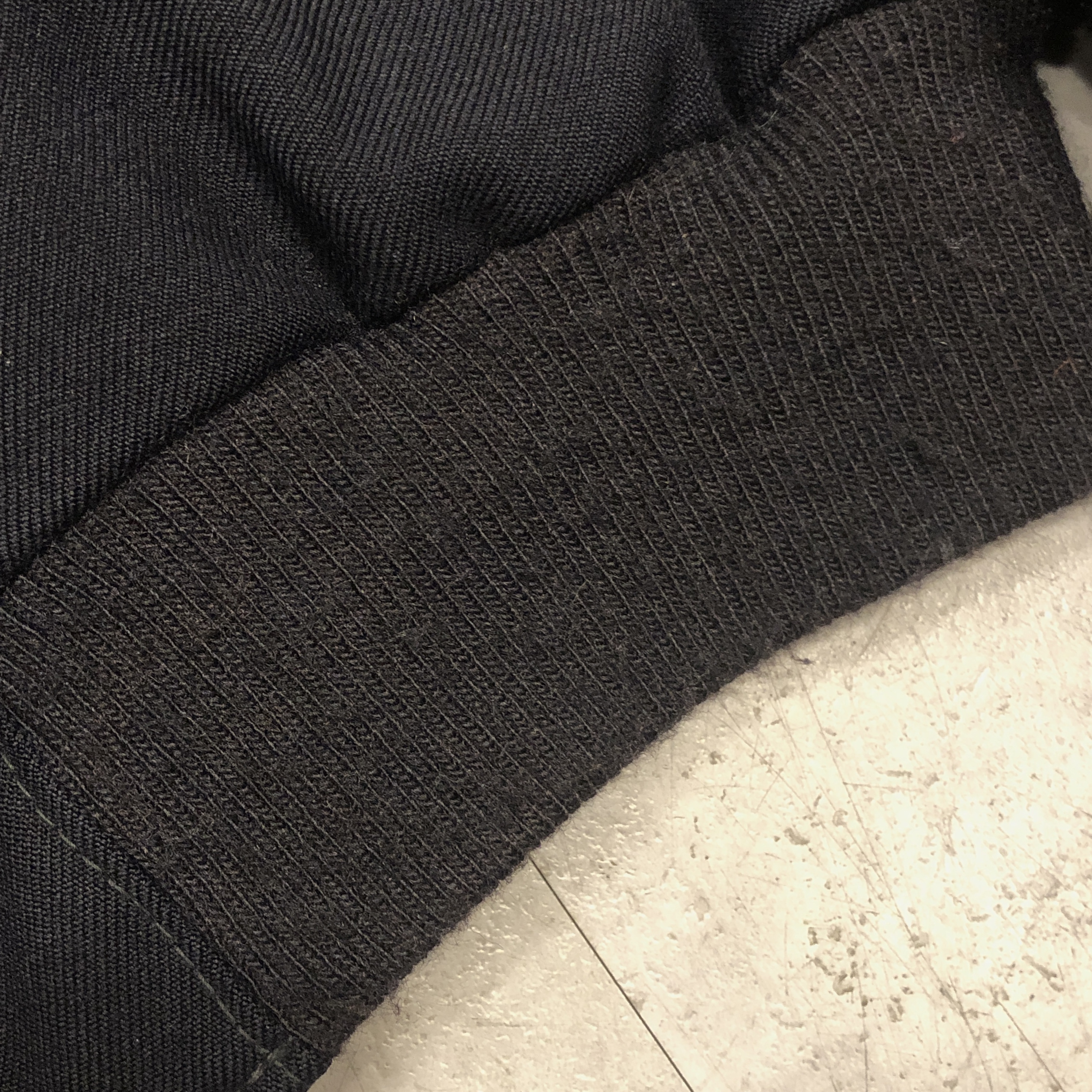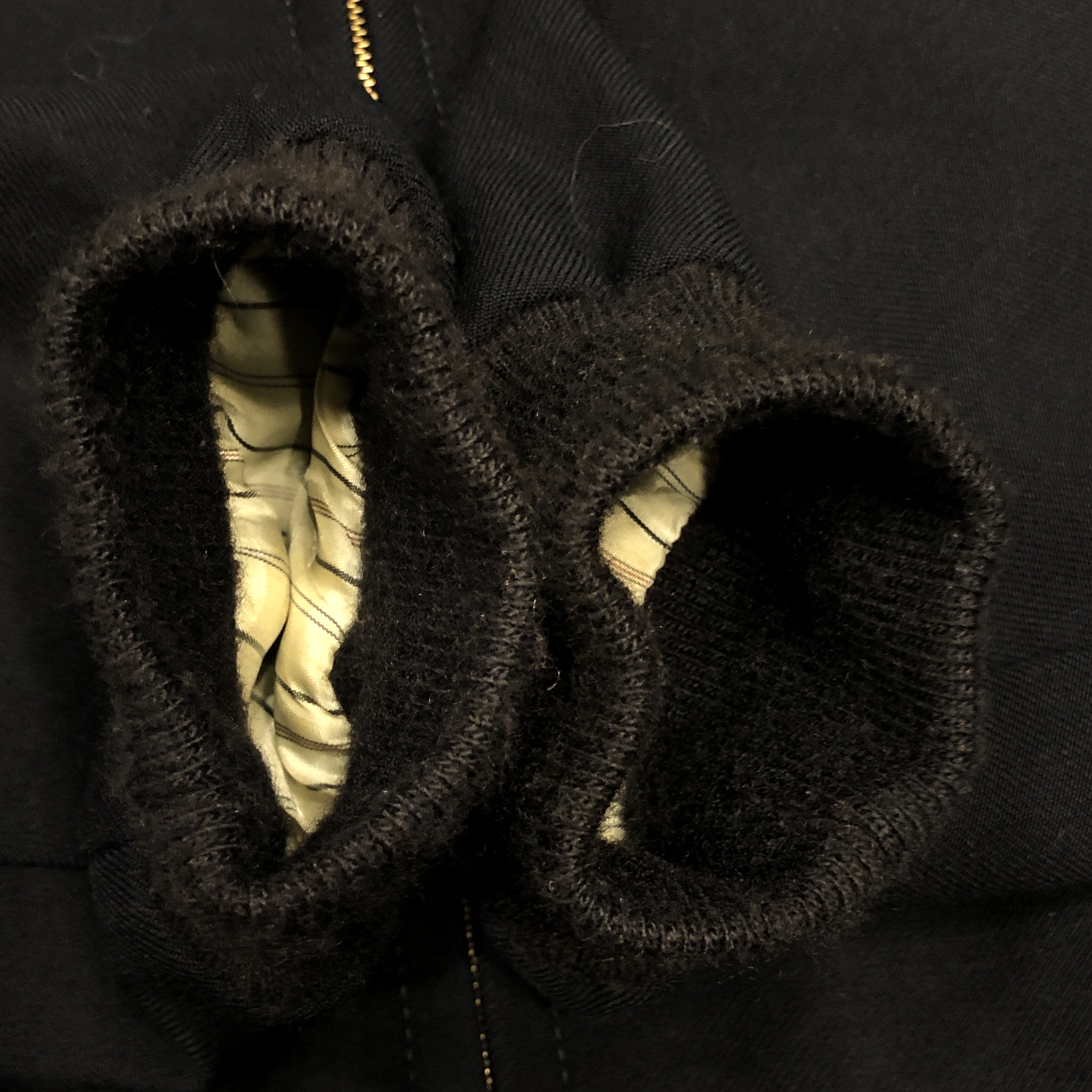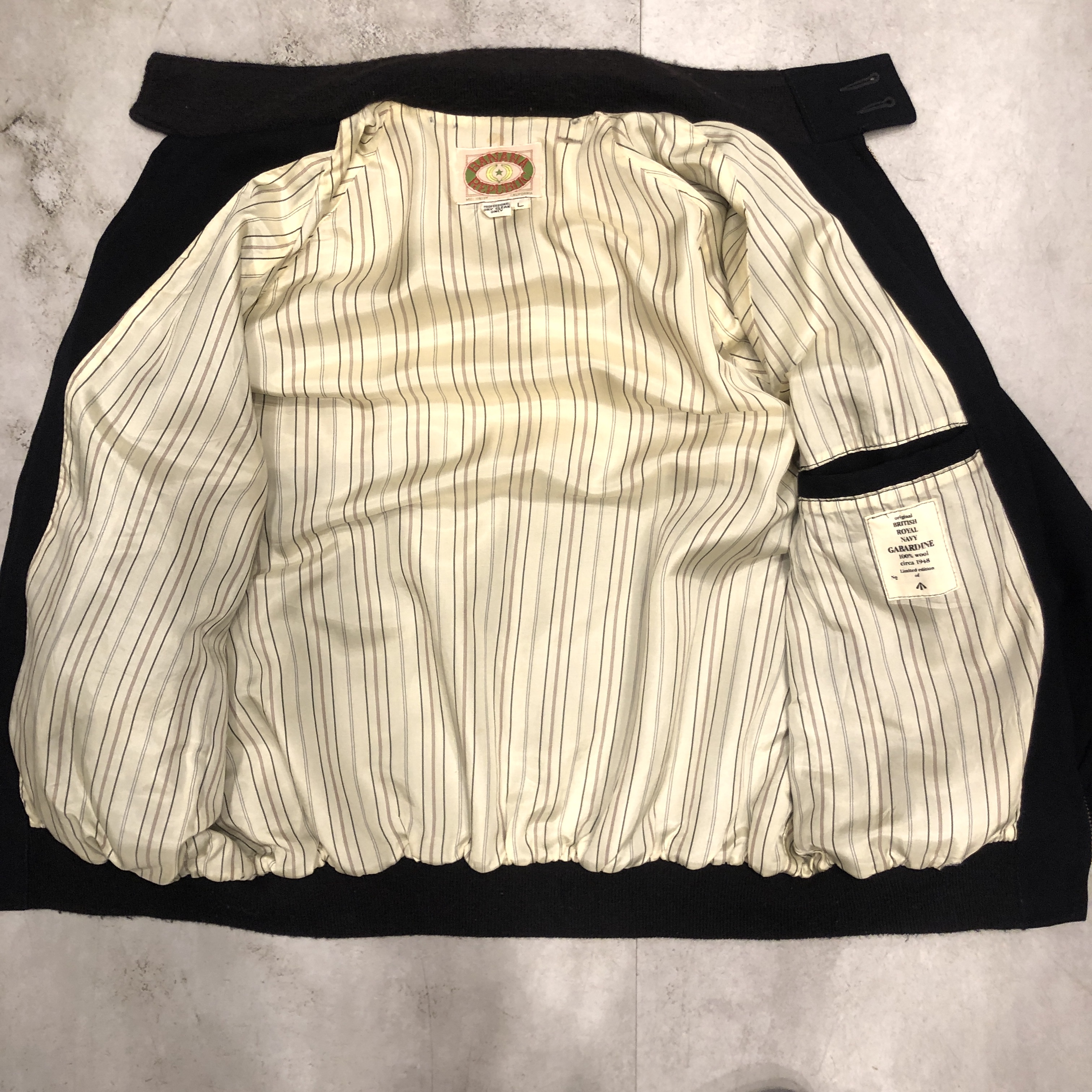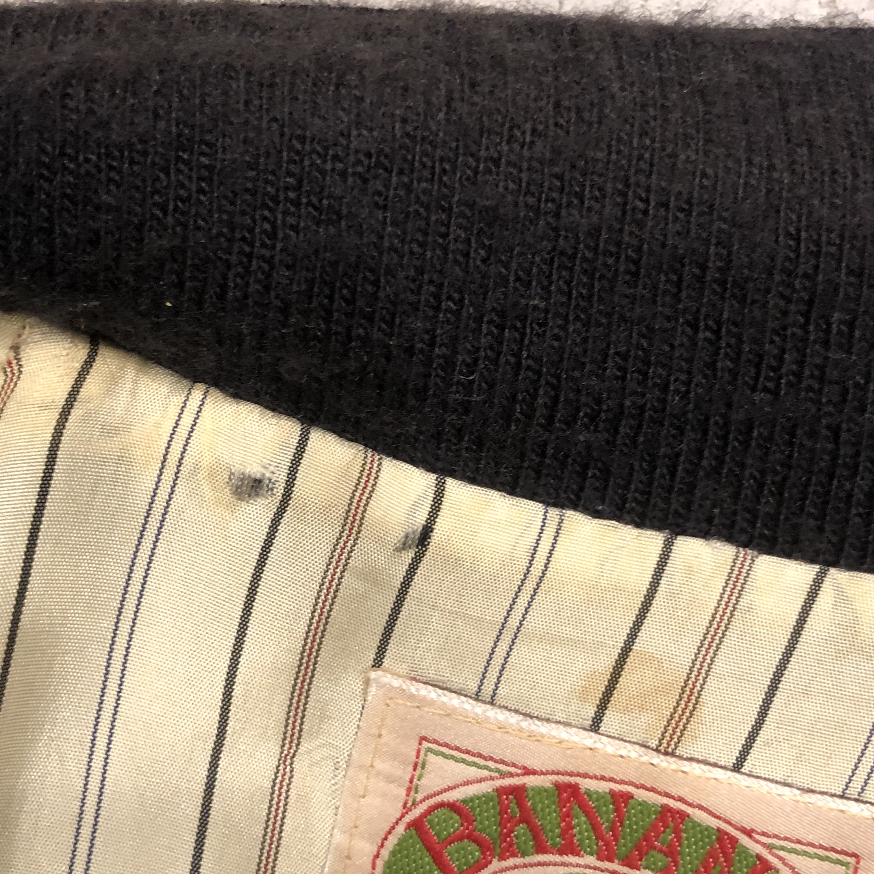 ウールギャバジンならではの深いネイビーの光沢、しっとりとした落ち感、柔らかく体に馴染む質感は、現代の生地では再現が難しく、ヴィンテージ特有の“時間の重み”が宿っています。スタンドカラー+チンストラップ、ラグランスリーブ、裾と袖口のリブ仕様、ゴールドのフロントジッパー、背面ヨークの独特なカッティングなど、ハリントンジャケットのスポーティさと上品さが絶妙に同居する、当時のバナリパらしいデザインも魅力です。