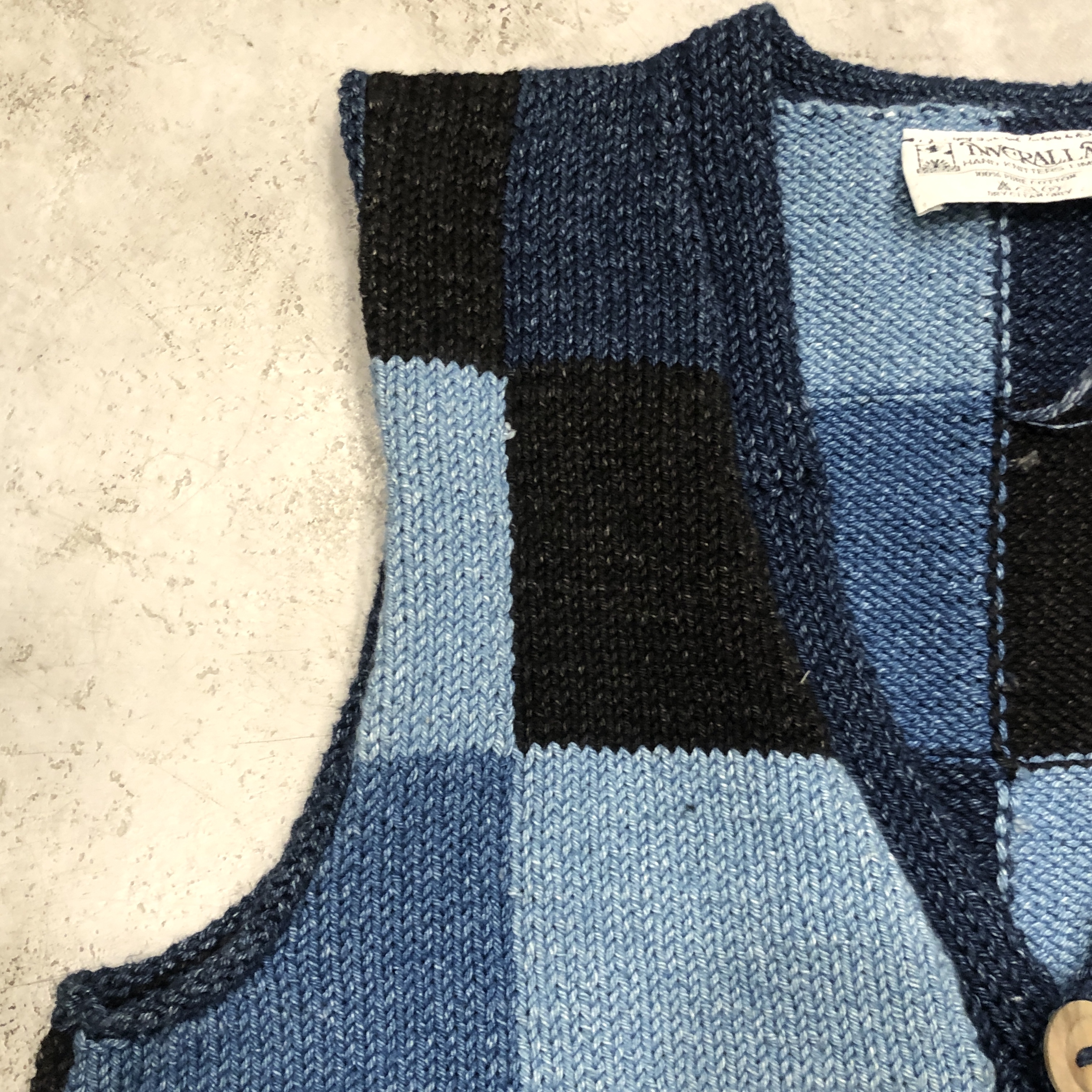 - スコットランド西岸、クライド湾沿いの小さな港町で、熟練のニッターによって一針一針編み上げられる〈INVERALLAN〉。こちらはインディゴニットベスト、コットン仕様です。