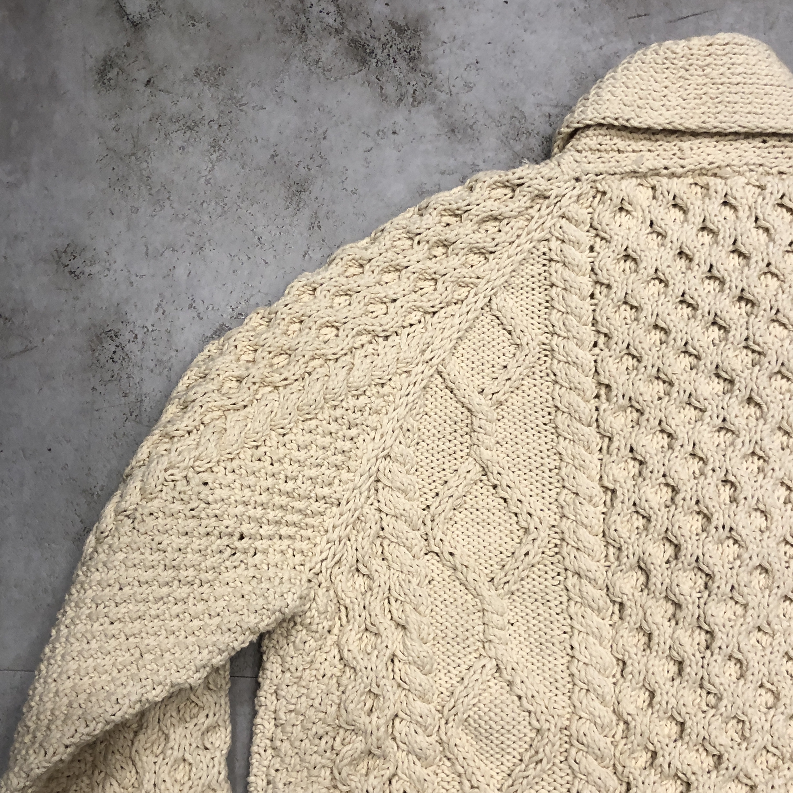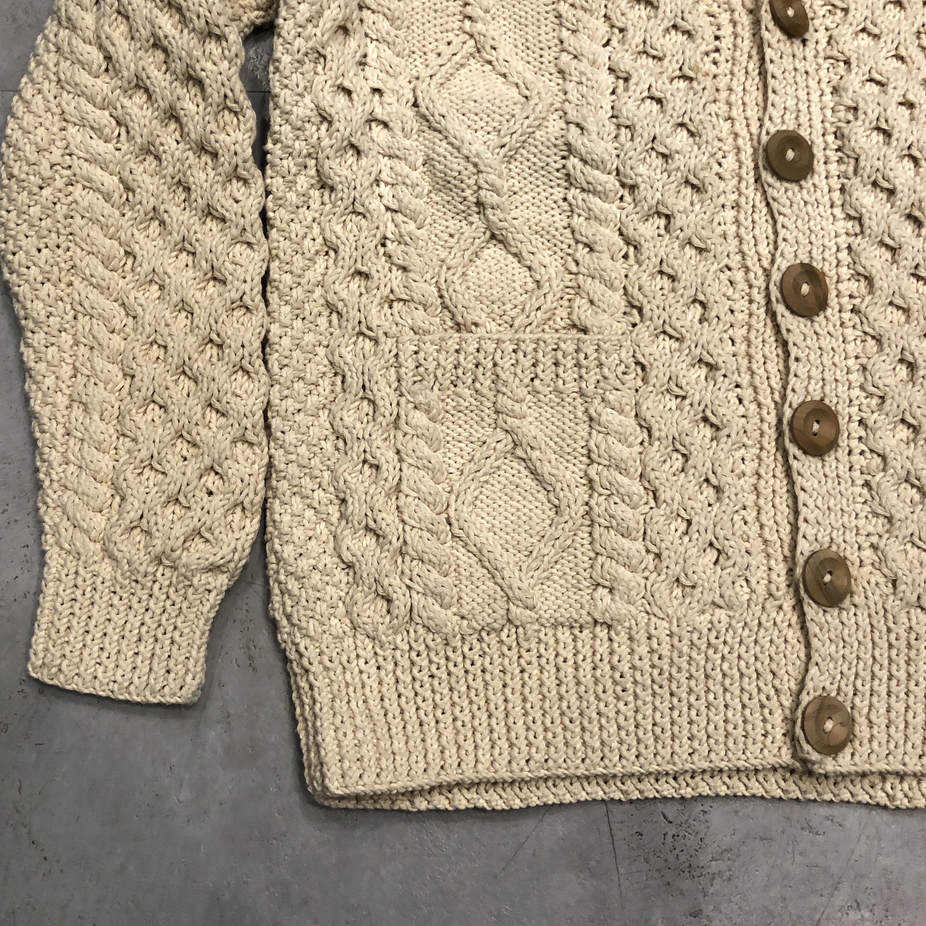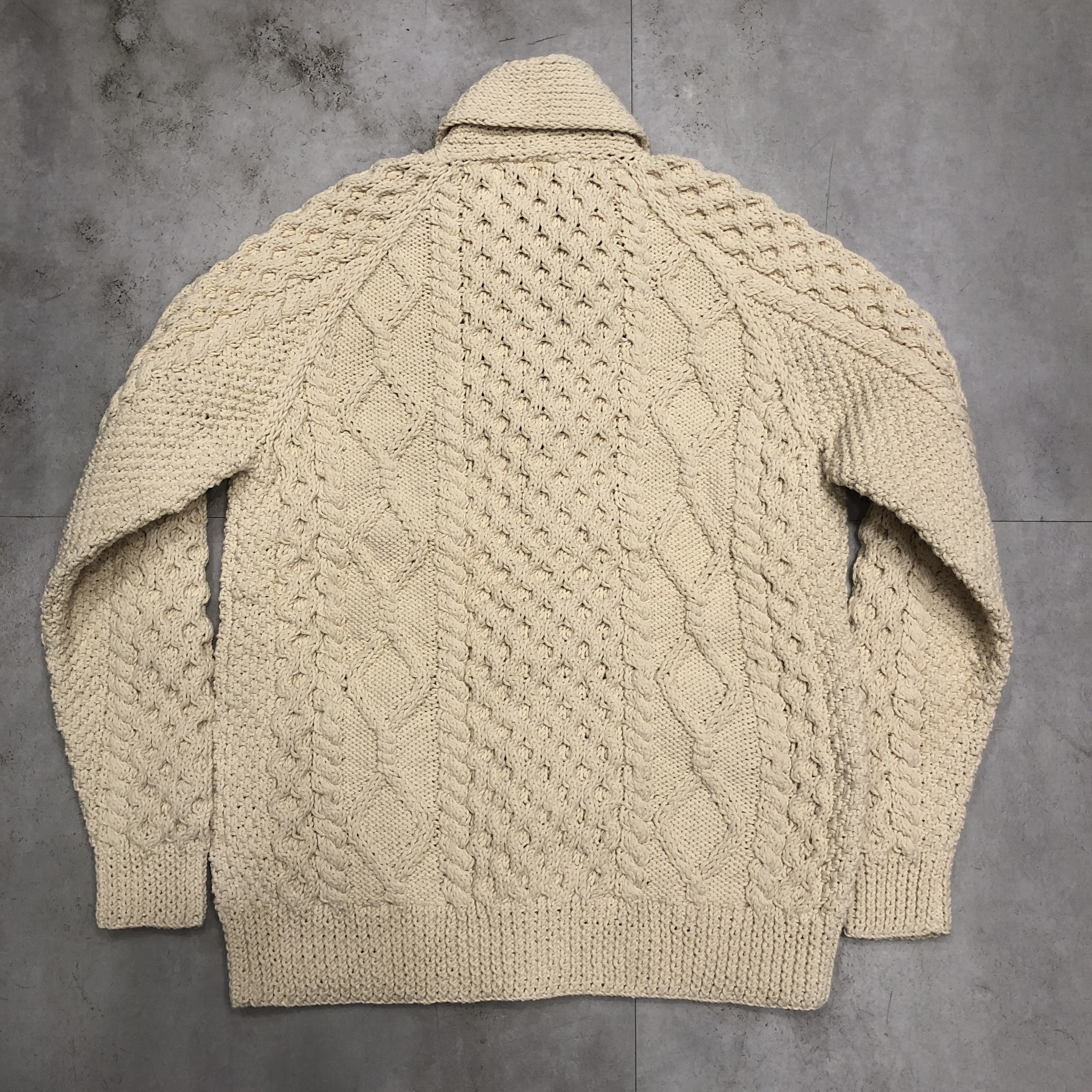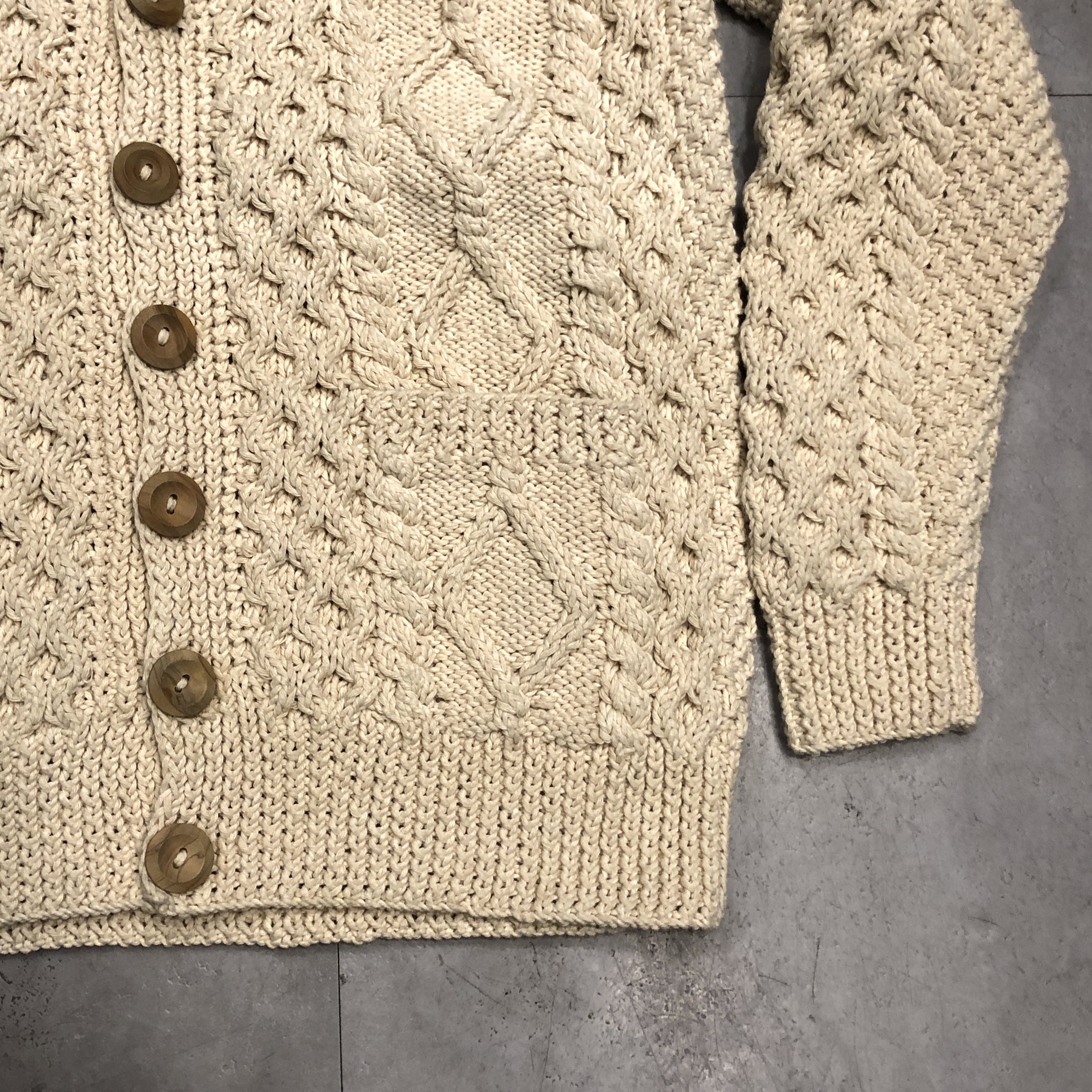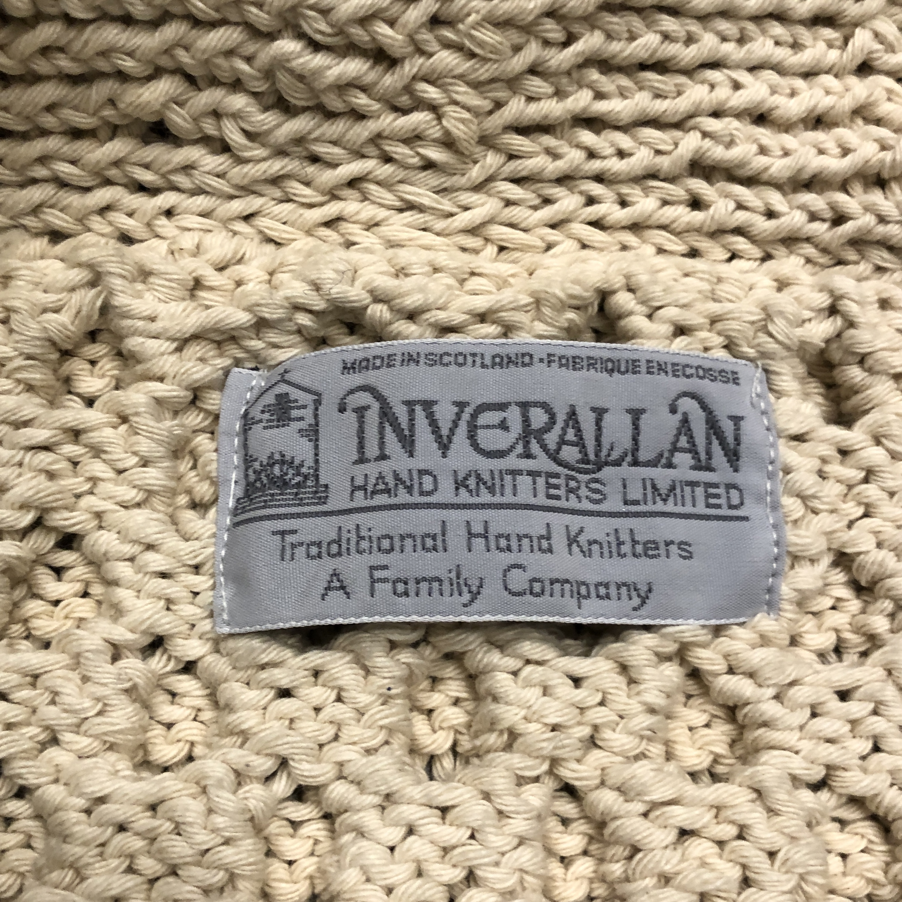 - 1970年代より続くスコットランド発の名門〈INVERALLAN〉による、名作「6A」ハンドニットカーディガンのご紹介です。熟練した職人の手仕事により、1着編み上げるのに60時間以上を要するとも言われる名品。クラシックなアラン編みの模様と、存在感のあるウッドボタン、ざっくりとしたコットンの肉厚な風合いが相まって、まさに“一生モノ”と呼ぶにふさわしい佇まいです。