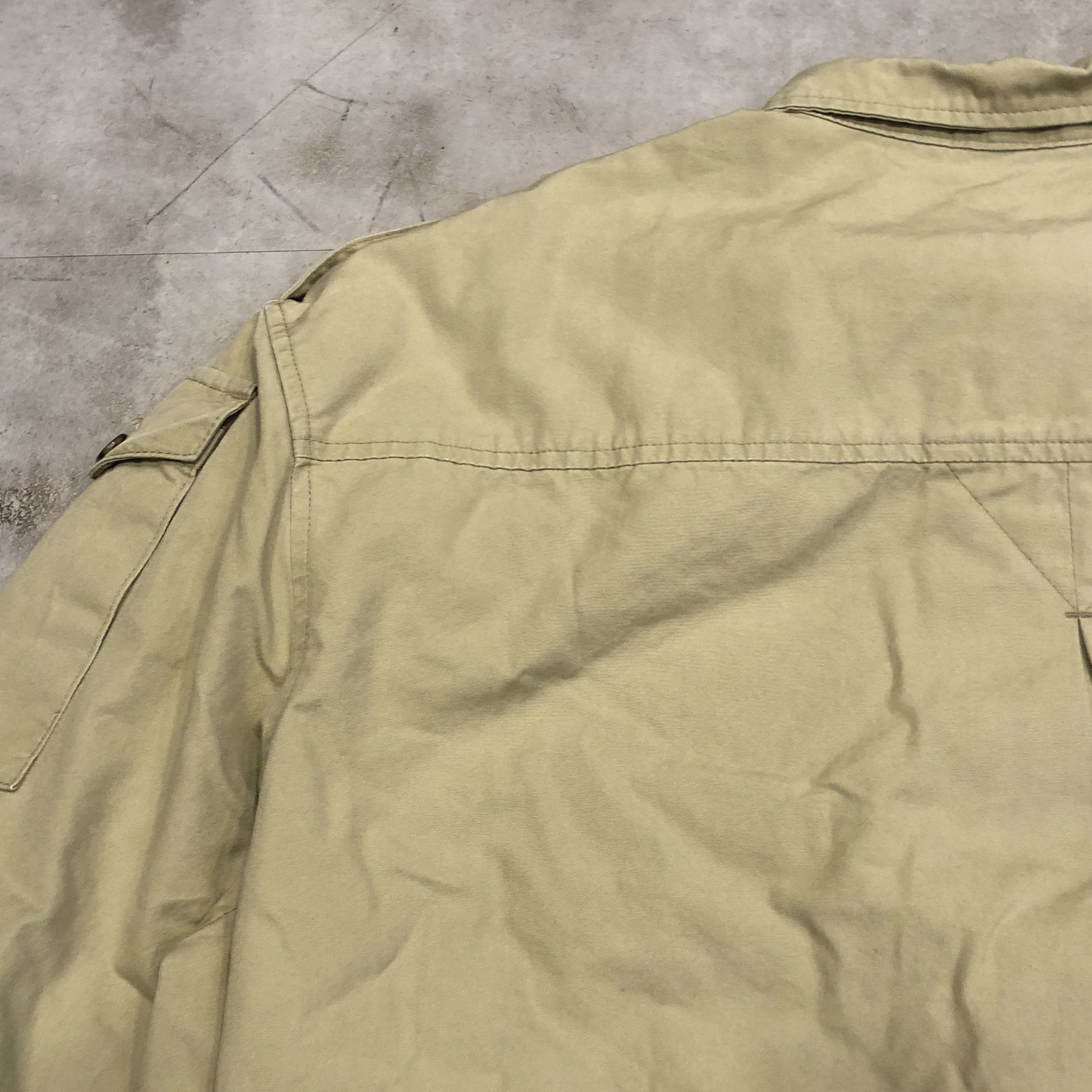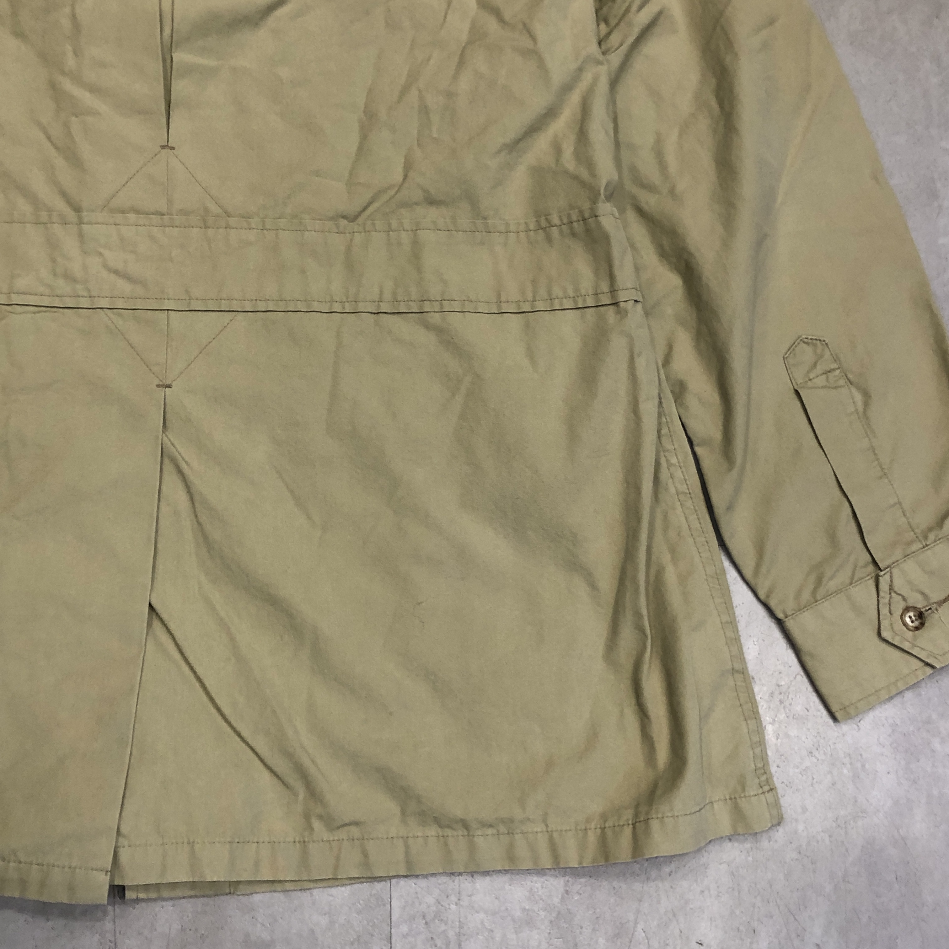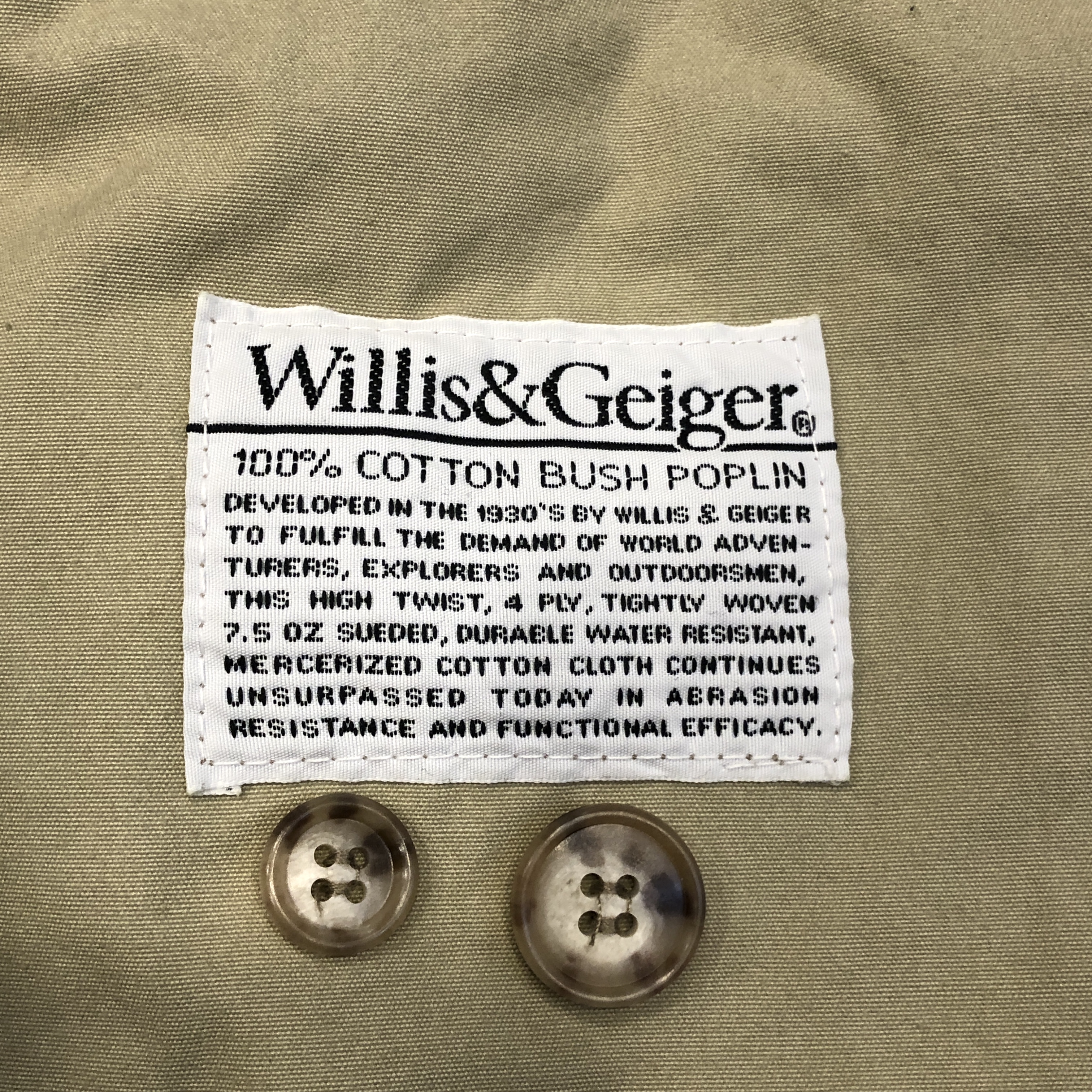 表地はウィリス&ガイガー伝統の“コットン・ブッシュポプリン”。7.5オンスという厚みを持ちながら、しなやかで水にも強く、経年で美しい表情を見せてくれます。4つの大型フラップポケット、肩のキルティング補強、絶妙なウエストギャザー、ミリタリージャケット譲りのショルダーループなど、随所に機能美が溢れるディテール。内タグには当時から変わらぬ開発コンセプトが誇らしげに記されています。