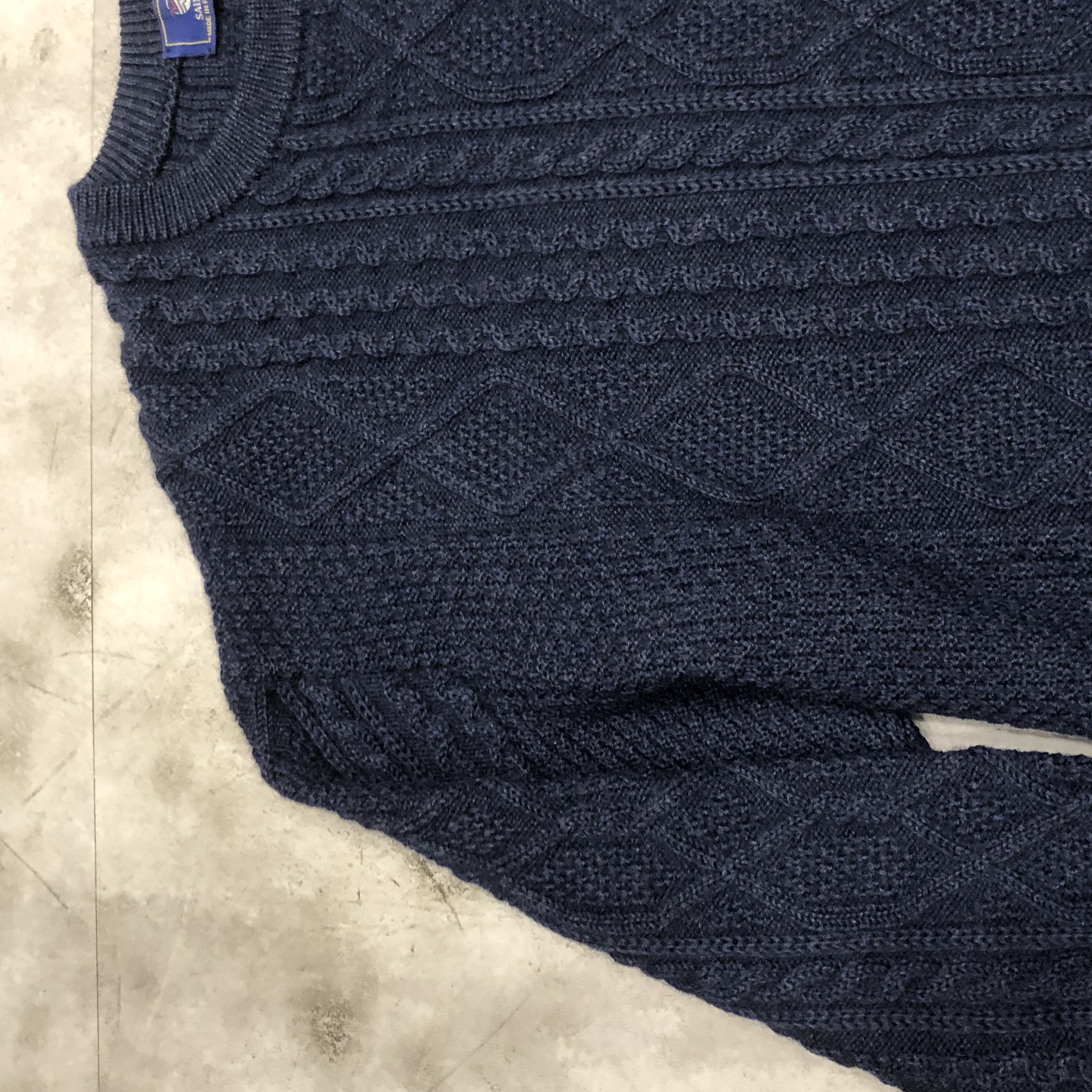 前身頃から袖、背面までびっしりと編み込まれたダイヤ柄やロープ状のケーブルは、立体感があり、まるで手編みのような存在感。現行品にはない“膨らみ・軽さ・油分(ラノリン)”が残るウールを用いており、クラシックニットに特有のふっくらとした温かみが感じられます。