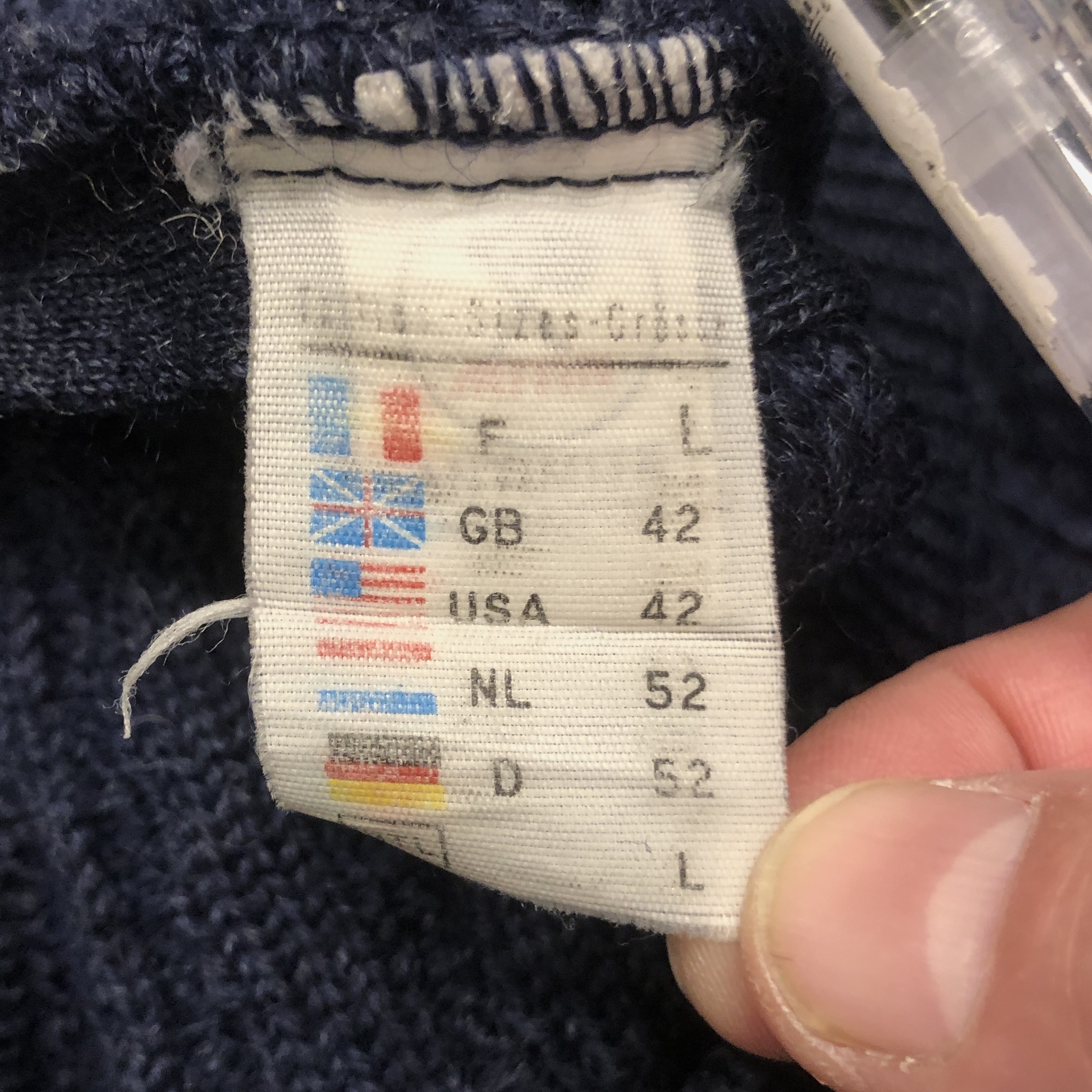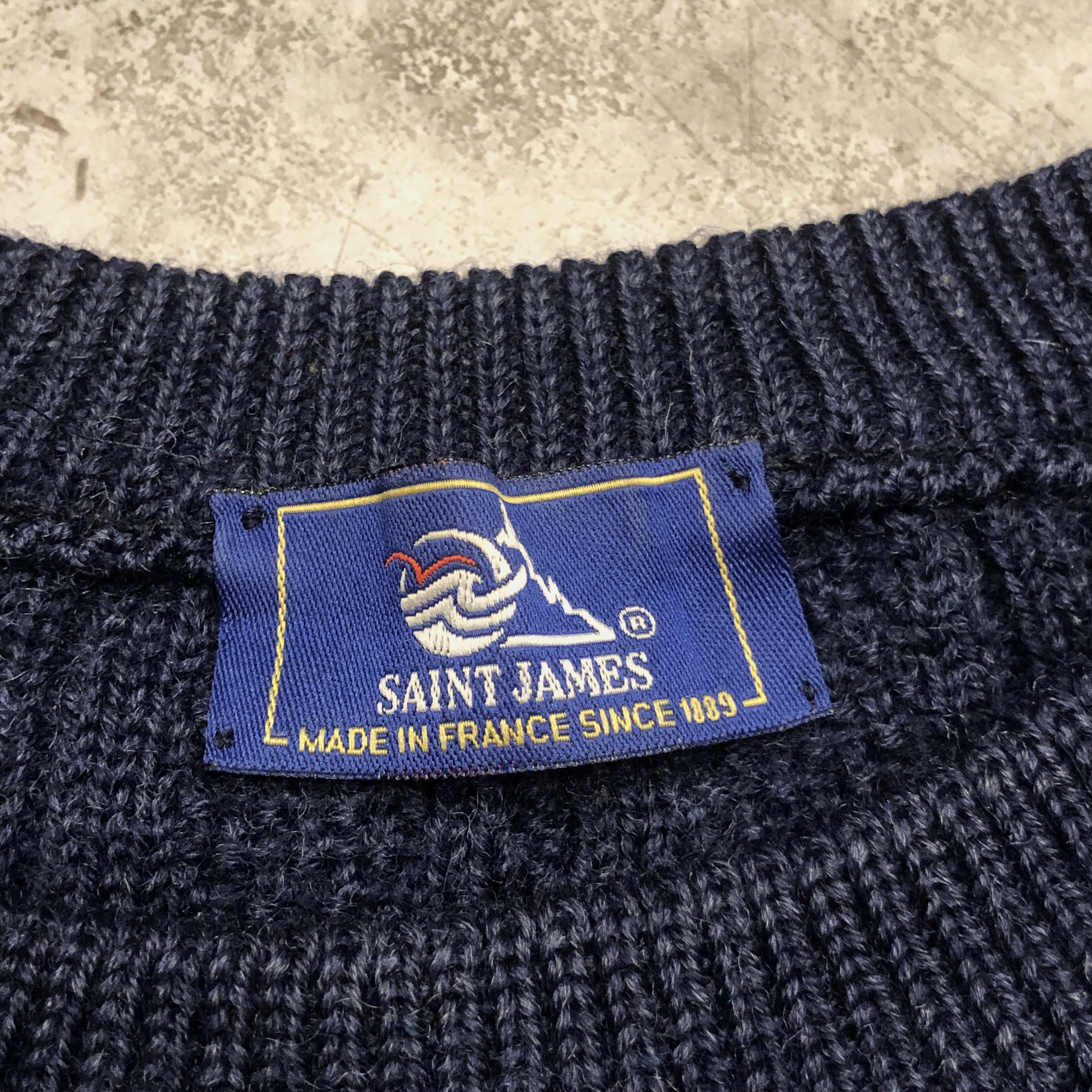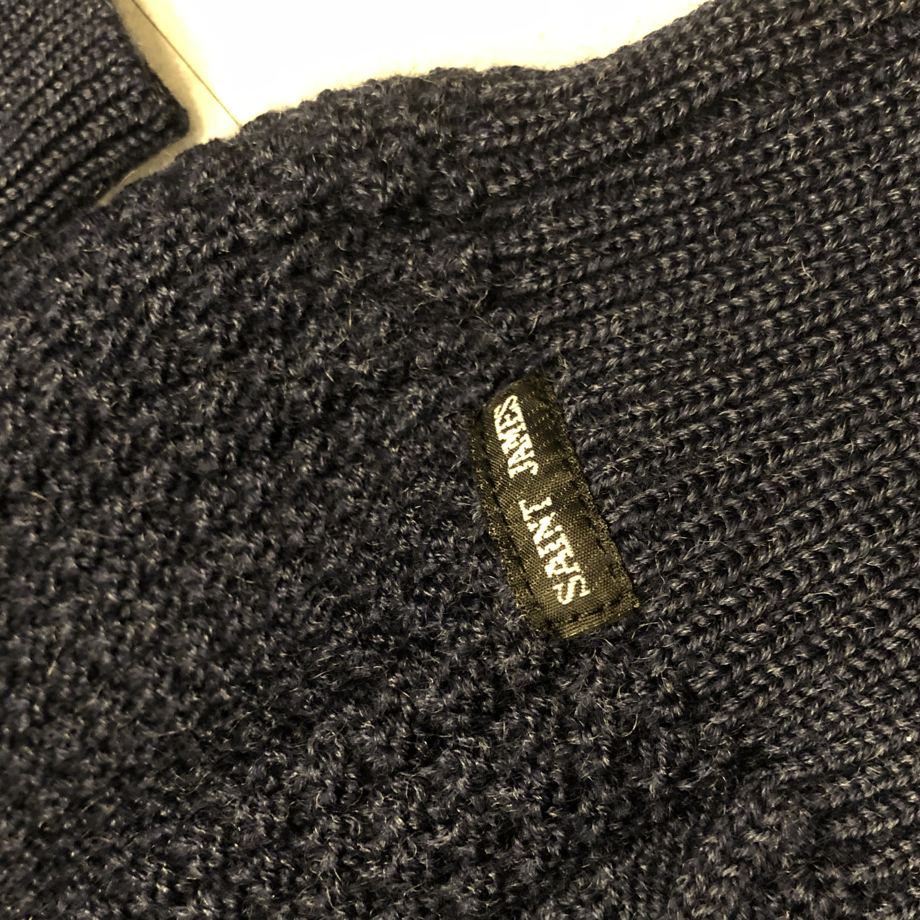 タグはブルー×ゴールドの刺繍ロゴに「MADE IN FRANCE SINCE 1889」表記、WOOLMARKタグ、欧州〜USAのサイズ表記タグが揃う組み合わせ。この構成から 80年代後半〜90年代前期 の生産が濃厚。セントジェームスが最も品質の良かった“黄金期”の個体といえます。