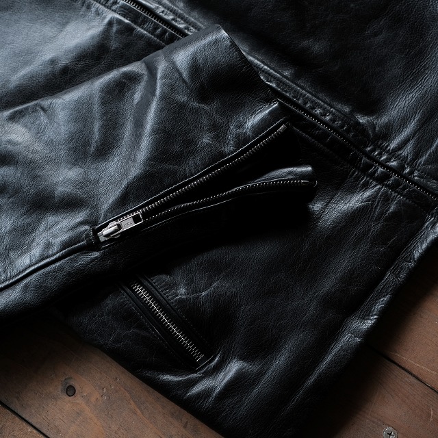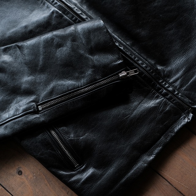 しかしそれがカウレザーの堅牢性や艶、エイジングで生じるシワ等素材の良さが際立ち、ライダースらしい身体にフィットする綺麗なシルエットは極上です。タイトフィッティングですので、長い期間を経て自分の身体に馴染んでいく感覚が味わえ、育てた後は唯一無二の一着となります。