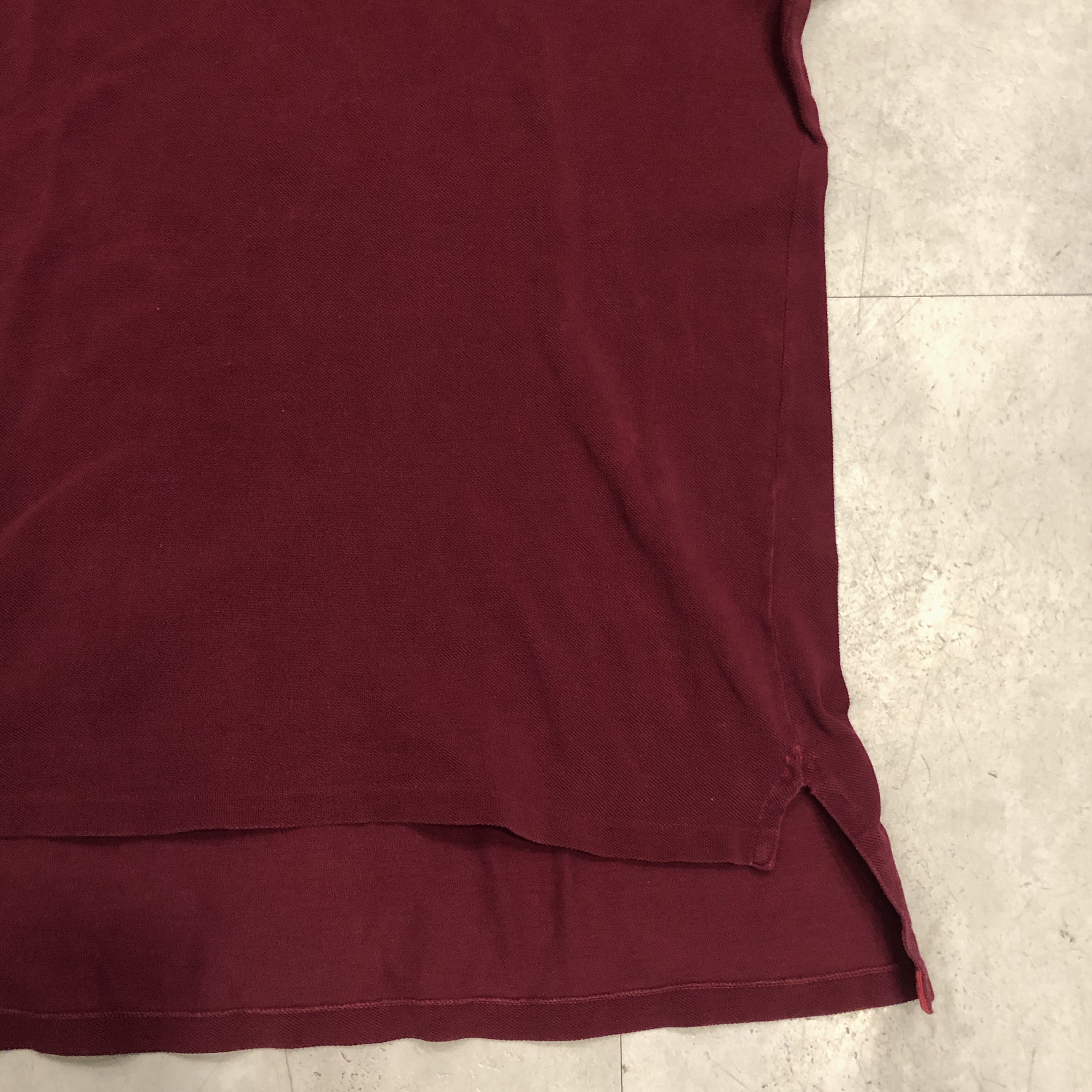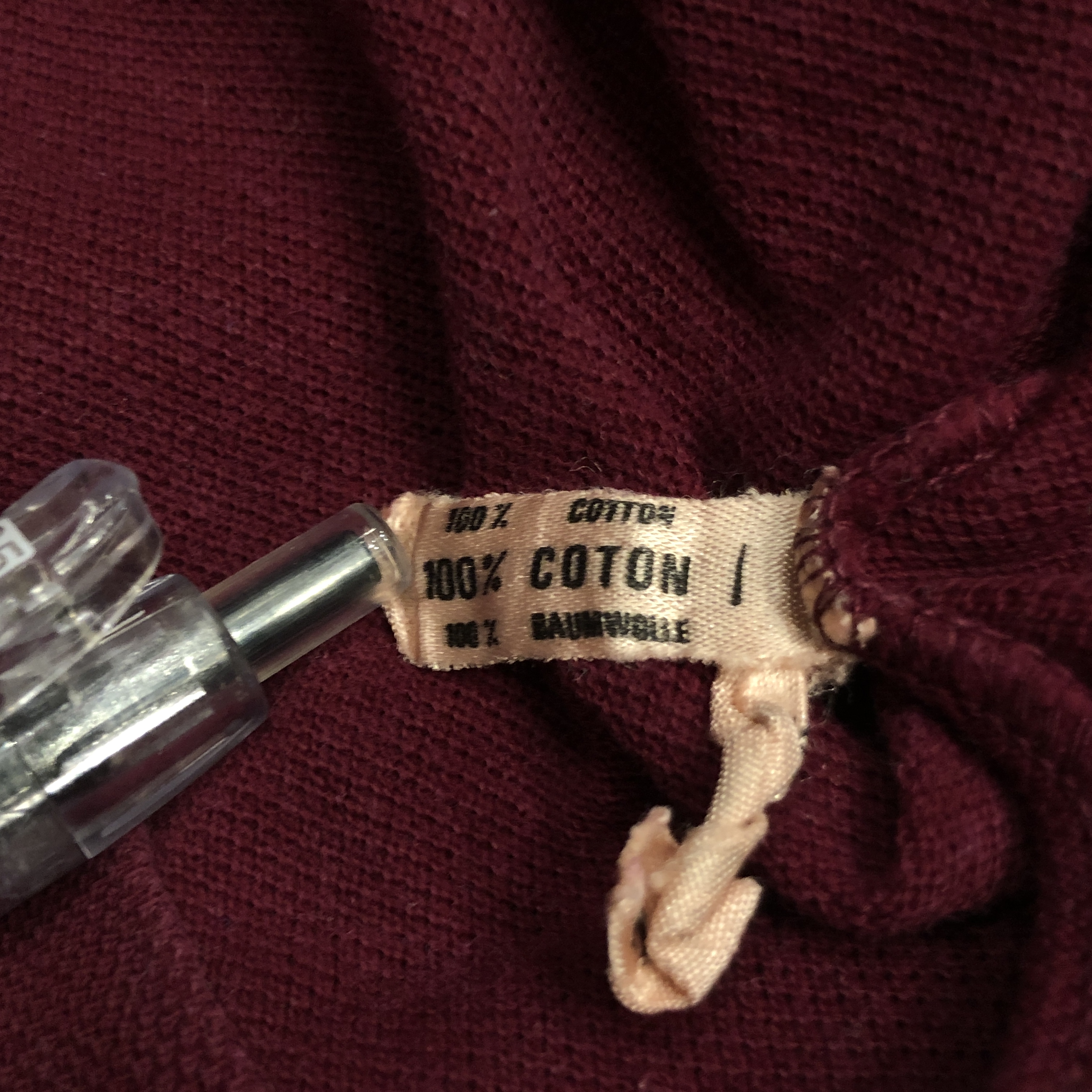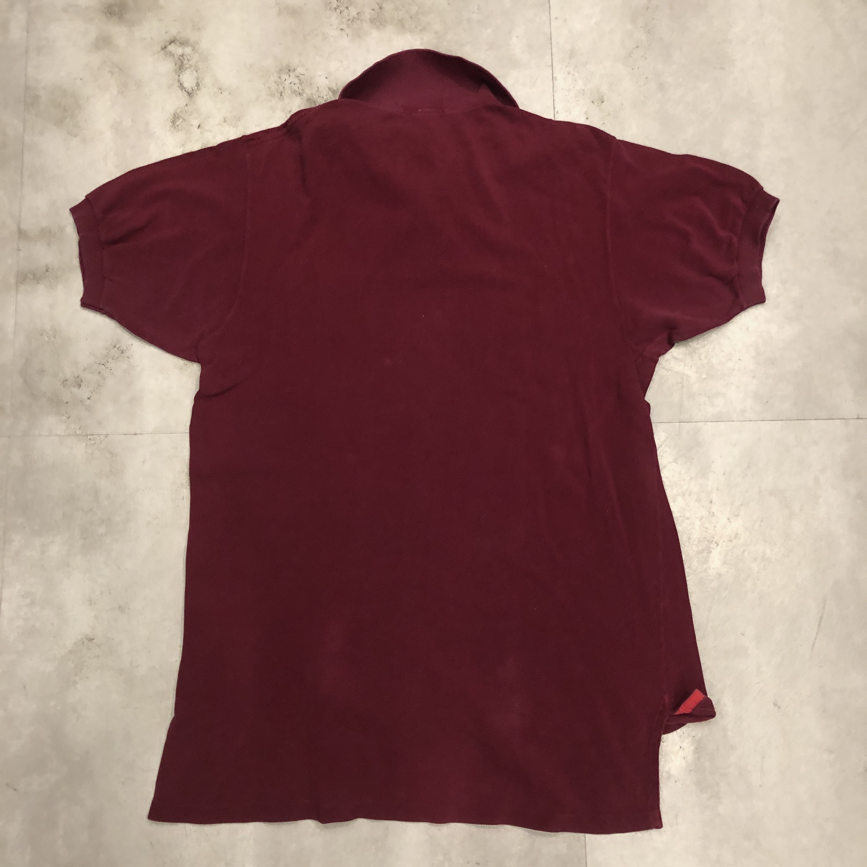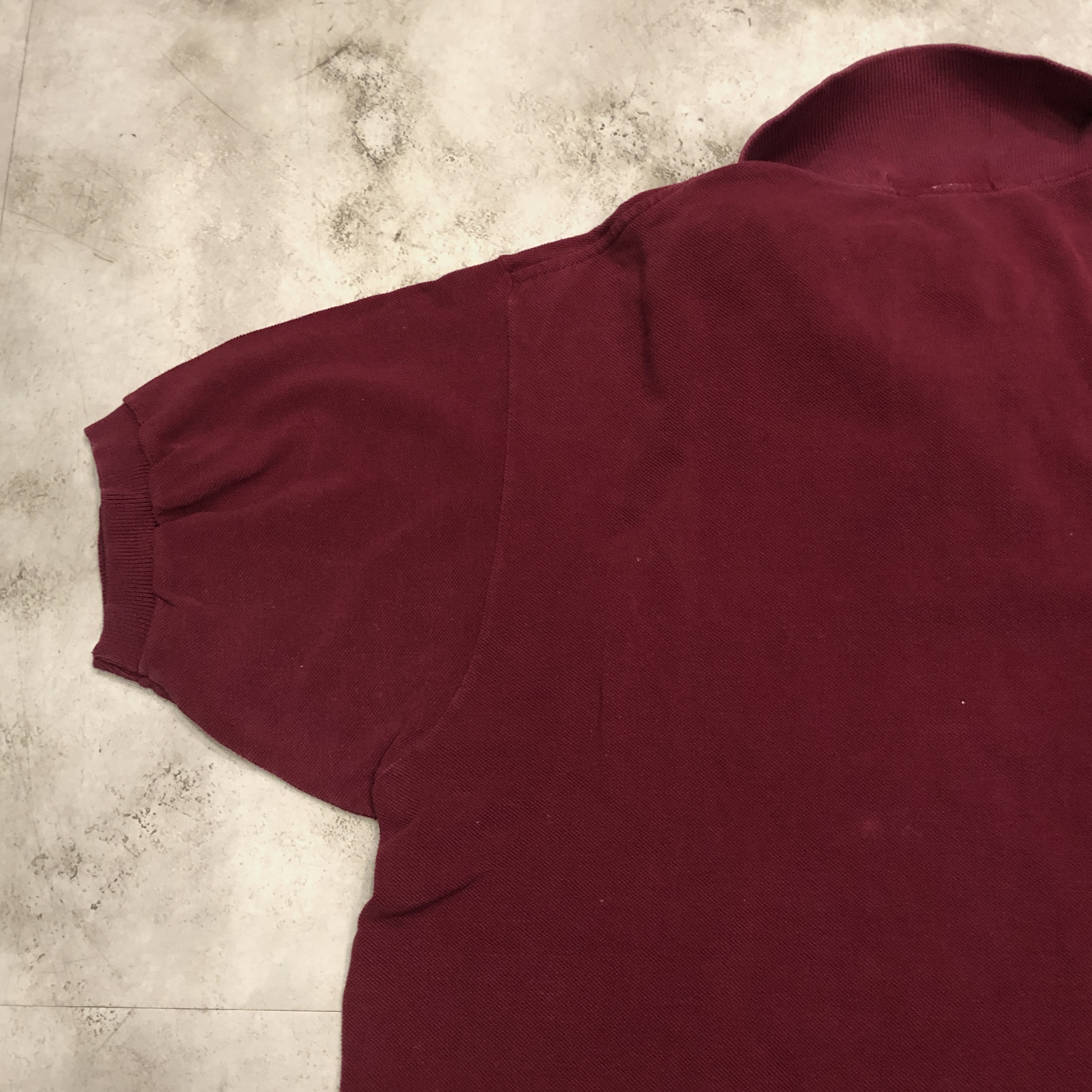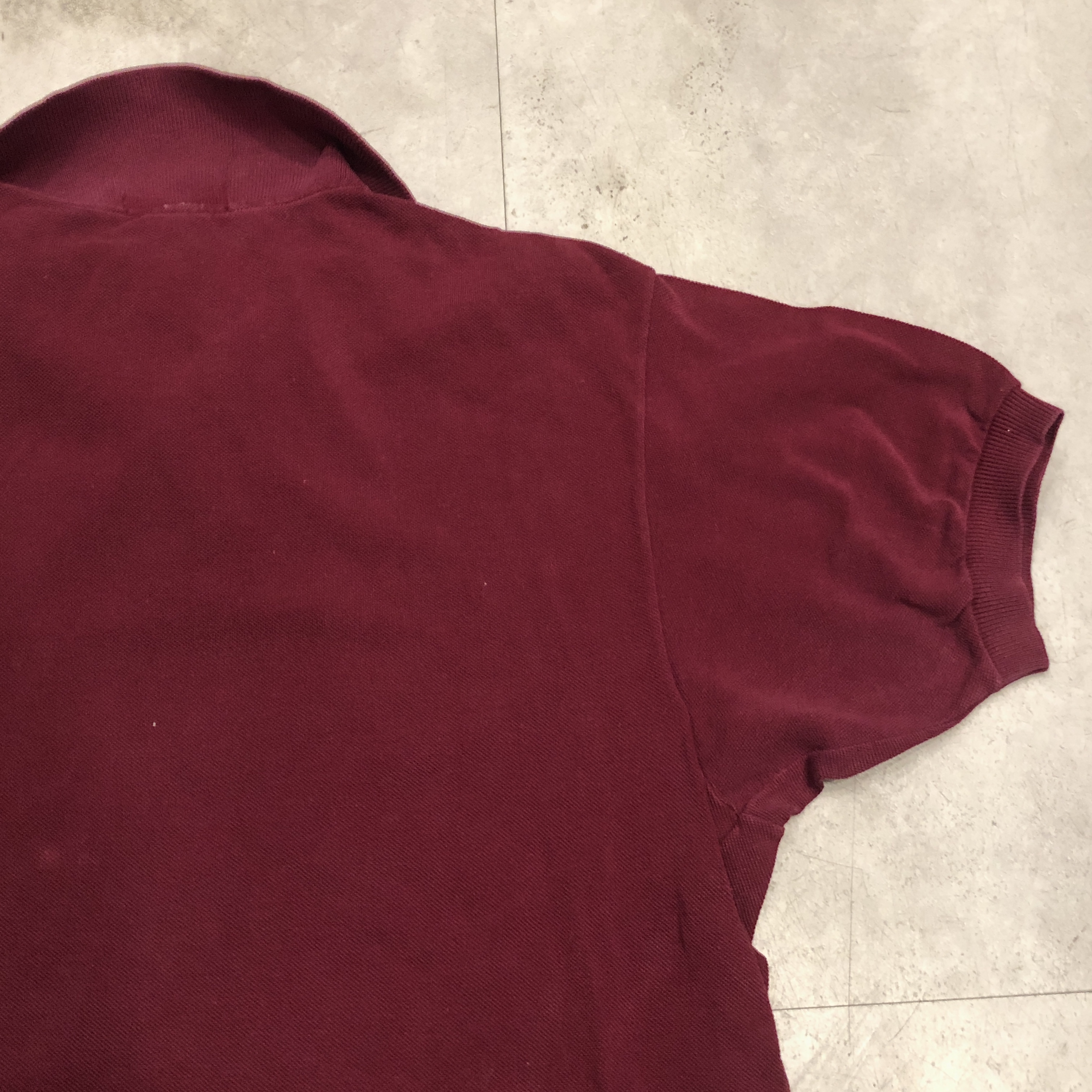 さらに内側には、素材を示す“100%COTON”タグ付き。柔らかな鹿の子編み地は、着用を重ねるごとに肌になじむ育て甲斐のある風合い。色味はやや褪せ感を伴ったバーガンディで、スポーティかつ洗練された佇まいを演出しています。