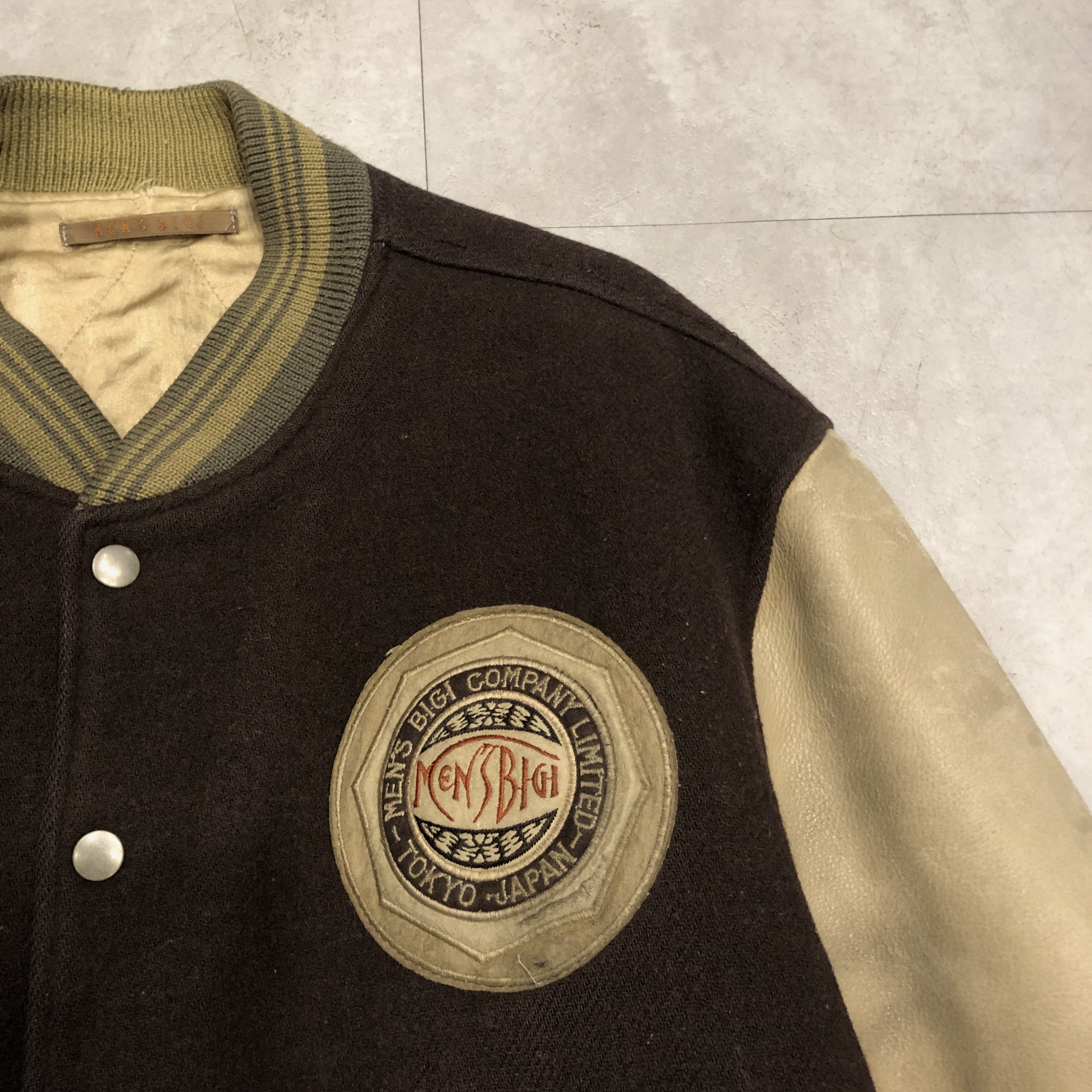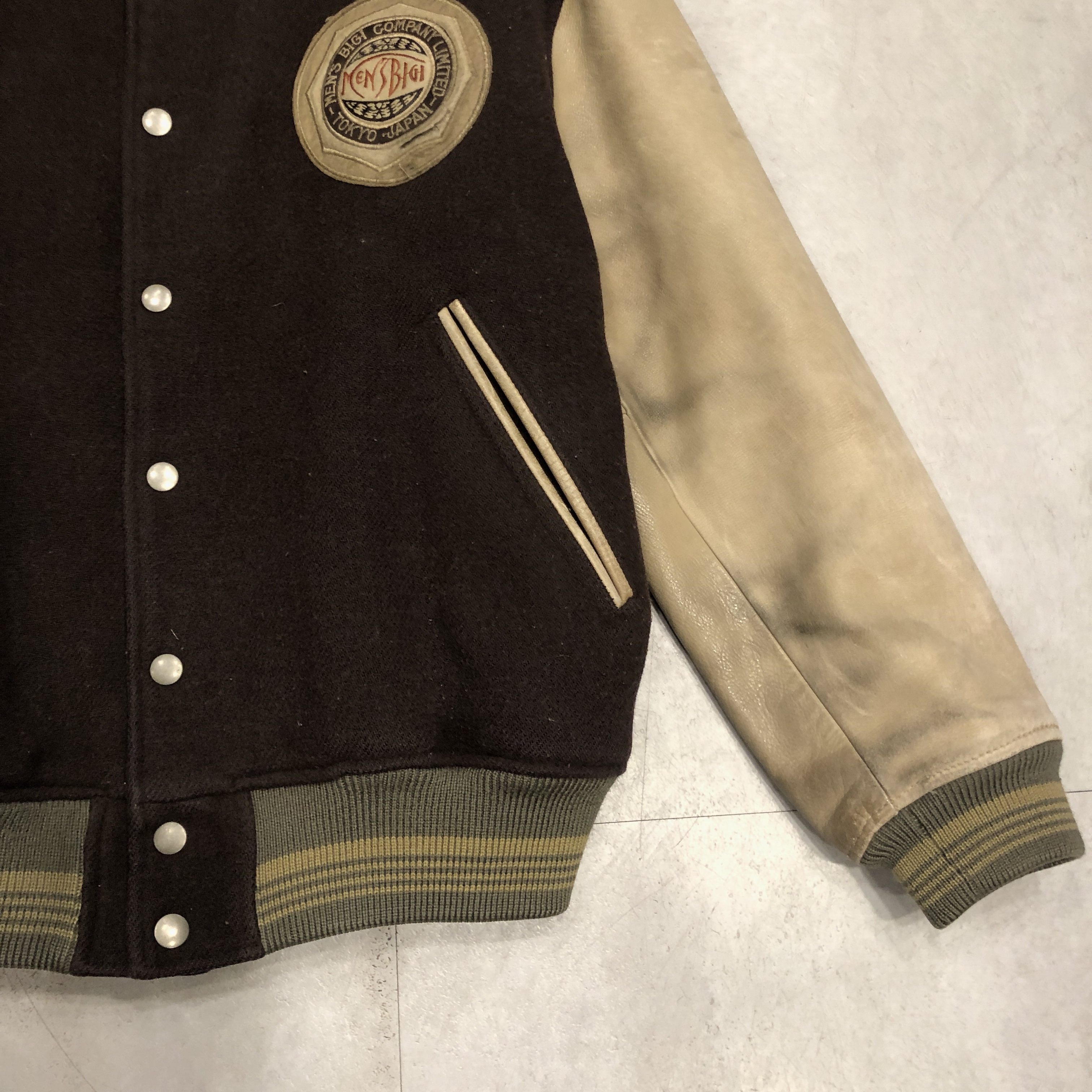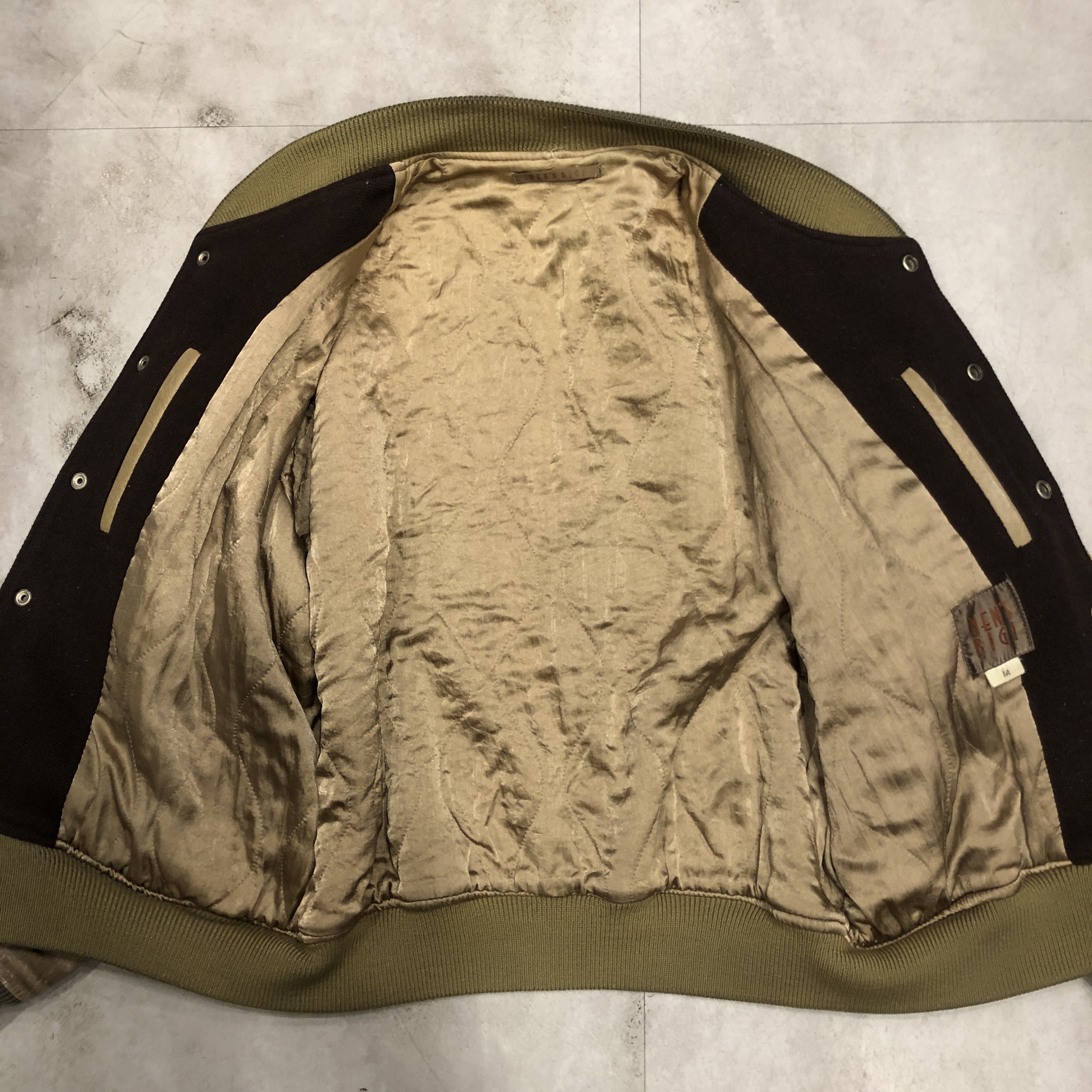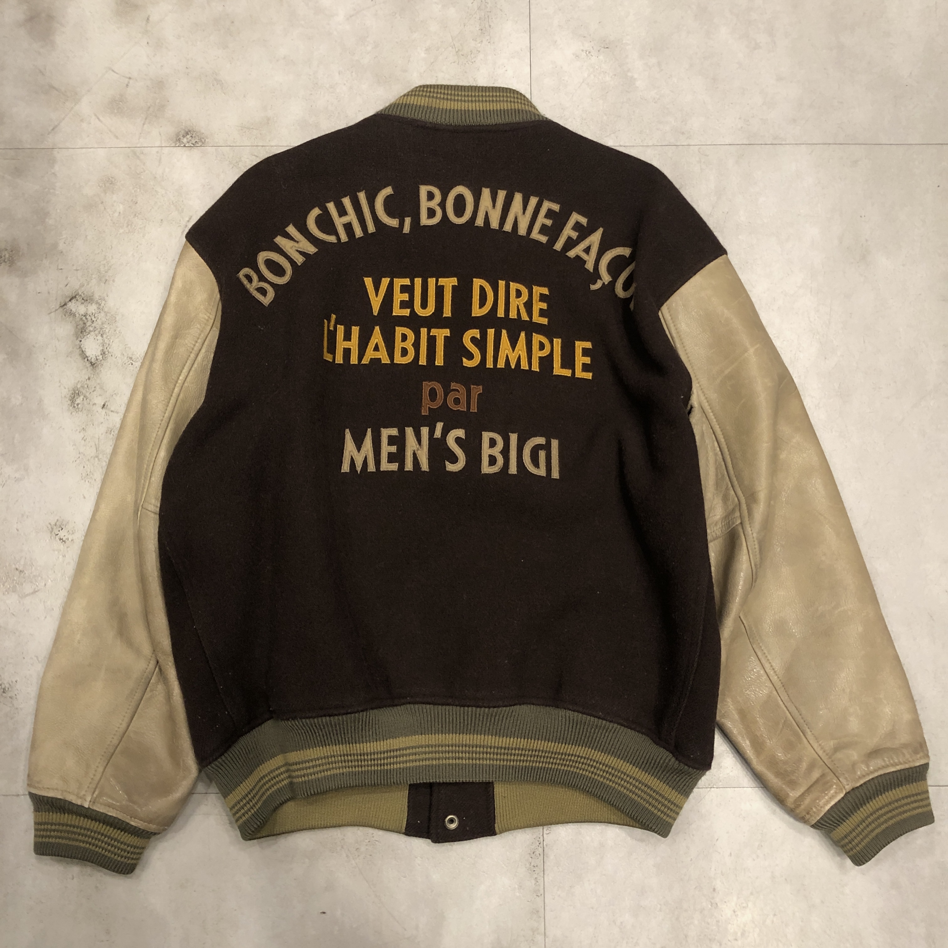 - 1980年代メンズビギ全盛期の空気をそのまま閉じ込めたような、迫力の“ブラウン×レザー”スタジアムジャケットが入荷しました。重厚なウールメルトンに、品のある艶を宿すブラウンの本革スリーブという、当時のビギらしい都会的エッジとクラシックなアメカジ要素が絶妙に同居した一着。胸にはデザインラベルを大胆に配し、バックにはスペイン語で刺繍された、80s〜90sのビギ黄金期を象徴するアイコニックな背面メッセージが圧倒的存在感を放っています。ライニングは光沢のあるキルティングサテンで防寒性も高く、袖リブ・裾リブはライン入りのオリジナル仕様。袖レザーの経年の馴染みなど、ヴィンテージとしての魅力も十分。今ではアーカイブ性の高い“ビギのスタジャン”、ストリートにもモードにも振れる万能な一本です。