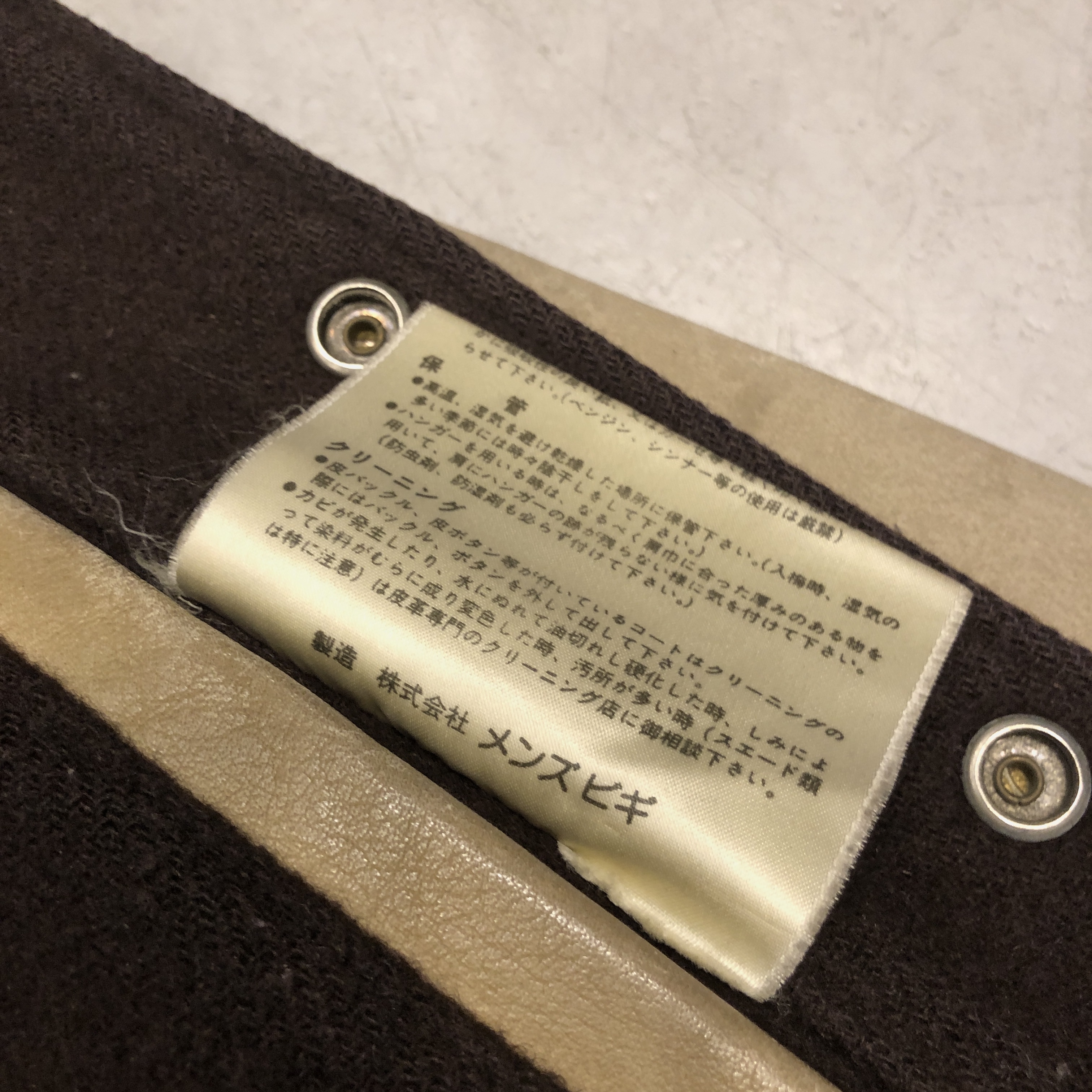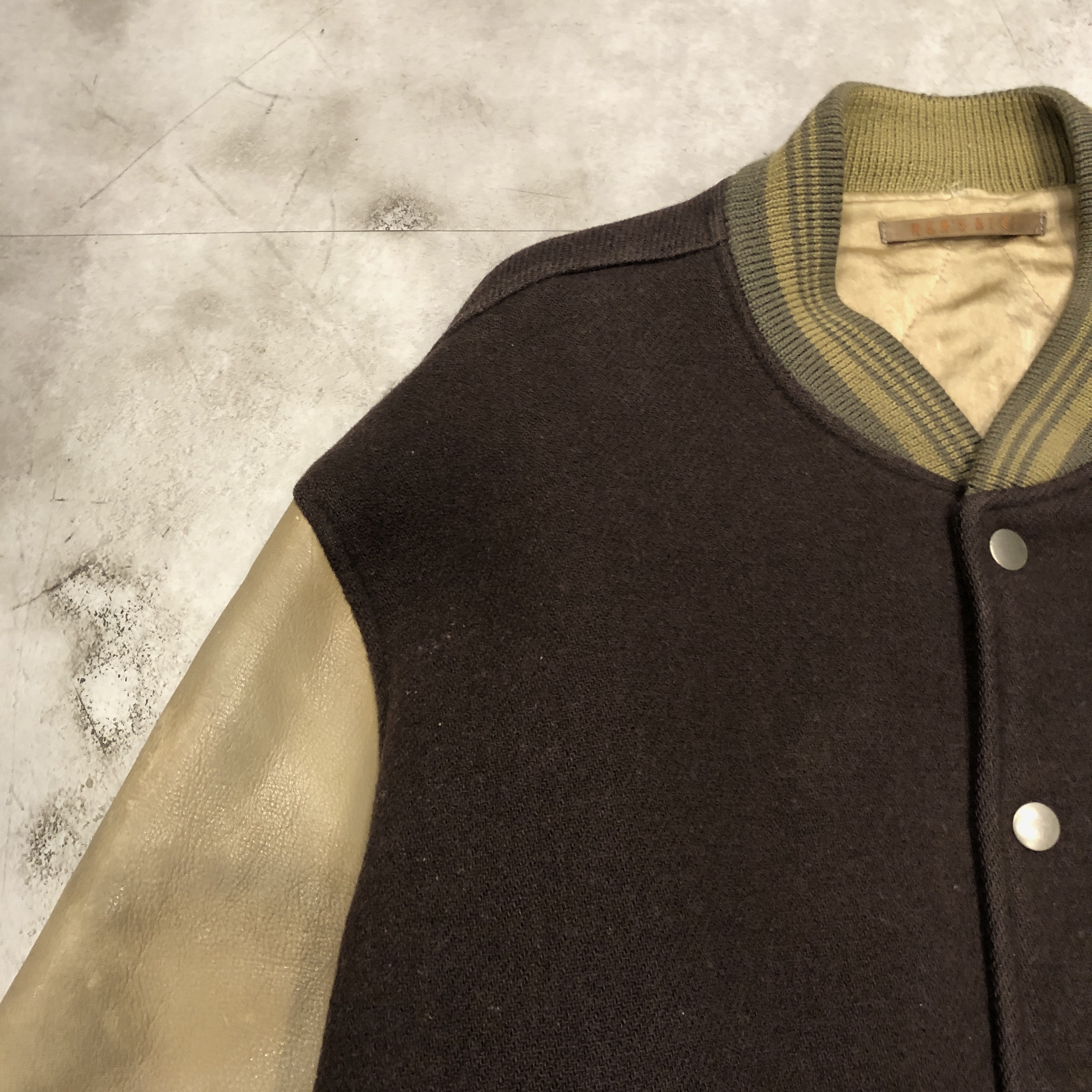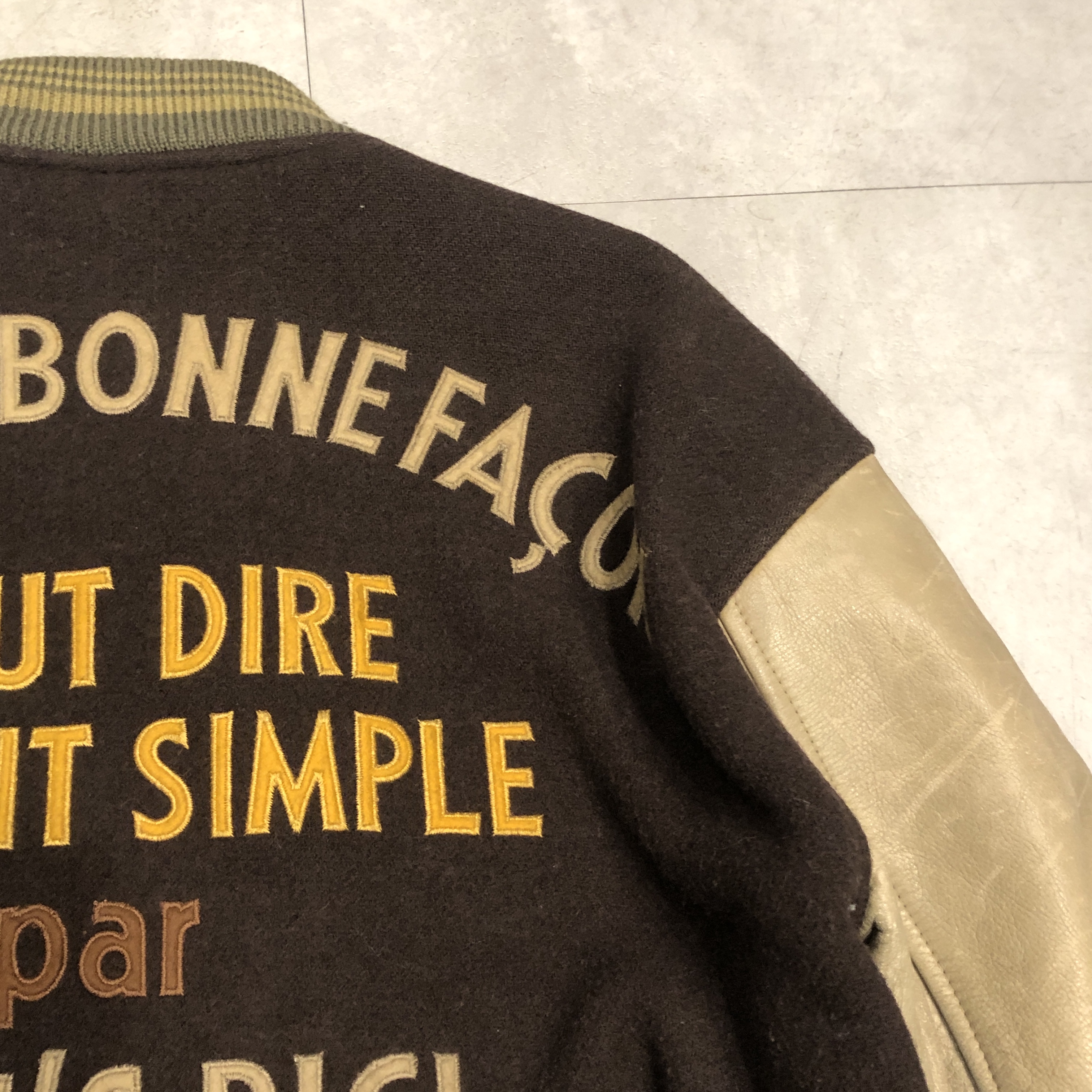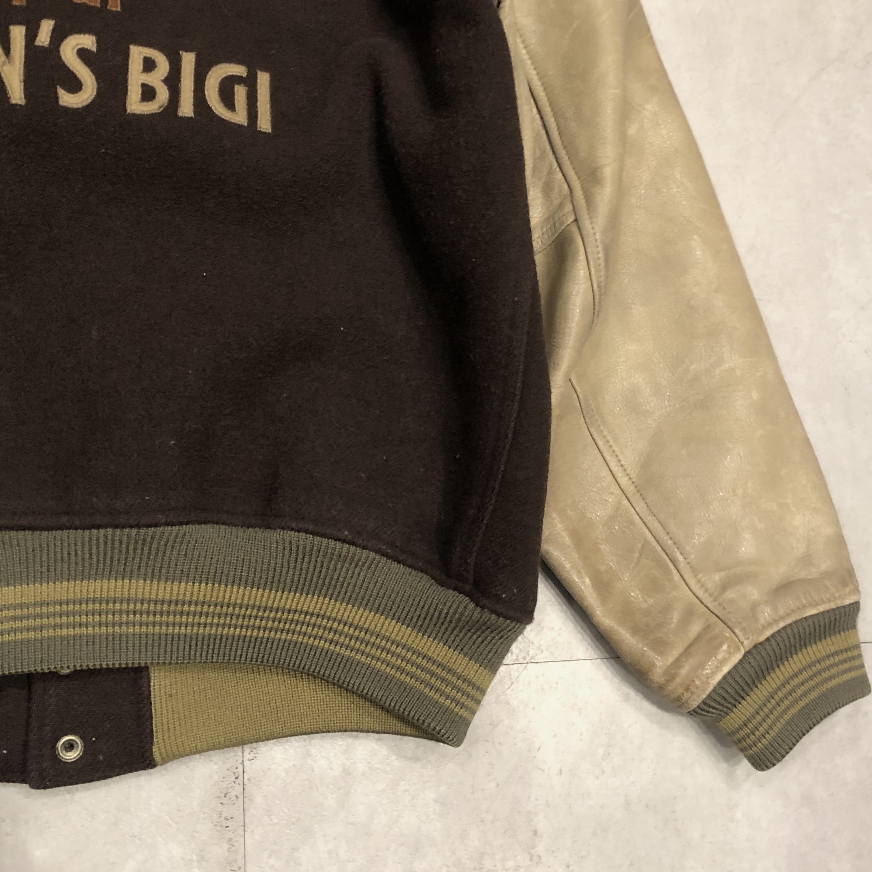 - 1980年代メンズビギ全盛期の空気をそのまま閉じ込めたような、迫力の“ブラウン×レザー”スタジアムジャケットが入荷しました。重厚なウールメルトンに、品のある艶を宿すブラウンの本革スリーブという、当時のビギらしい都会的エッジとクラシックなアメカジ要素が絶妙に同居した一着。胸にはデザインラベルを大胆に配し、バックにはスペイン語で刺繍された、80s〜90sのビギ黄金期を象徴するアイコニックな背面メッセージが圧倒的存在感を放っています。ライニングは光沢のあるキルティングサテンで防寒性も高く、袖リブ・裾リブはライン入りのオリジナル仕様。袖レザーの経年の馴染みなど、ヴィンテージとしての魅力も十分。今ではアーカイブ性の高い“ビギのスタジャン”、ストリートにもモードにも振れる万能な一本です。