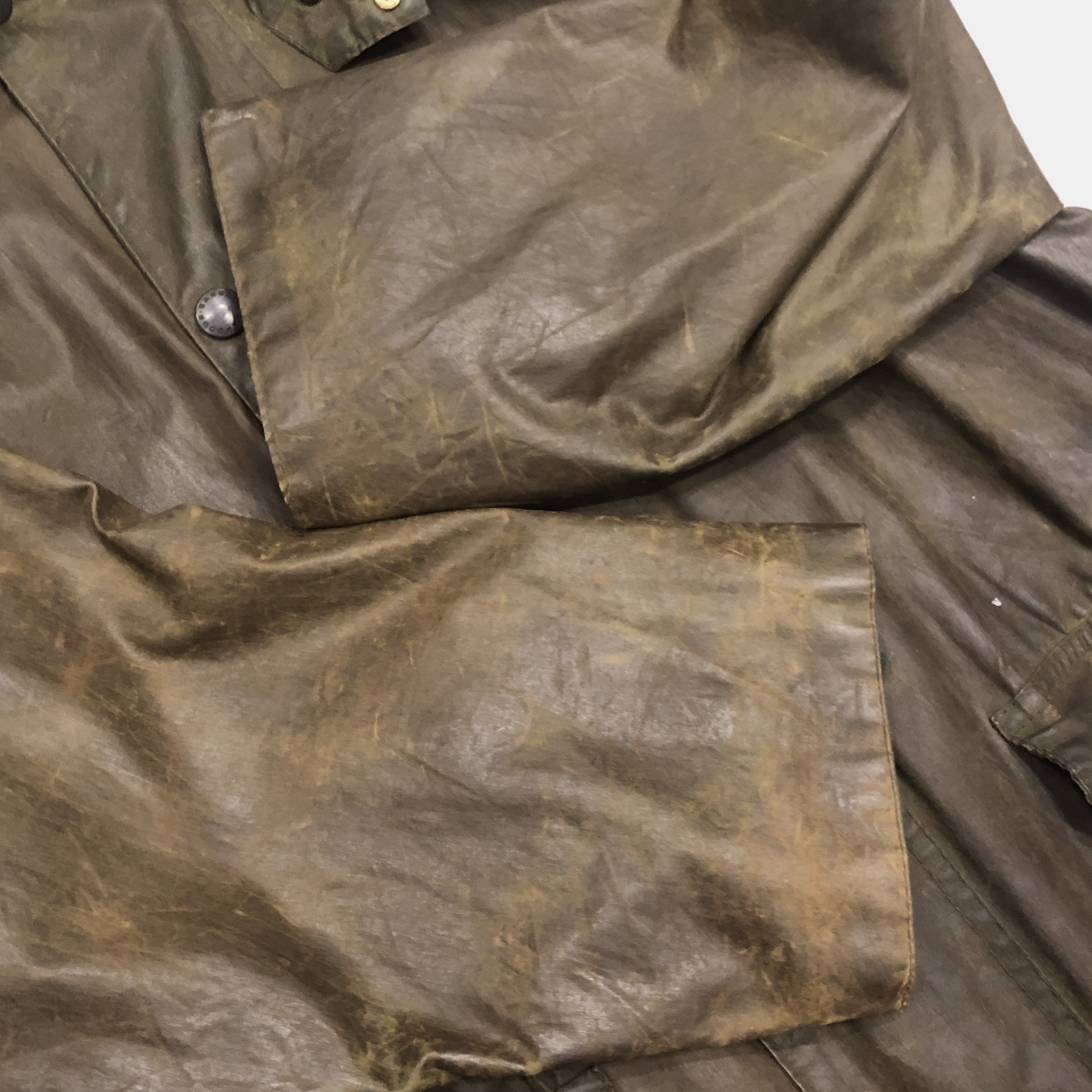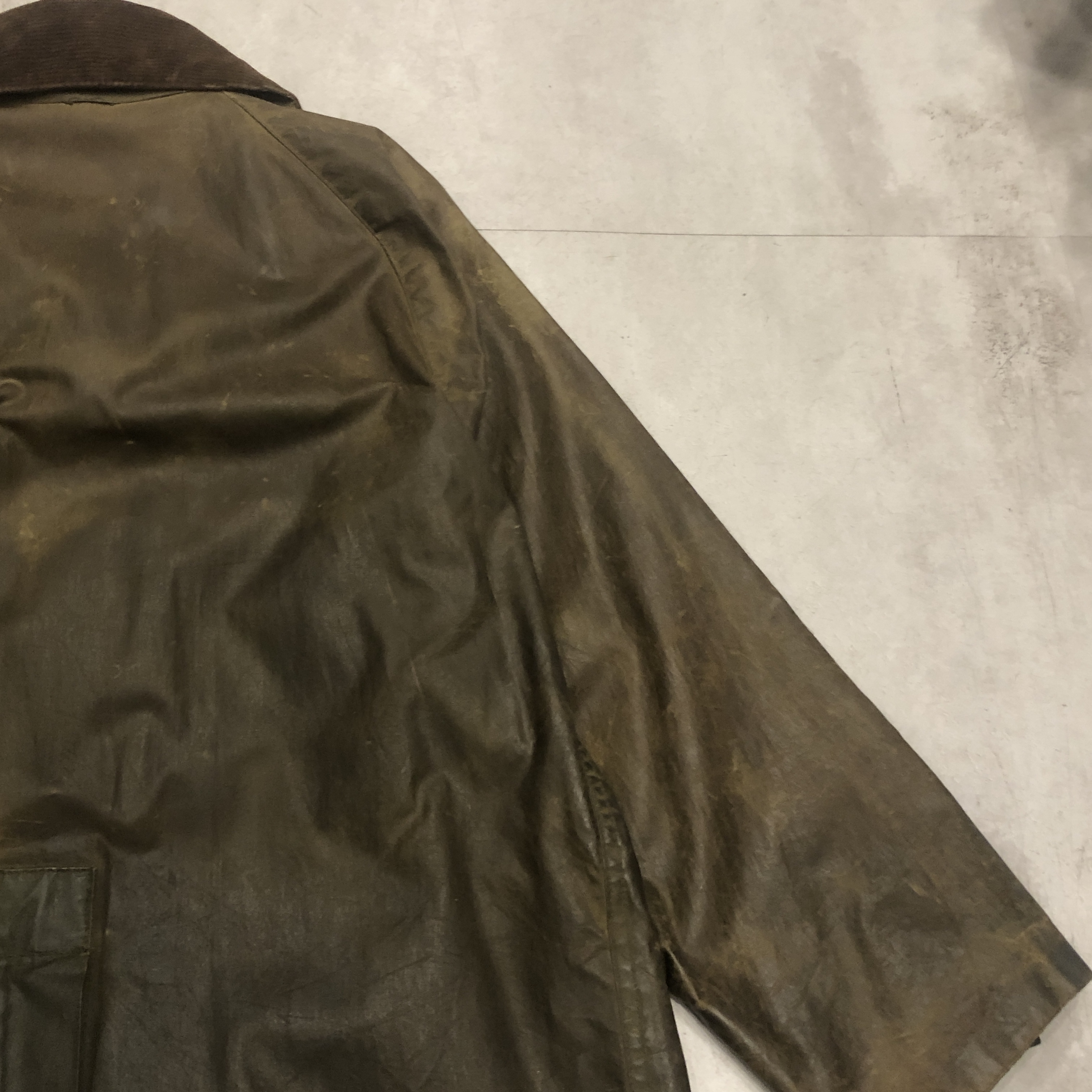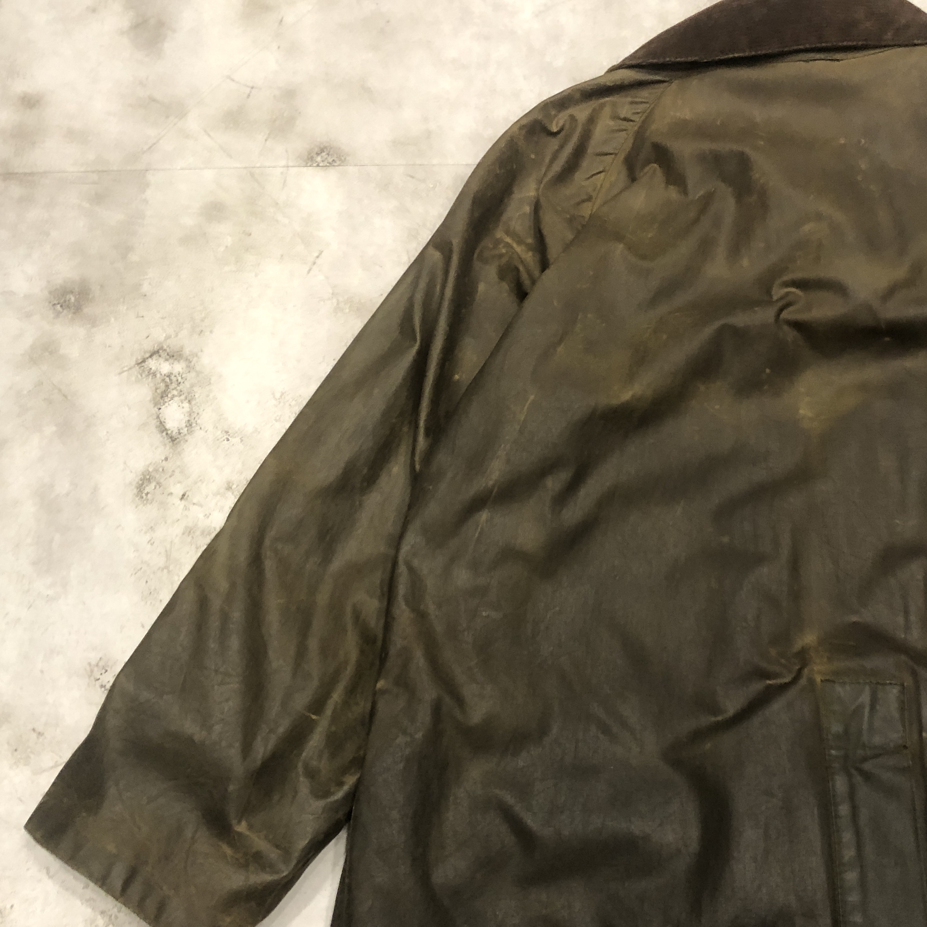 オリーブカラーは均一ではなく、時間と動きに応じて生まれた濃淡が重なり合い、まさに“育ったBarbour”という佇まいです。