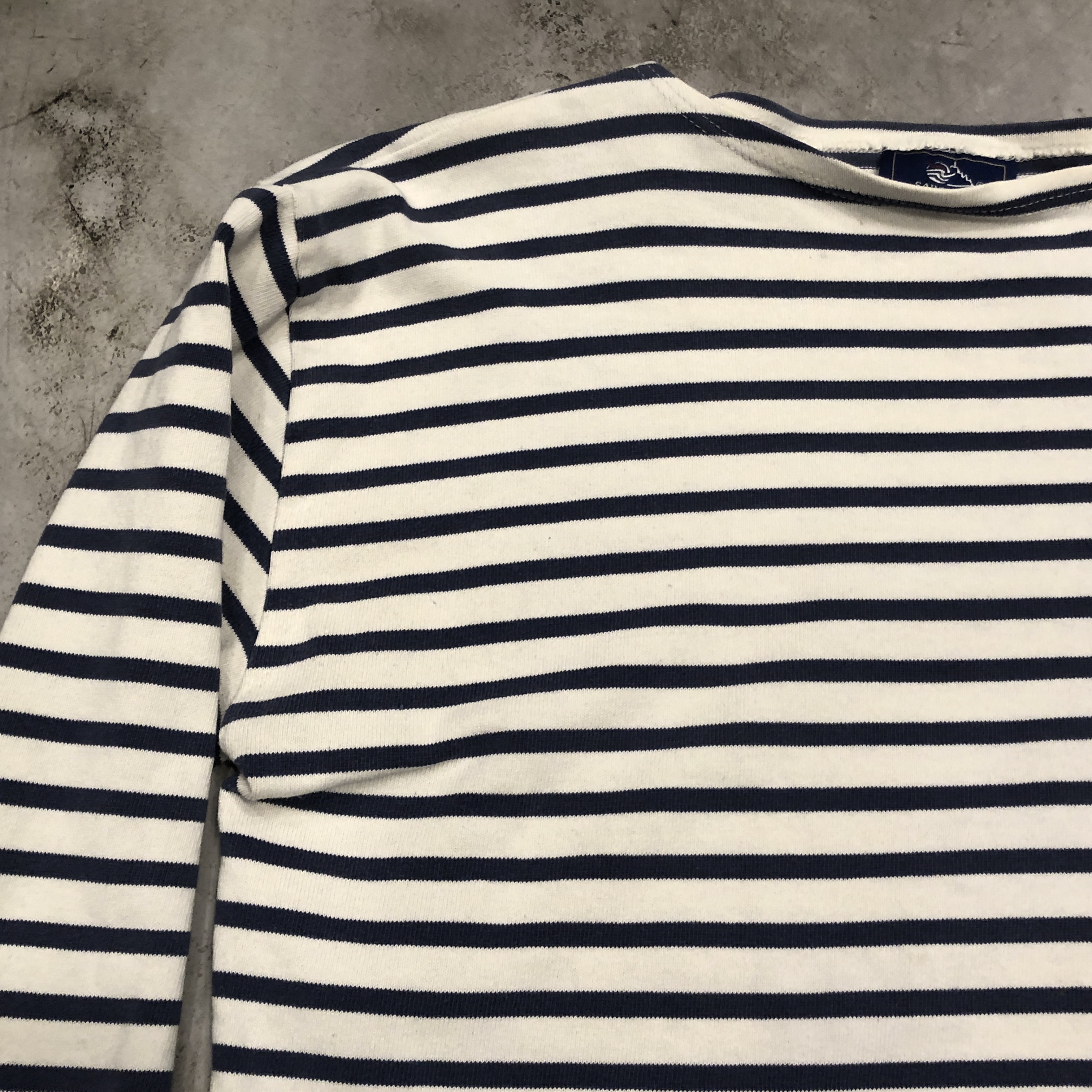 クラシックなボートネックと肩線の落ちたストレートなパターンは、重ね着にも最適。袖口にはブランドロゴのネームパッチを控えめに配置。製造はもちろんフランス自社工場で行われ、サイズはフランス表記6(国際サイズL)で、男女問わずゆとりあるシルエットを楽しめます。