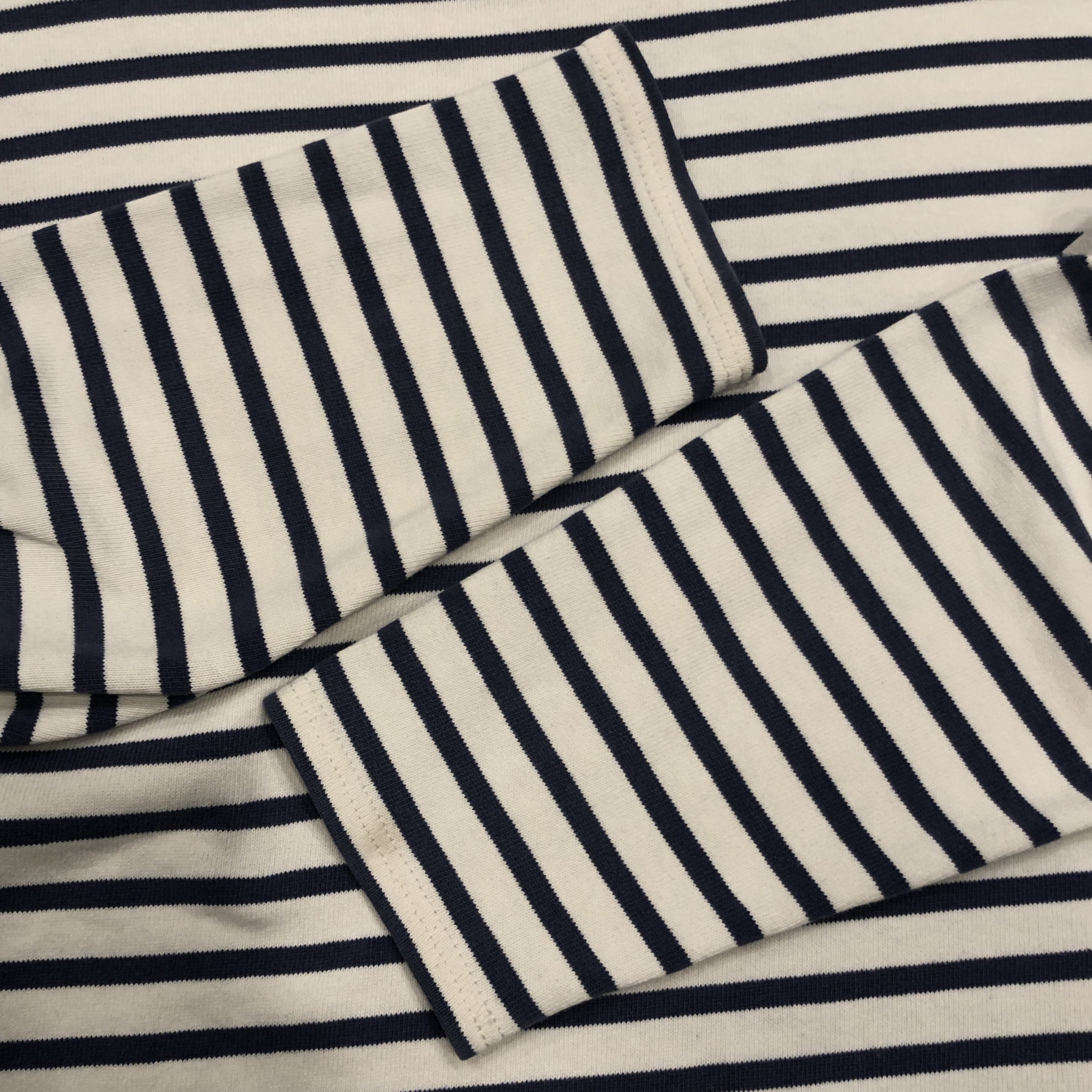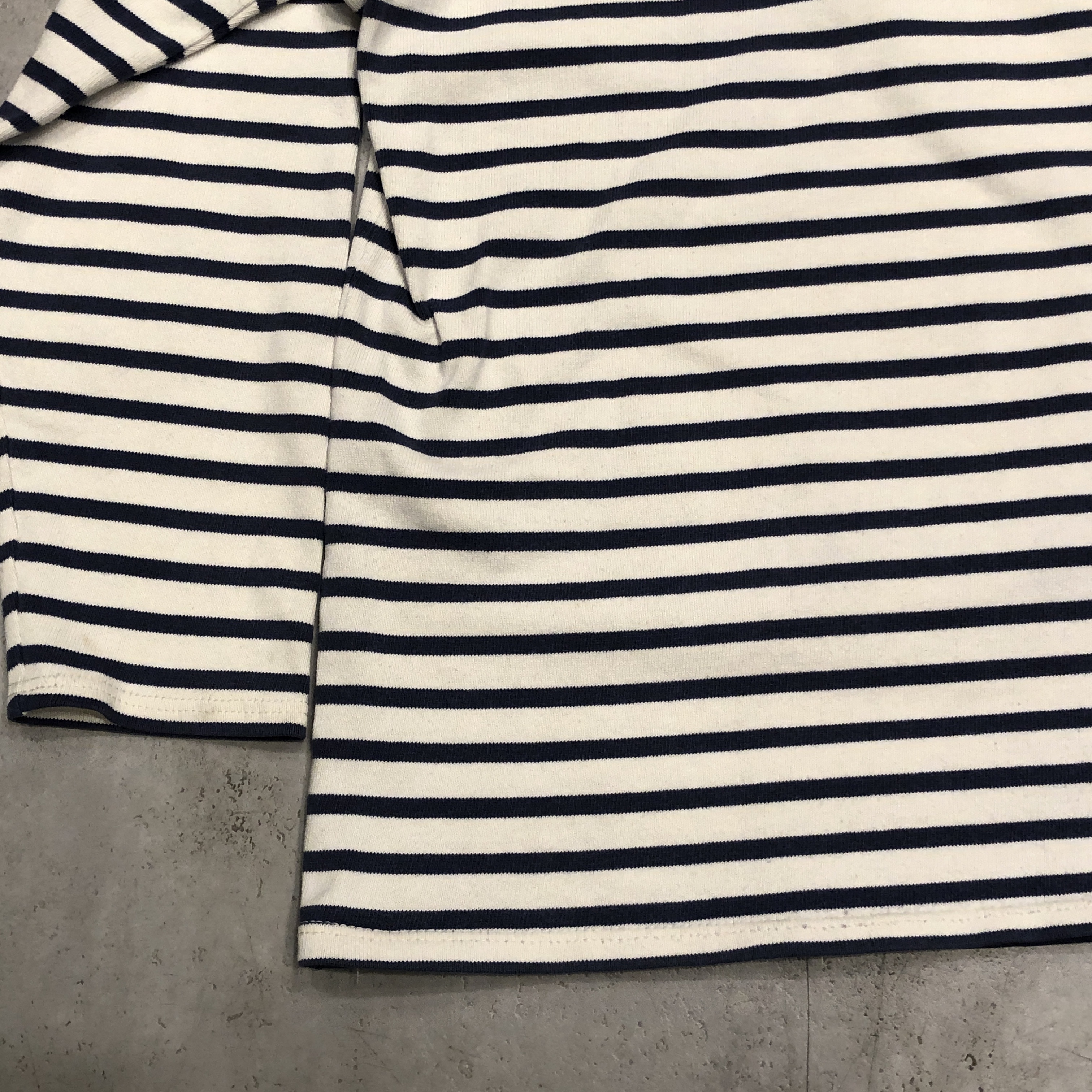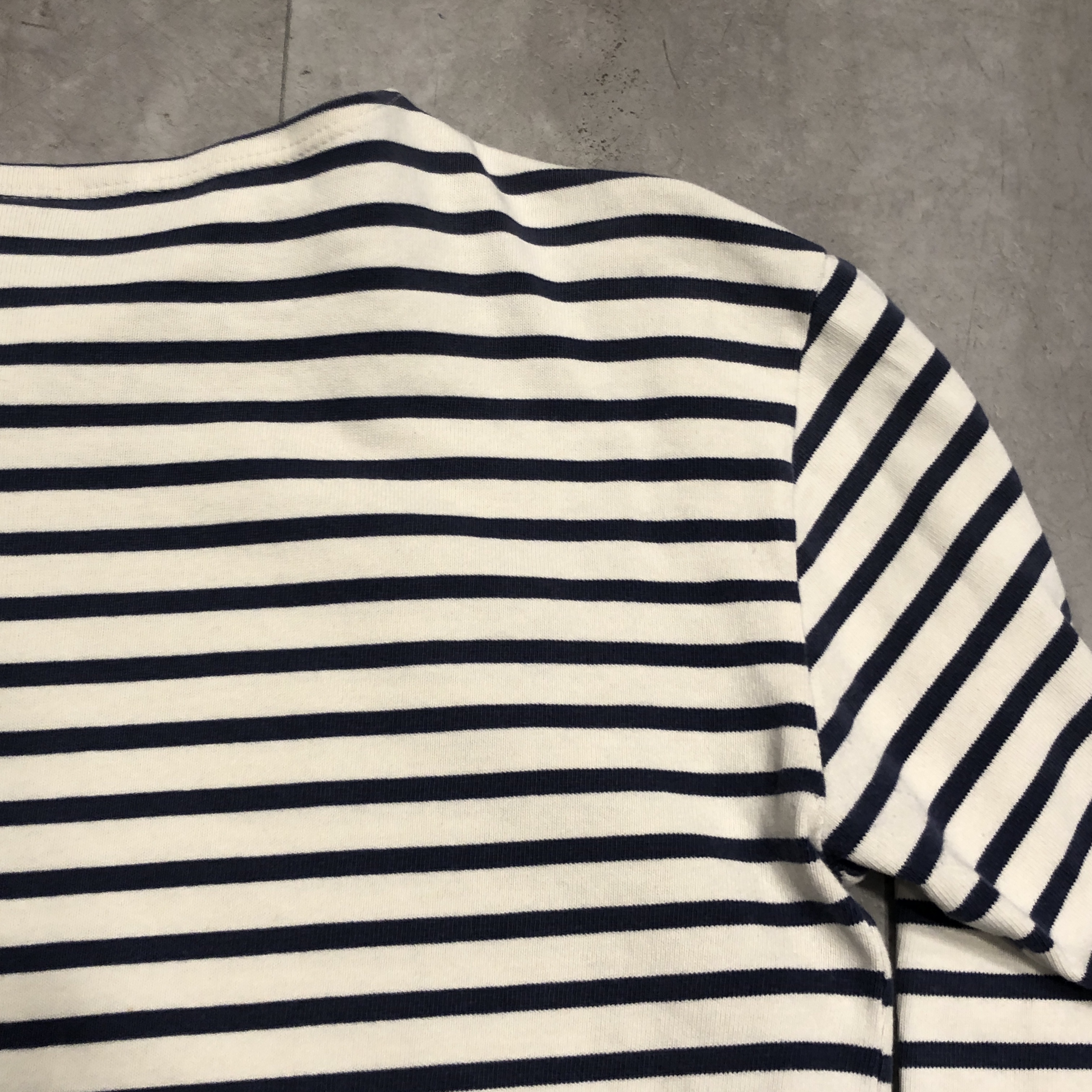今回ご紹介するのは永遠の定番、落ち着いたネイビー/ ホワイトのボーダーカラー。ミリタリーやワークスタイルにも馴染み、カジュアルからシックまで幅広く対応します。素材は100%コットンの目の詰まった天竺生地。着始めはしっかりとした張り感があり、洗い込むことで徐々に柔らかく、肌馴染みの良い風合いへと育っていきます。