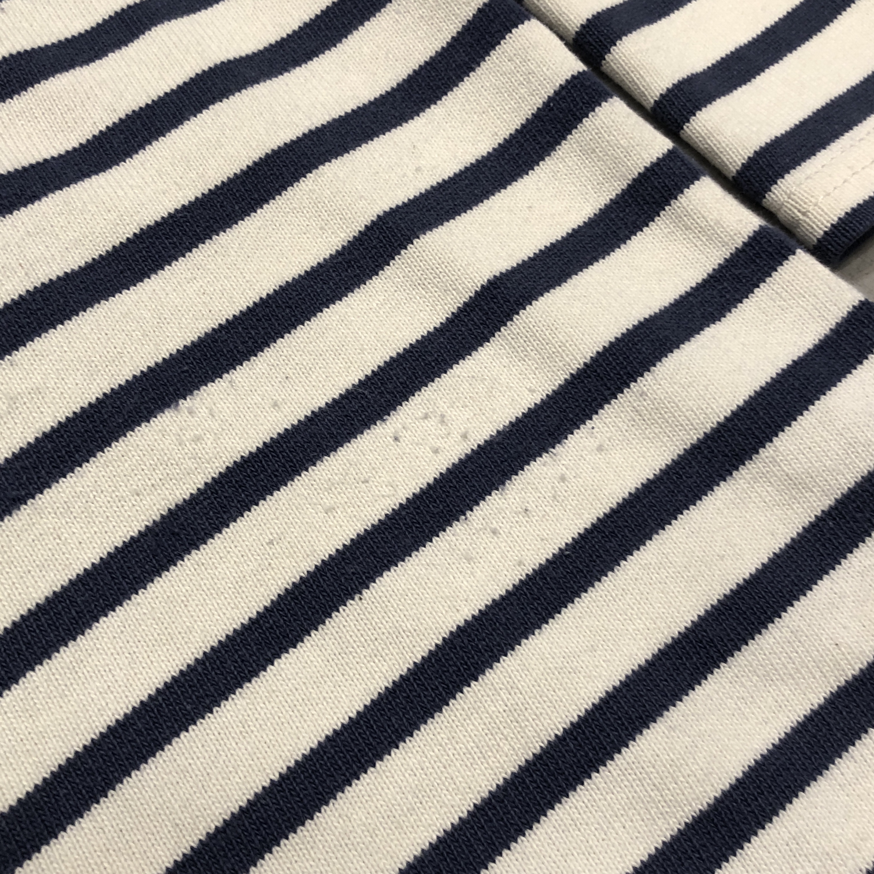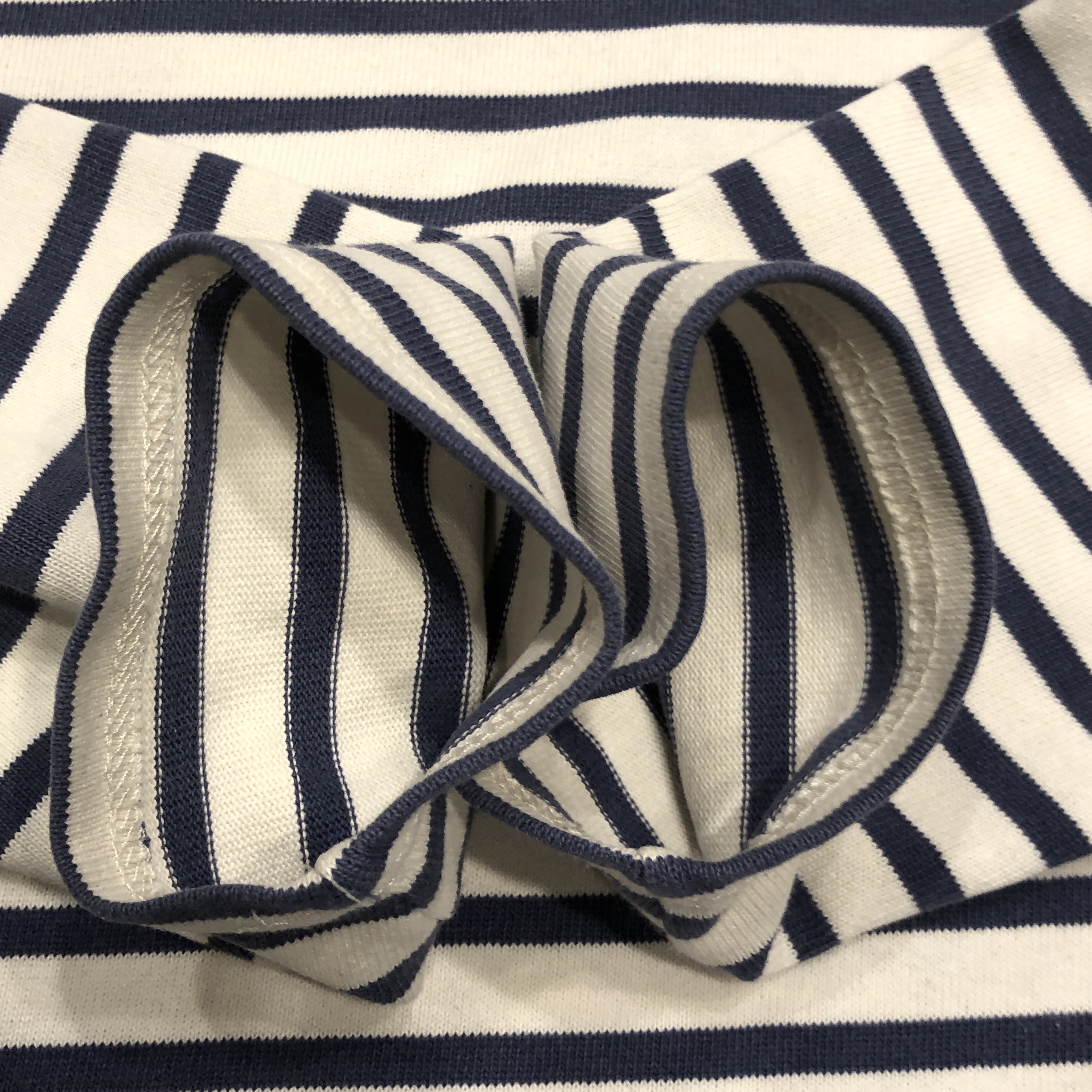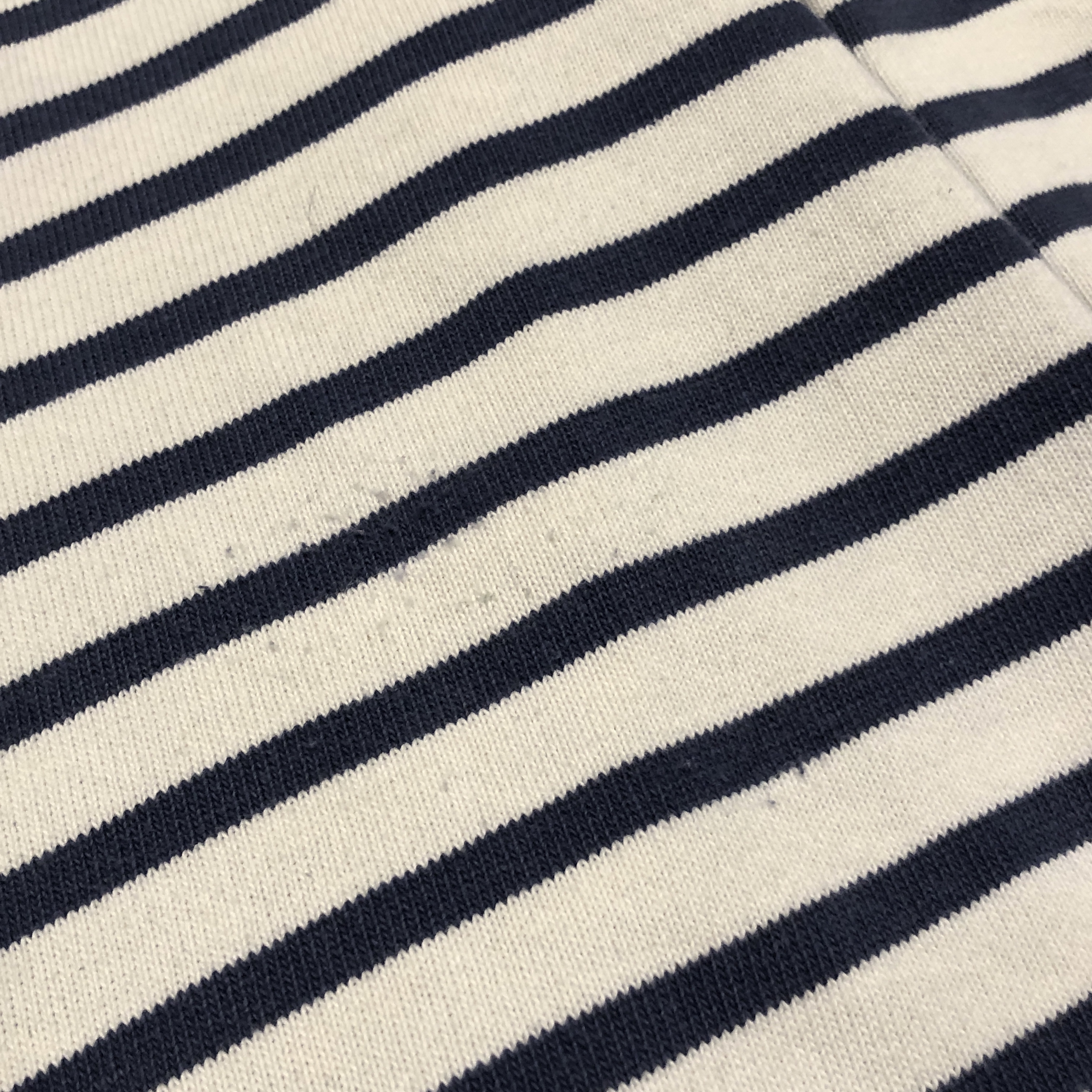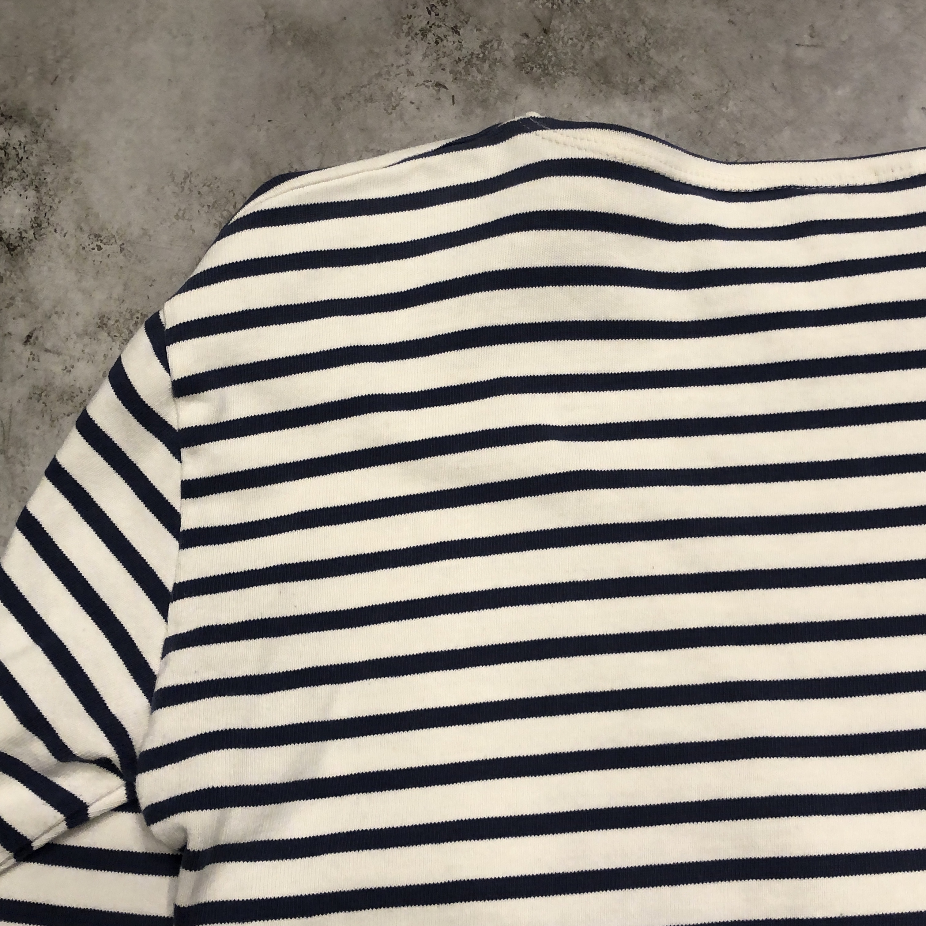 今回ご紹介するのは永遠の定番、落ち着いたネイビー/ ホワイトのボーダーカラー。ミリタリーやワークスタイルにも馴染み、カジュアルからシックまで幅広く対応します。素材は100%コットンの目の詰まった天竺生地。着始めはしっかりとした張り感があり、洗い込むことで徐々に柔らかく、肌馴染みの良い風合いへと育っていきます。