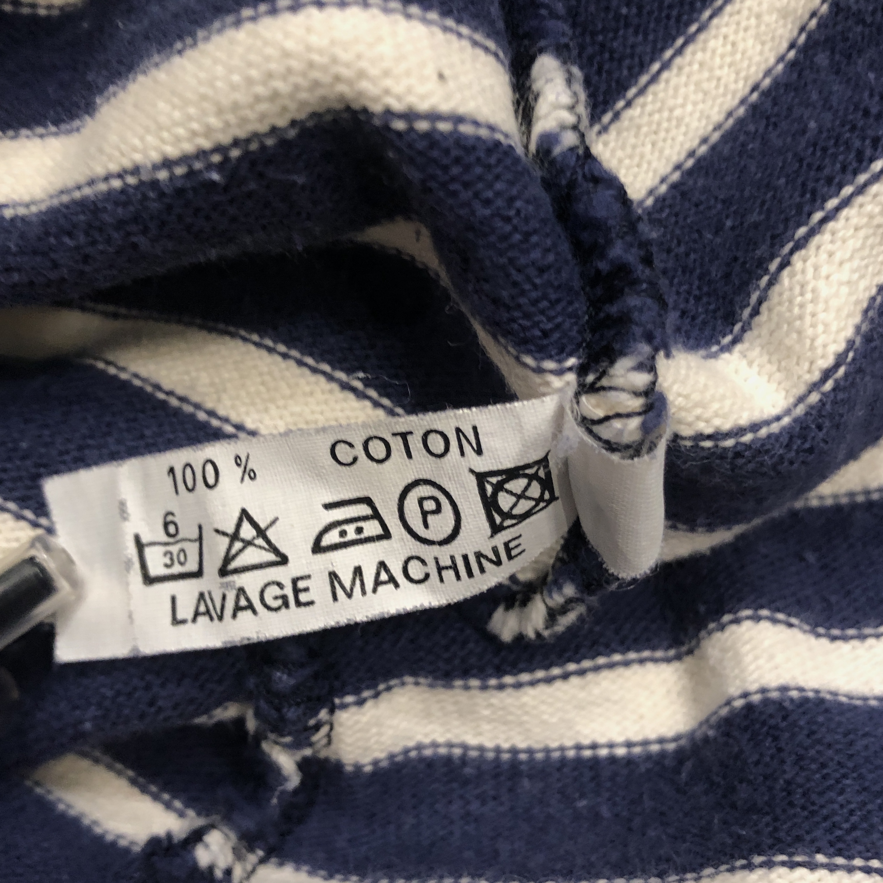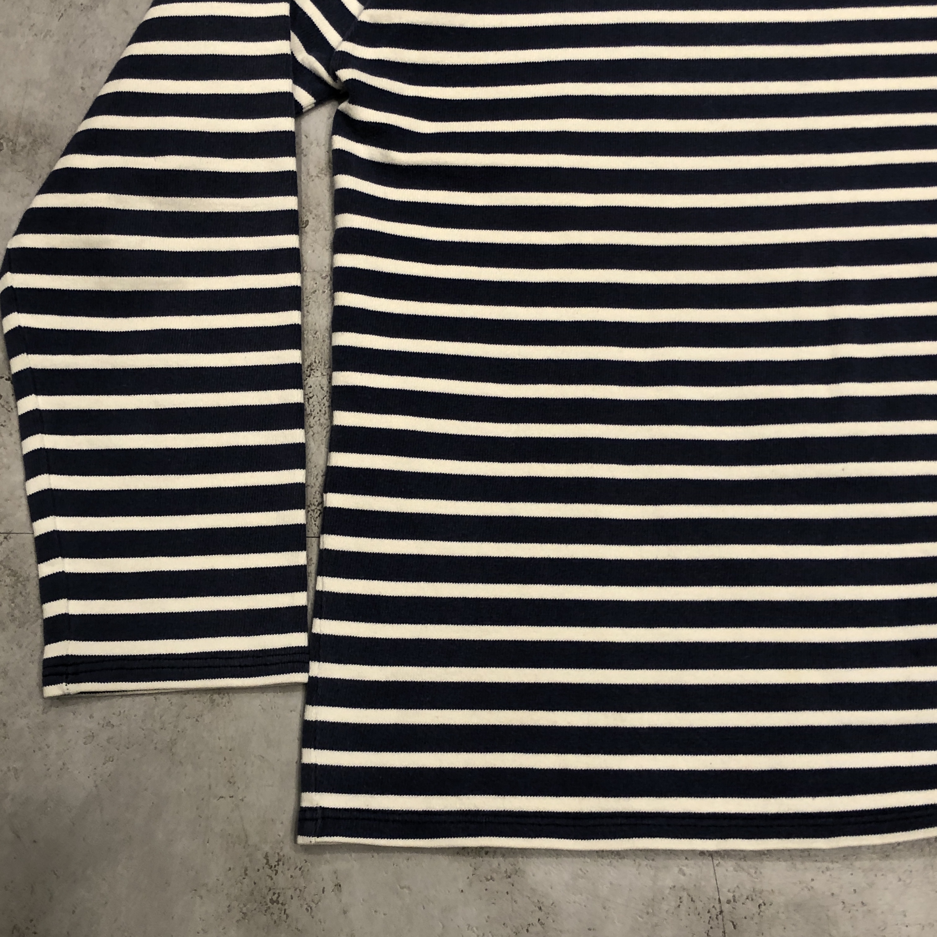 クラシックなボートネックと肩線の落ちたストレートなパターンは、重ね着にも最適。袖口にはブランドロゴのネームパッチを控えめに配置。製造はもちろんフランス自社工場で行われ、サイズはフランス表記5(国際サイズML)で、男女問わずゆとりあるシルエットを楽しめます。