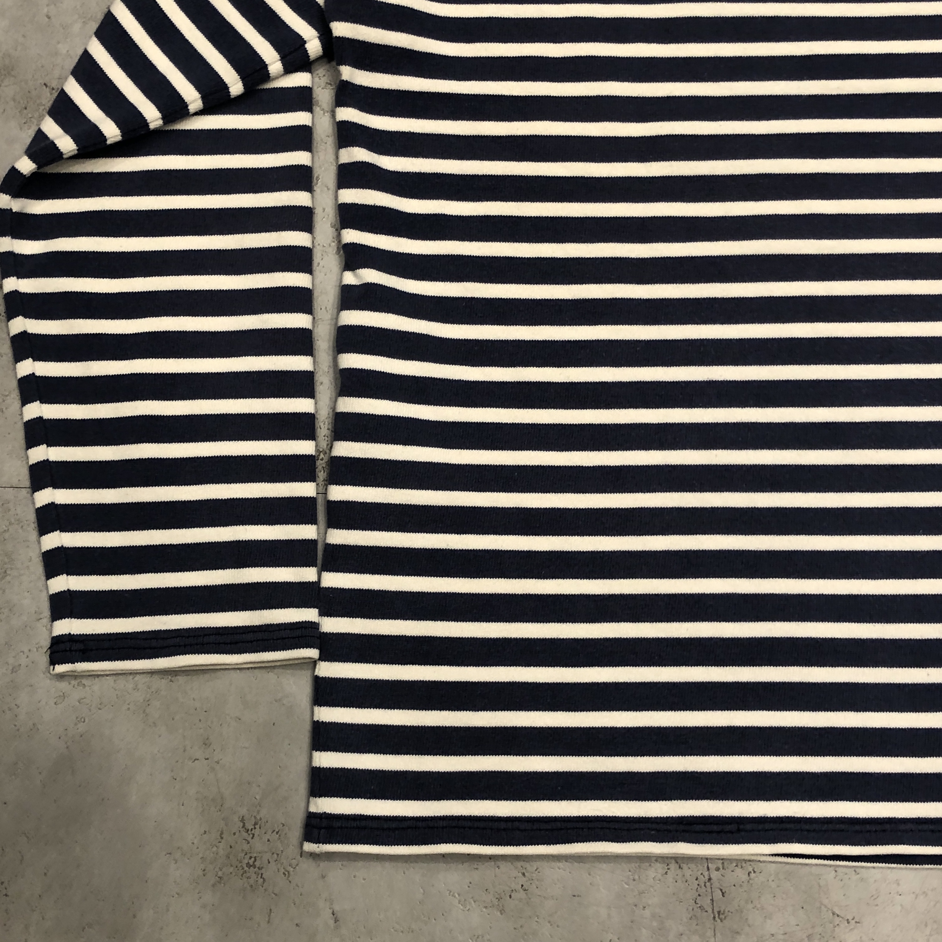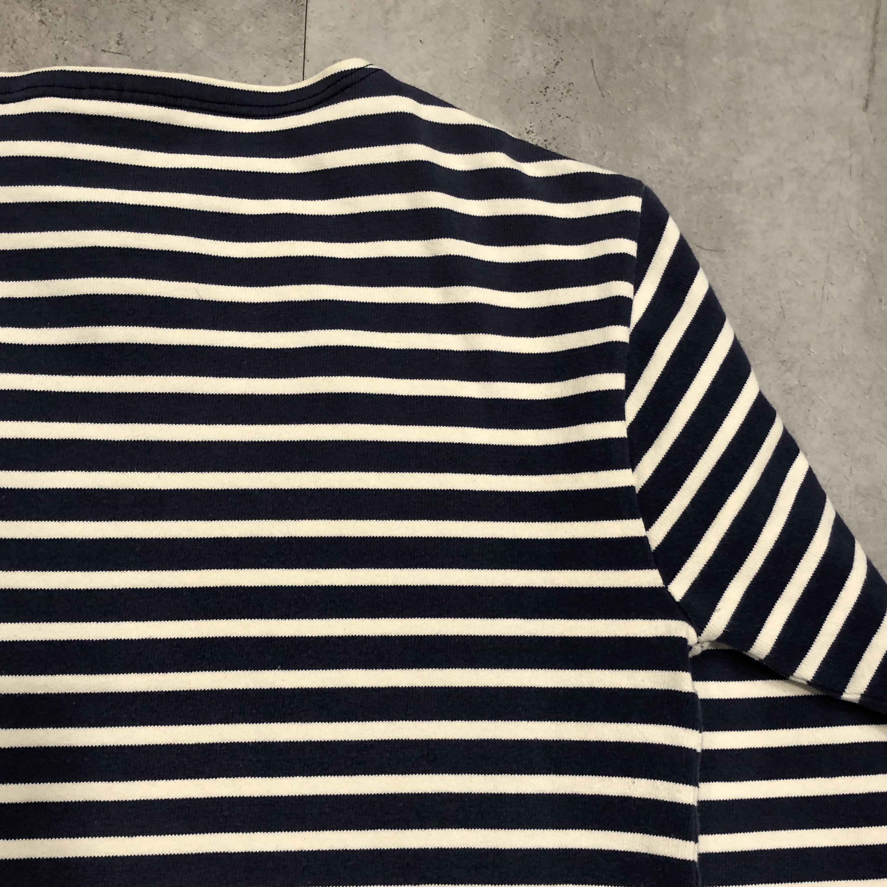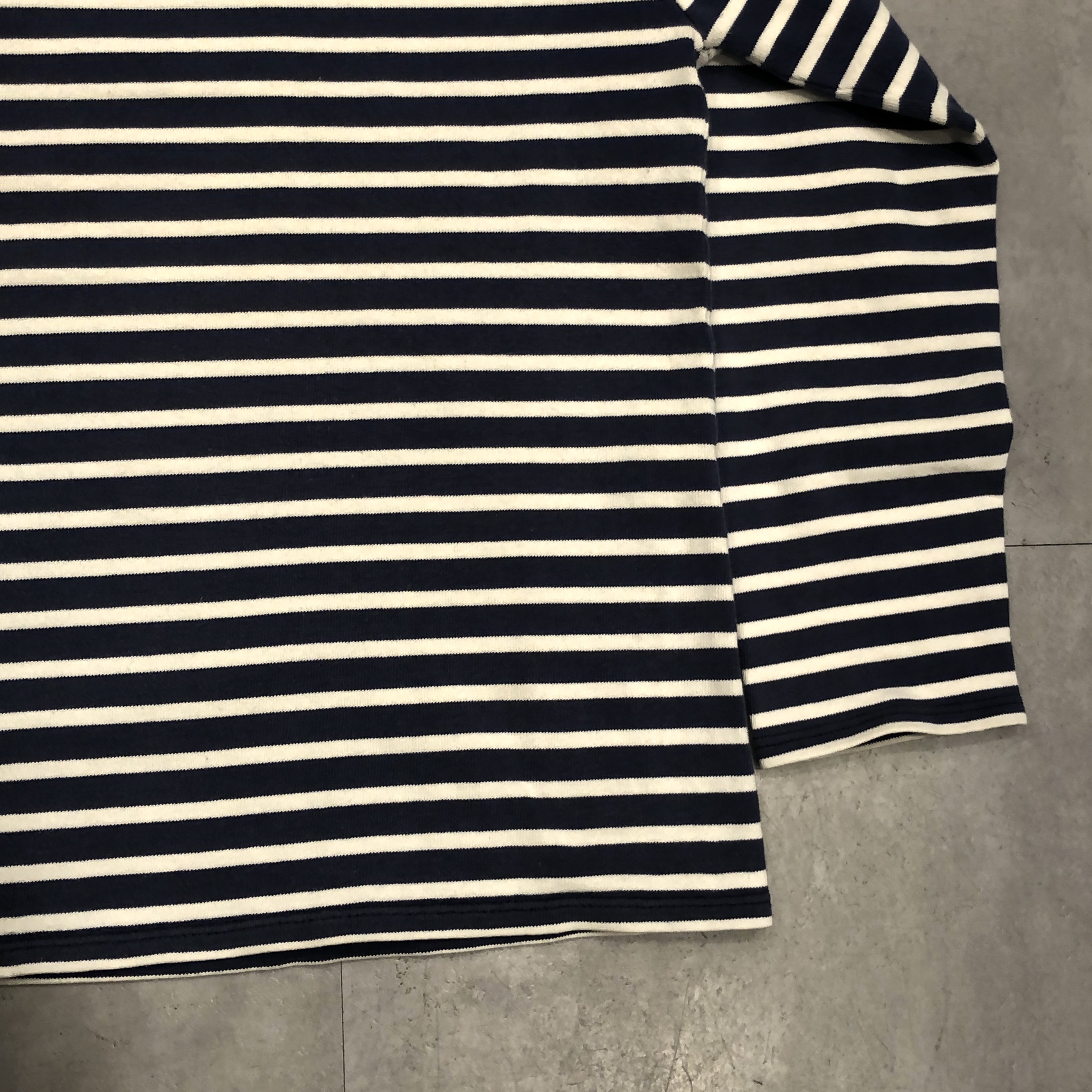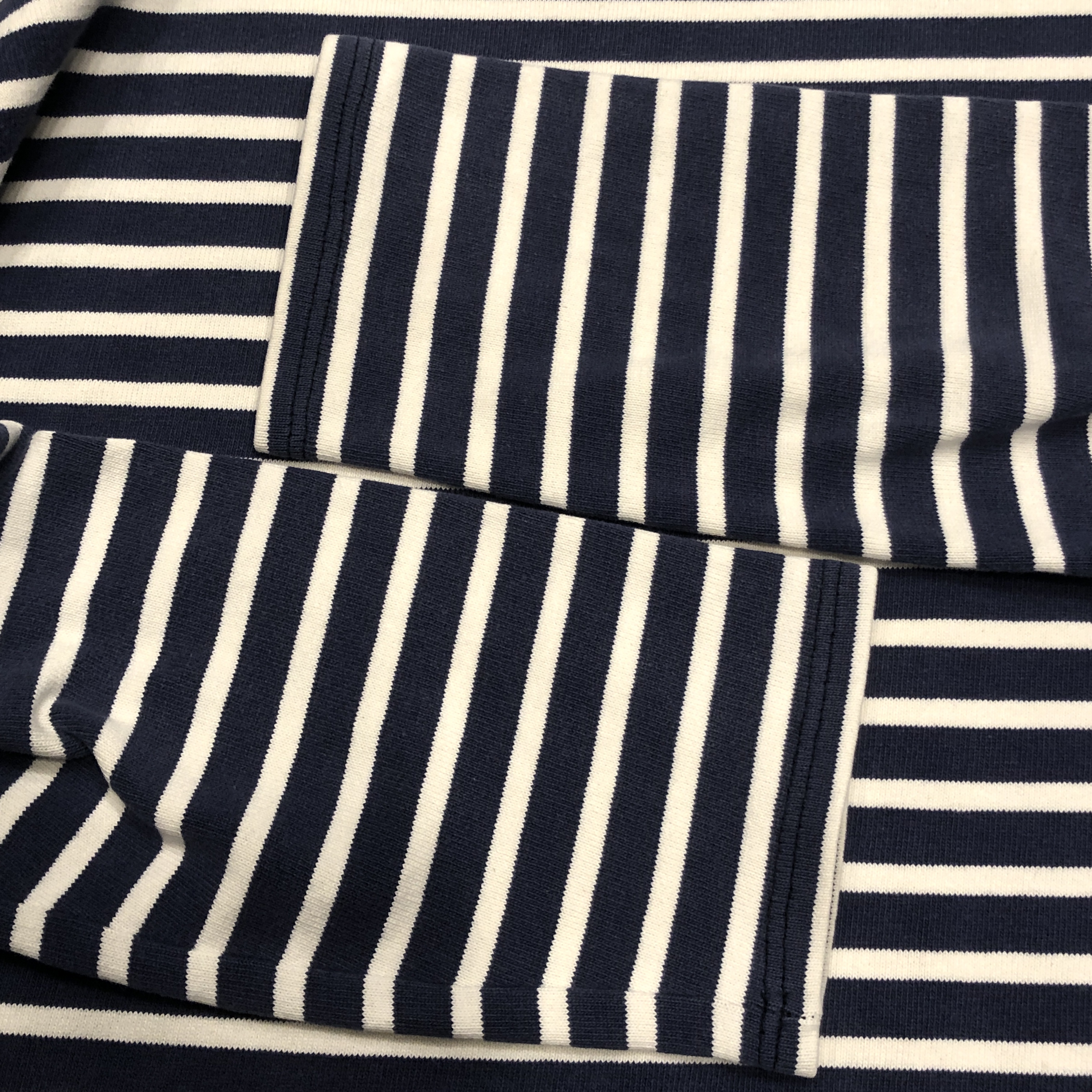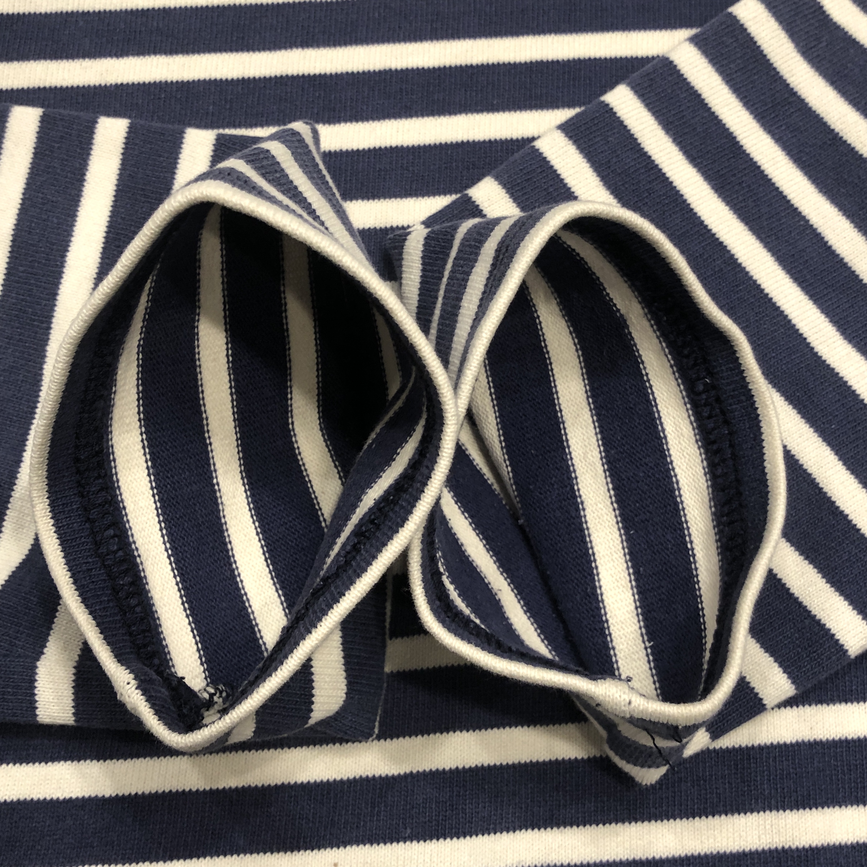 今回ご紹介するのは永遠の定番、落ち着いたネイビー/ ホワイトのボーダーカラー。ミリタリーやワークスタイルにも馴染み、カジュアルからシックまで幅広く対応します。素材は100%コットンの目の詰まった天竺生地。着始めはしっかりとした張り感があり、洗い込むことで徐々に柔らかく、肌馴染みの良い風合いへと育っていきます。