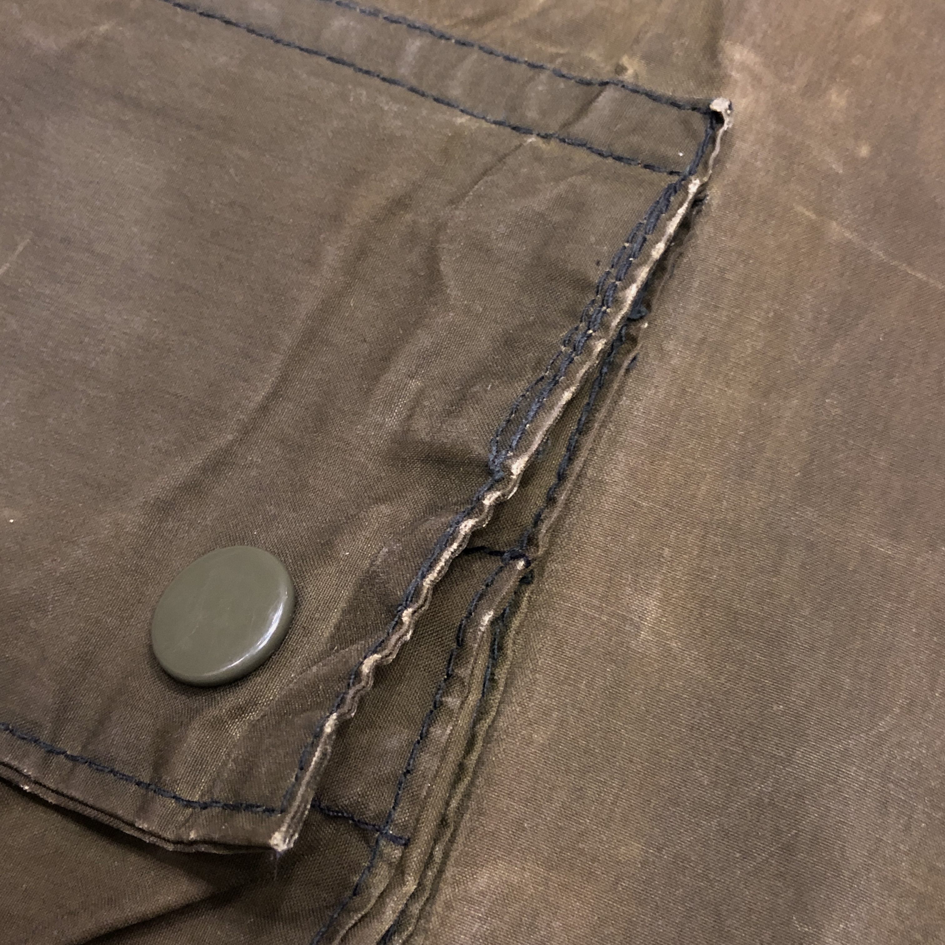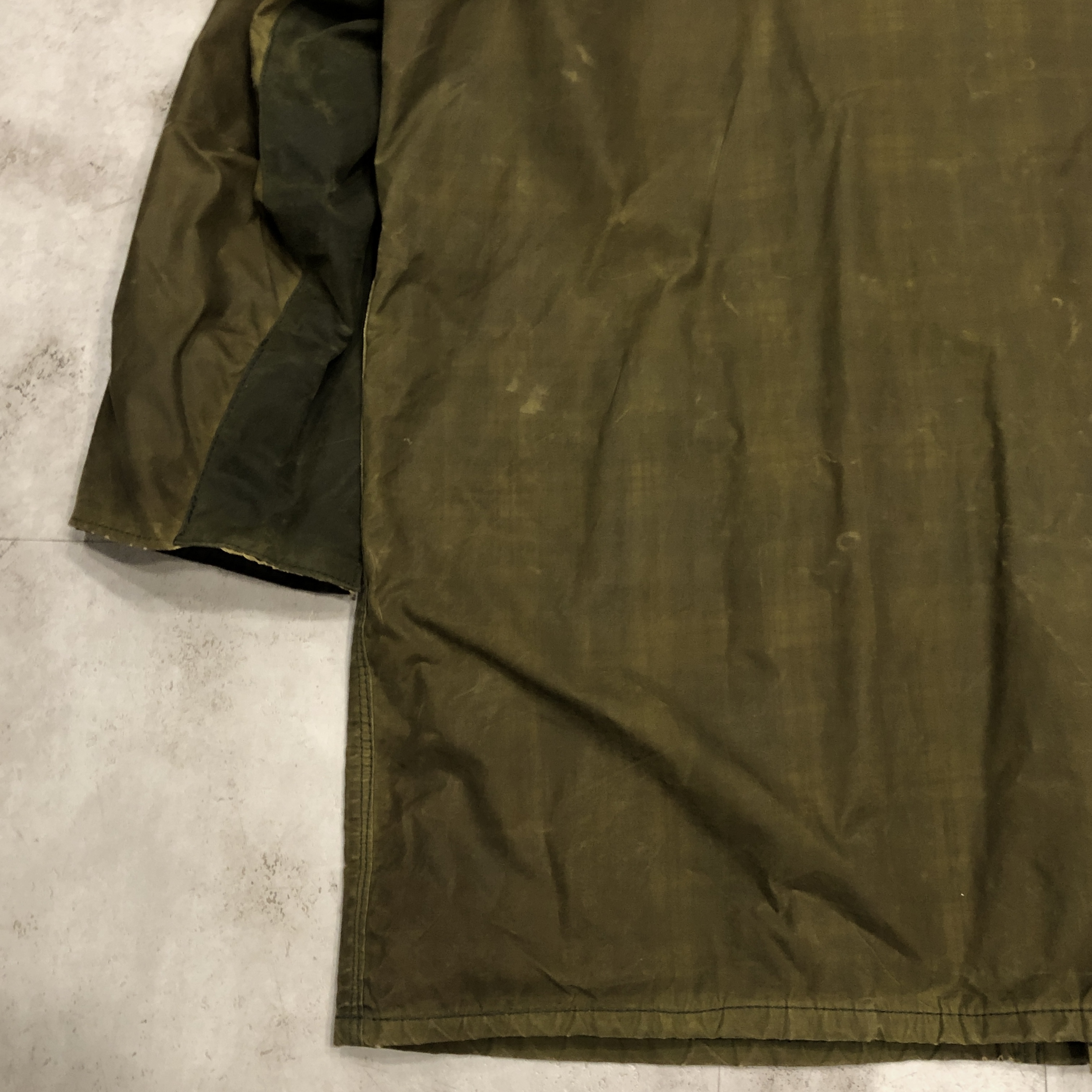 - 年代相応の着用感、生地特有のスレ、アタリ、1箇所スナップボタン表面の剥がれ、両腕のリペア跡、袖口と裾部分、ポケット縁のダメージ等がそれぞれ画像の様にございますが、古着慣れされている方でしたら問題なくお使いいただける範囲です。