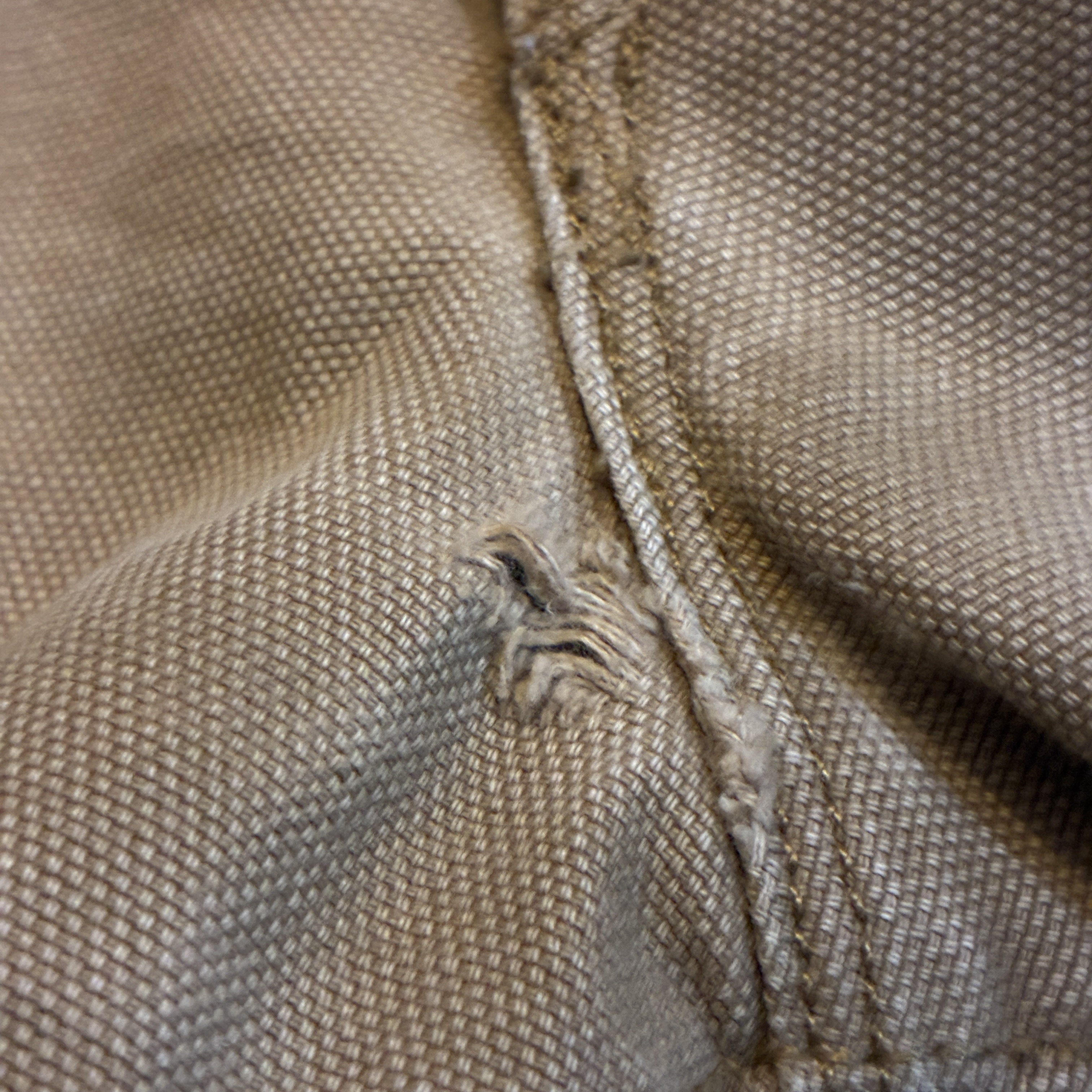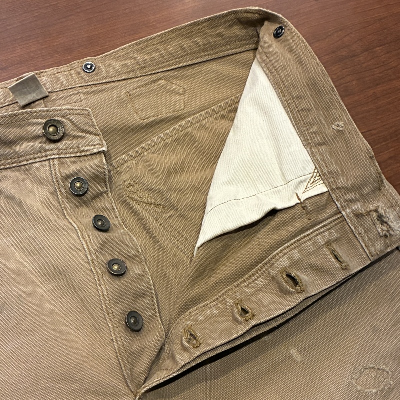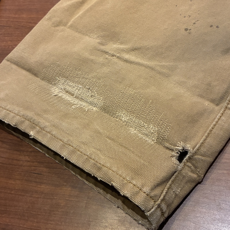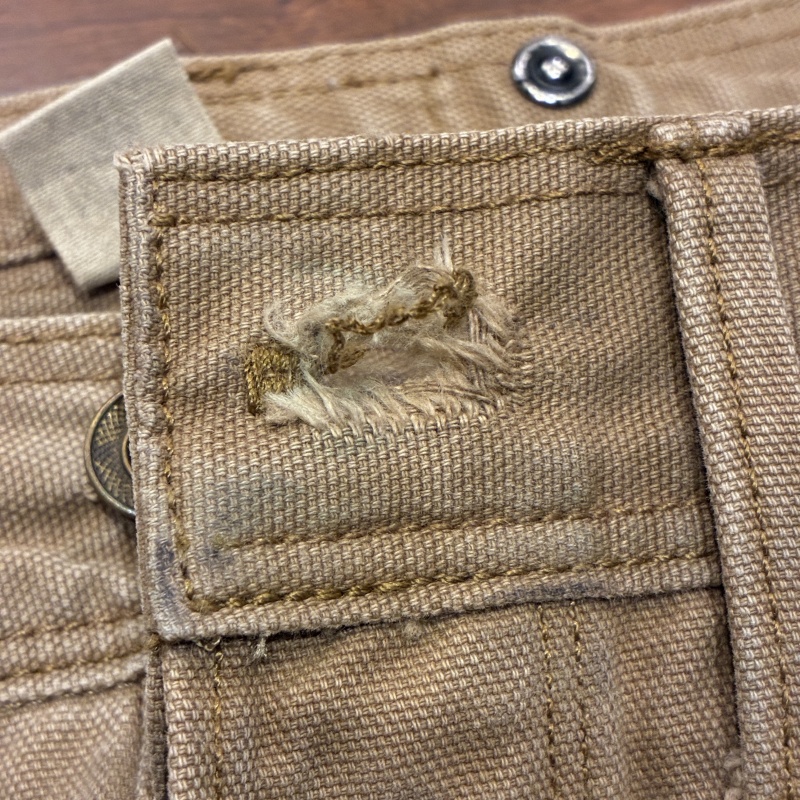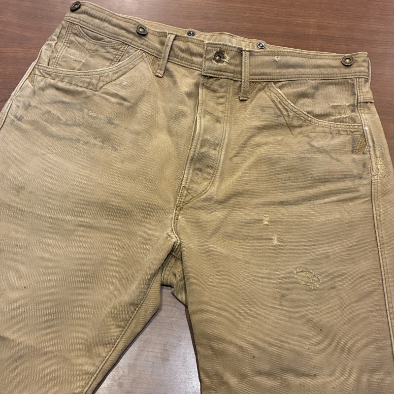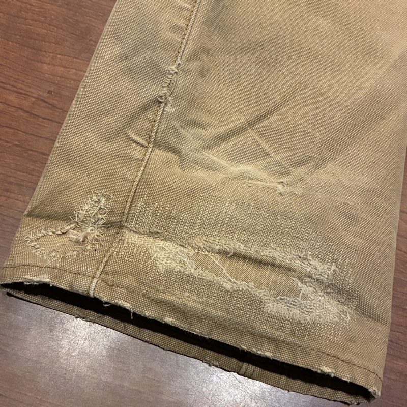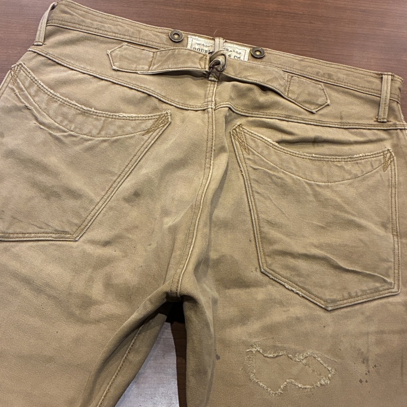 左ポケット付近にタタキリペア跡(画像6枚目)や股部分や裾に着用によるダメージがございます。