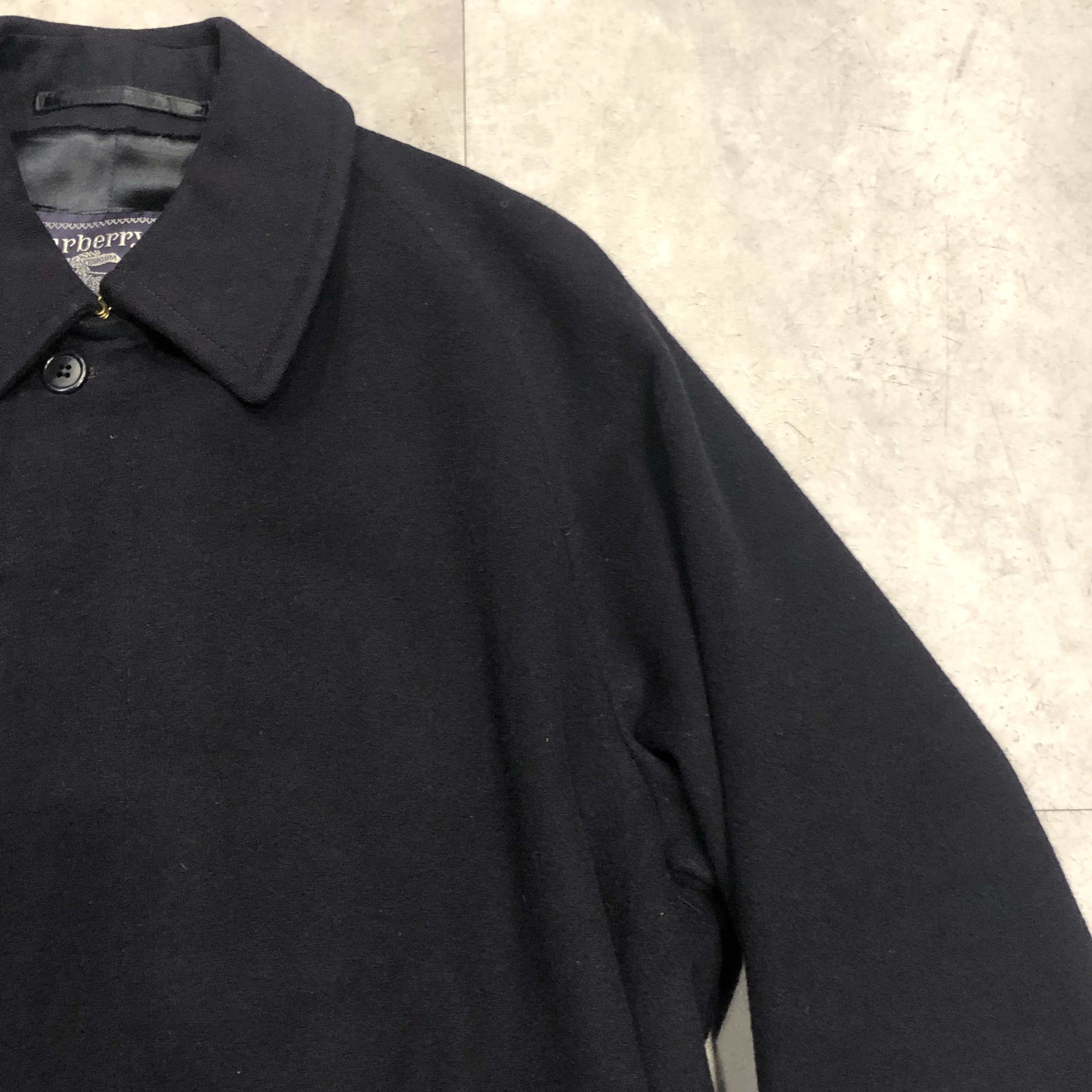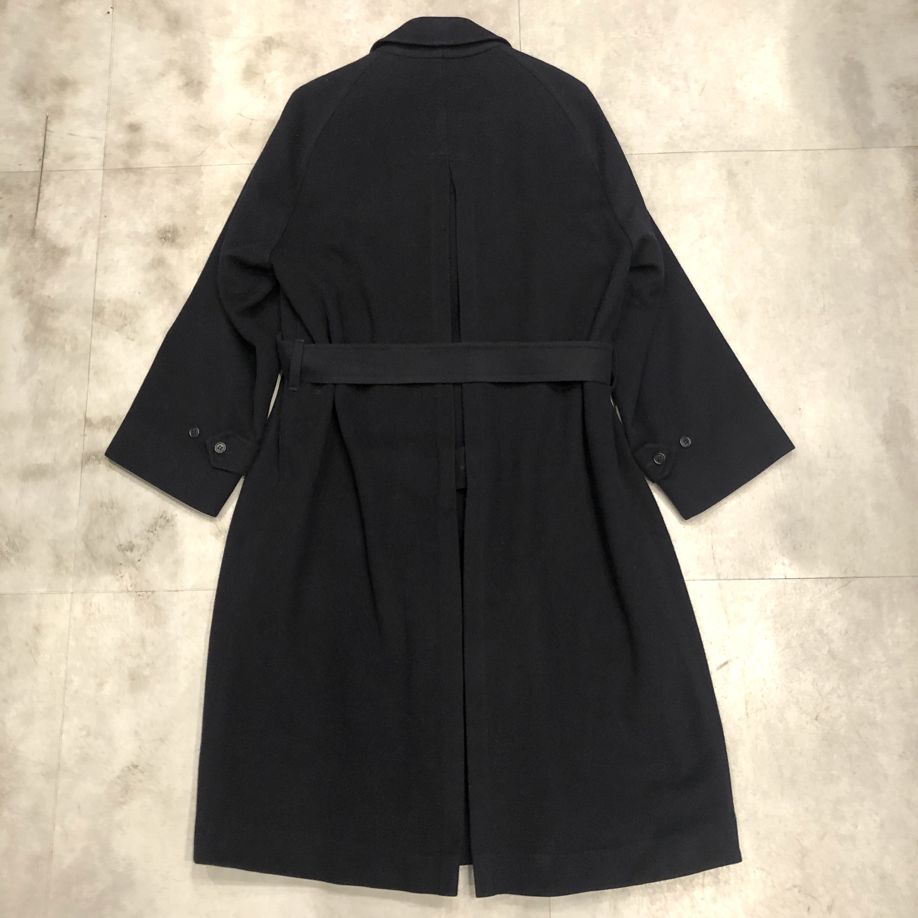 - 近年お探しの方が急増している1枚袖仕様のウールコートですが、その中でも“ただのウール”では終わらないのが当時のBurberrys。こちらはウール80%・アルパカ20%の“SPECIALITY LODEN”を贅沢に使用した一枚袖のスペシャルモデル。見た瞬間にわかるあの独特の起毛感、アルパカ混ならではの柔らかさと軽さが共存した極上の生地感で、Burberrys特有の発色と織りの妙を感じます。内側を覗けば総裏はお馴染みのチェック柄、脱いだ時にこそ映える“裏の色気”も完備。シルエットはもちろん一枚袖のAラインで、肩は落ち、裾に向かってふわりと広がる最高にエレガントなフォルム。付属のベルトでぎゅっと縛ればまるでタイロッケンのようにも着られ、無造作に垂らしてラフに羽織るだけでも絵になる万能さ。デニムや軍パンはもちろん、スラックスの上からさらっと羽織るだけで“出来る大人”の雰囲気に仕上げてくれます。サイズ表記は46 RL、ゴールデンサイズと言って差し支えない抜群のバランス。このあたりの希少個体は年々海外流出が進んでおり、今後さらに入手困難になることは間違いありませんので、ピンときた方はぜひこの機会に。