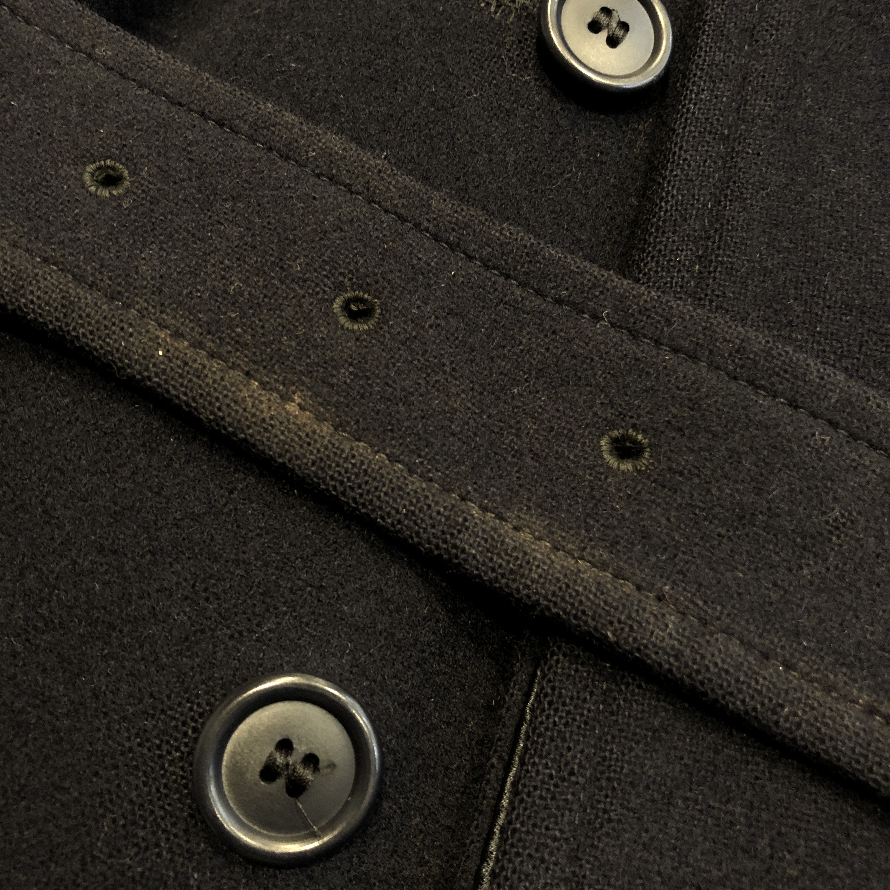 - 年代相応の着用感、生地の摩耗、ボタン横のダメージ、ボタンのダメージ、バックルレザー部分の剥げ、ベルトの薄汚れ、袖口のほんの小さなダメージ等が画像の様にございますが、古着慣れされている方でしたら問題なくお使いいただける範囲です。